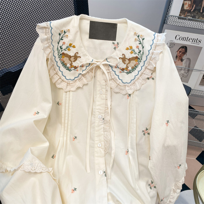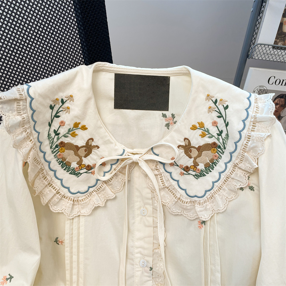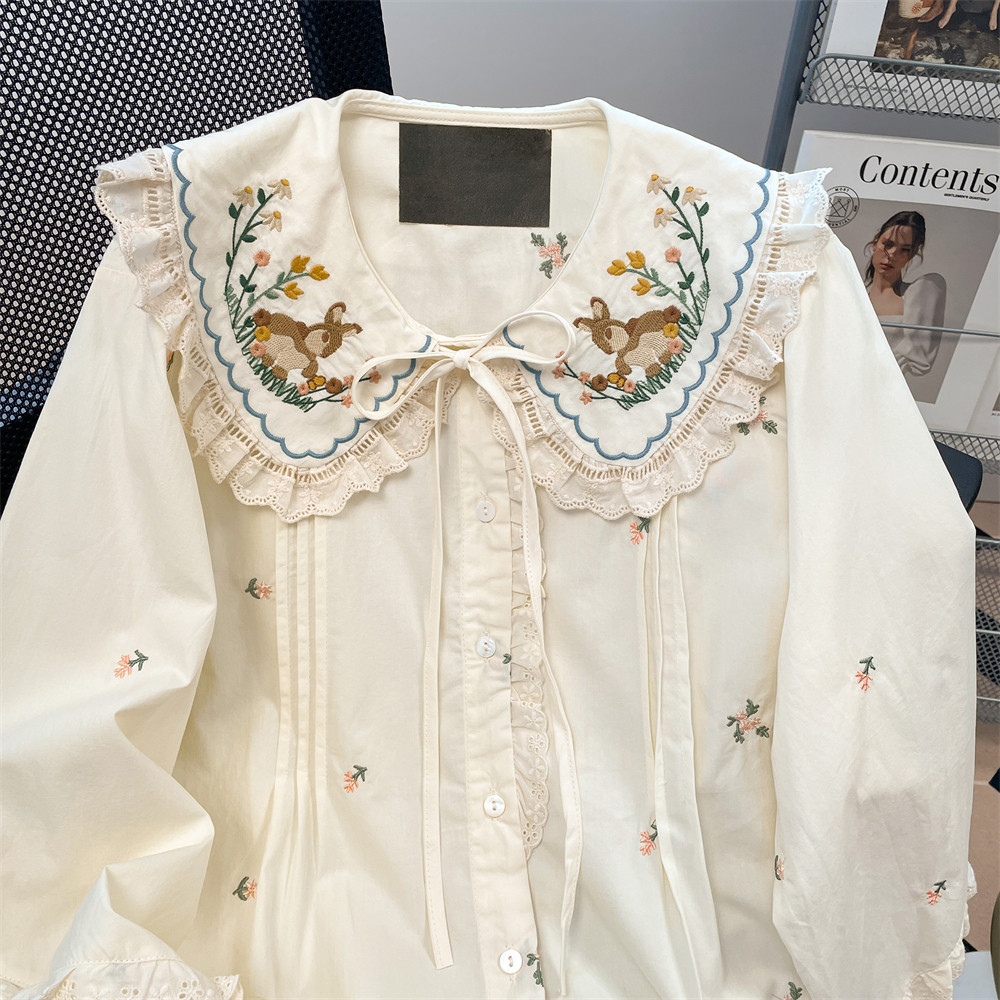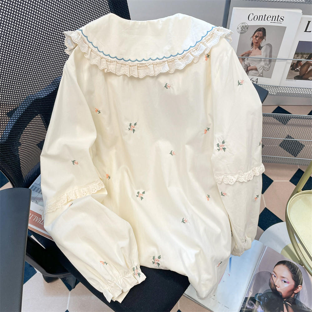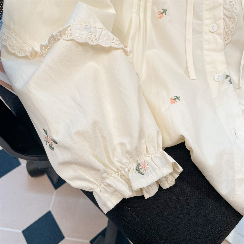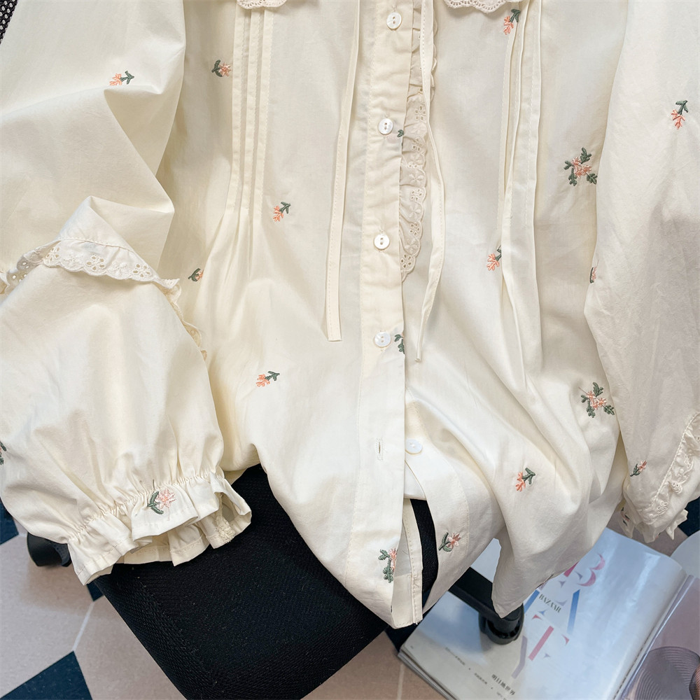 法式獨特漂亮碎花刺綉娃娃領襯衫女秋冬洋氣甜美內搭曡穿長袖上衣