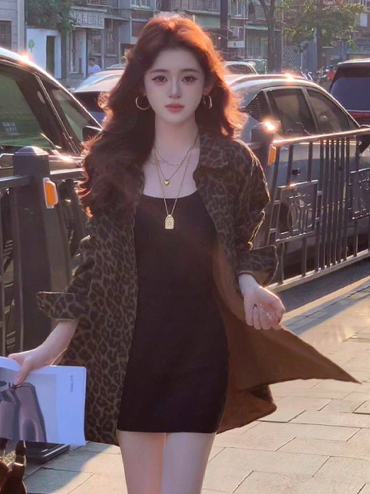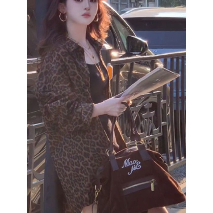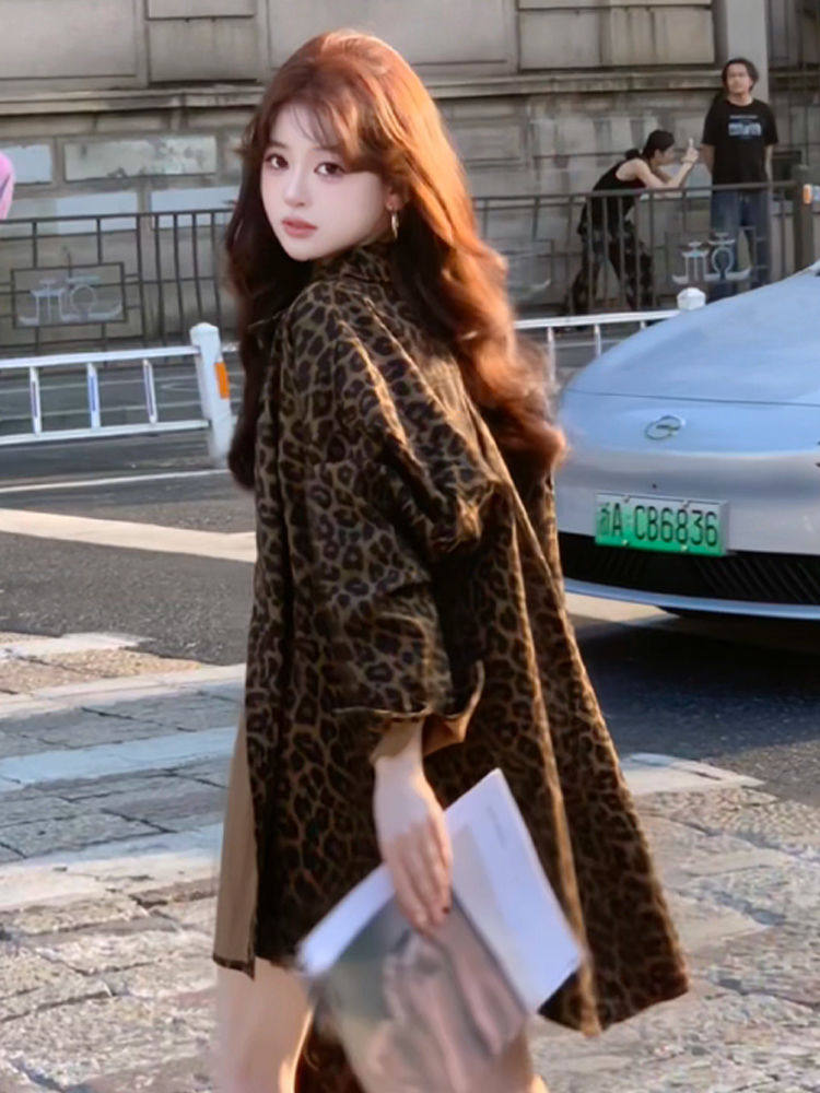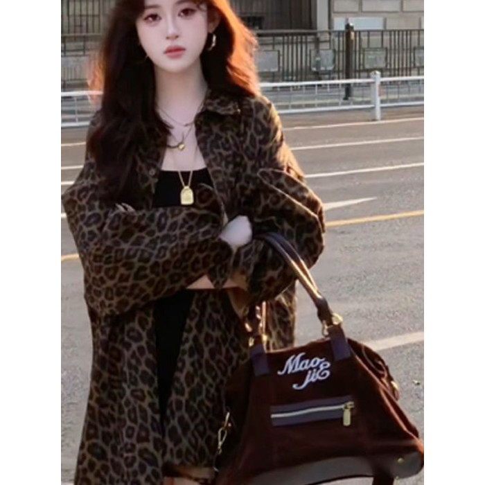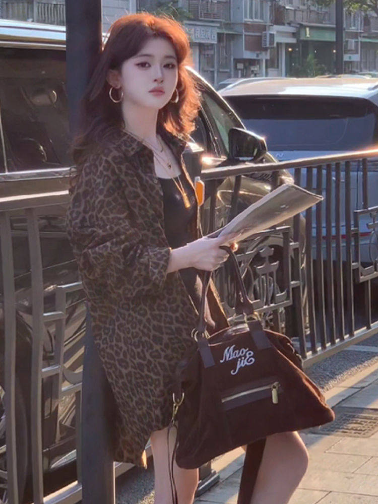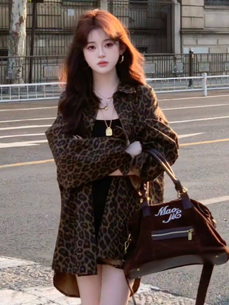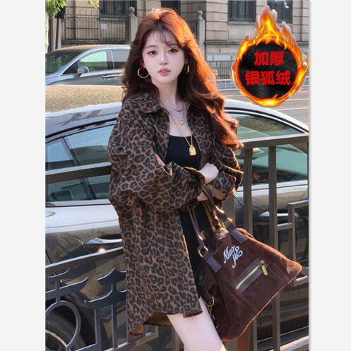 港風復古豹紋牛仔襯衫外套女秋冬新款美式寬鬆中長款開衫加絨上衣