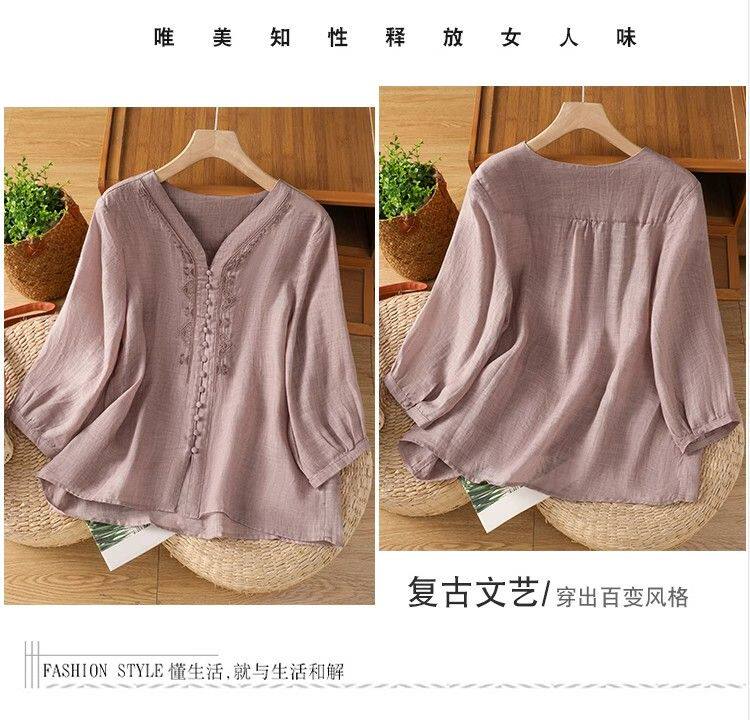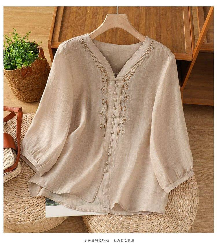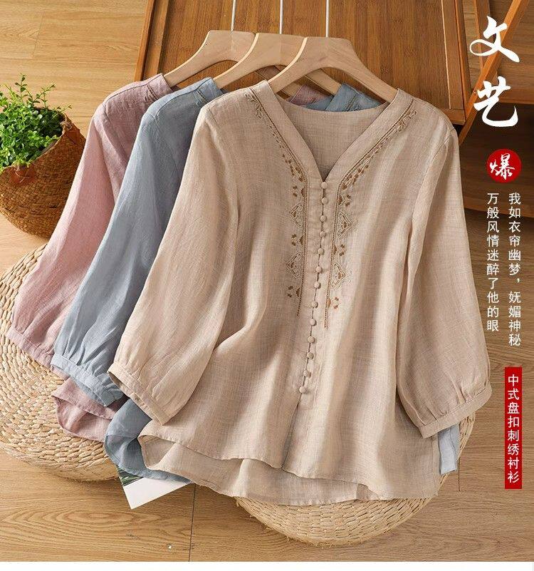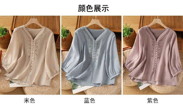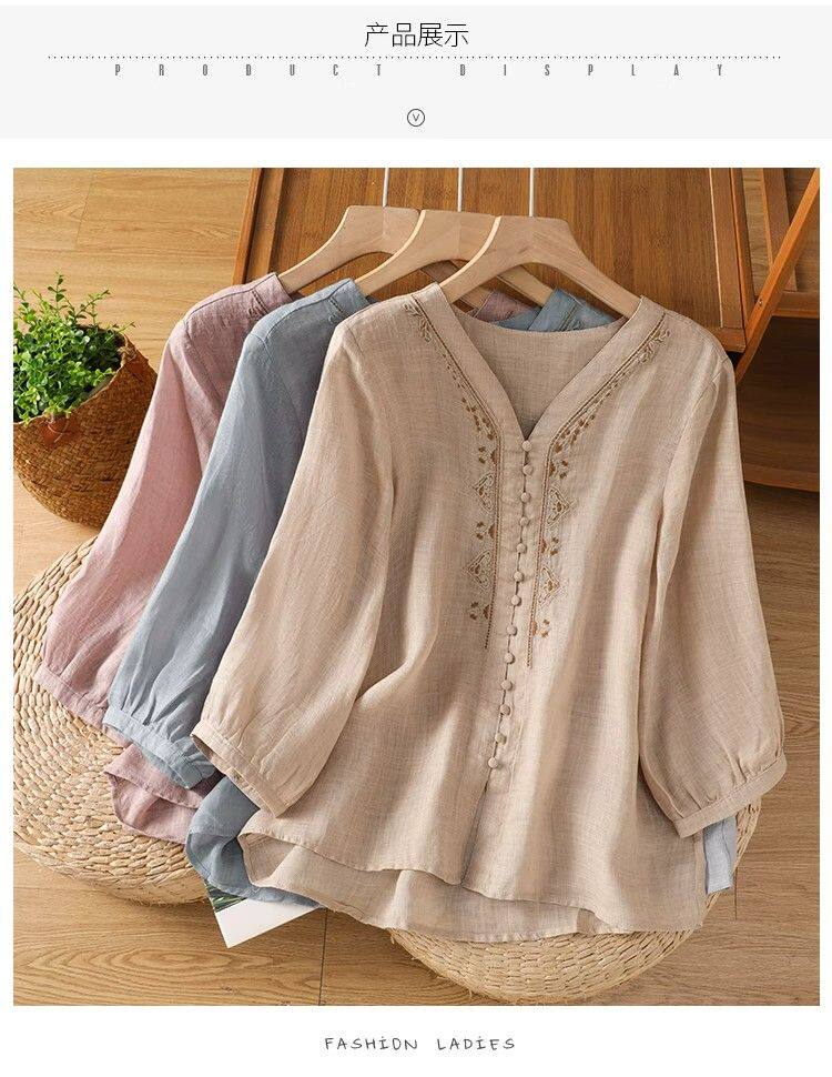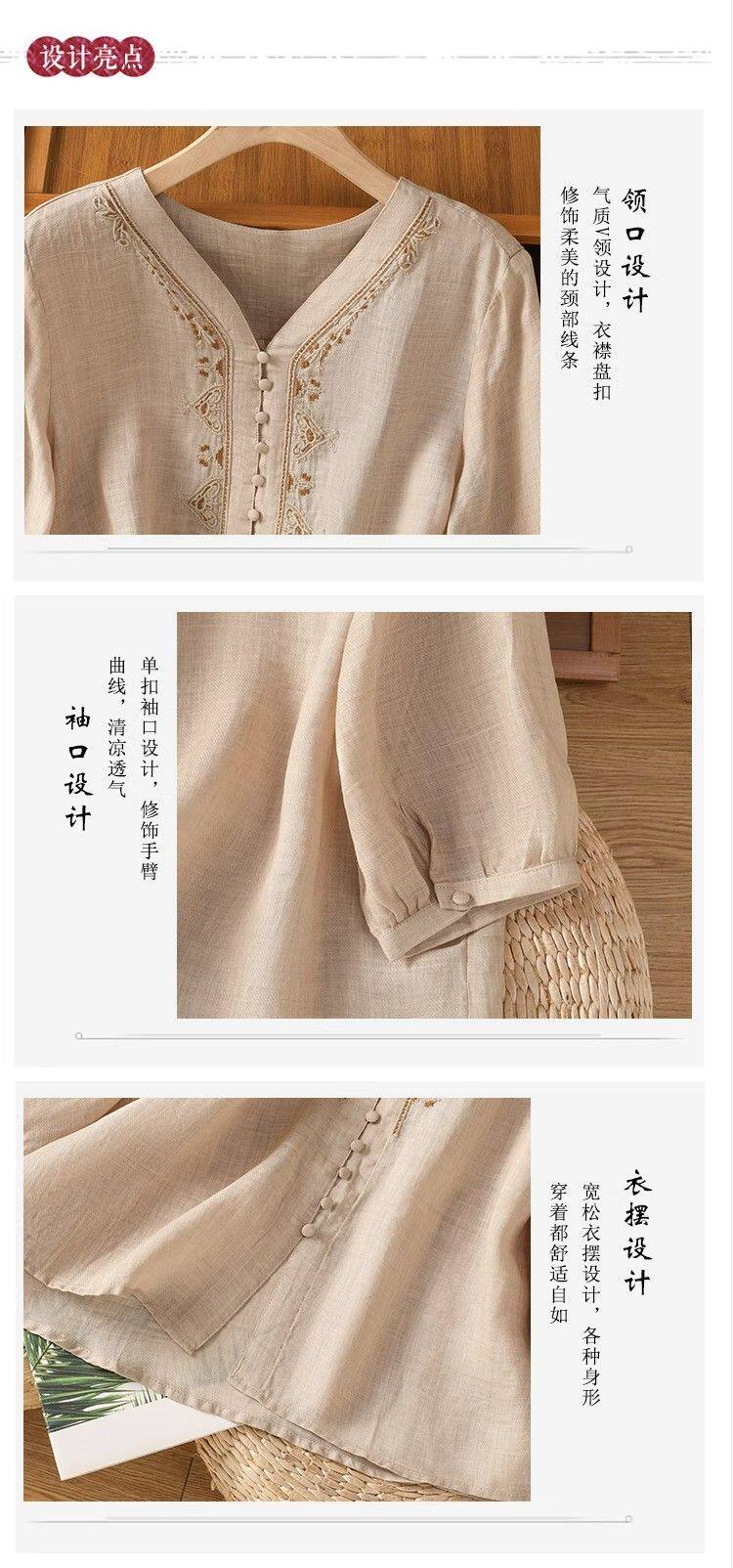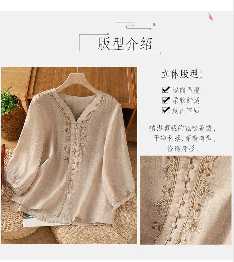 復古輕薄棉麻V領刺綉襯衫女夏季爆款洋氣媽媽高級苧麻五分袖上衣