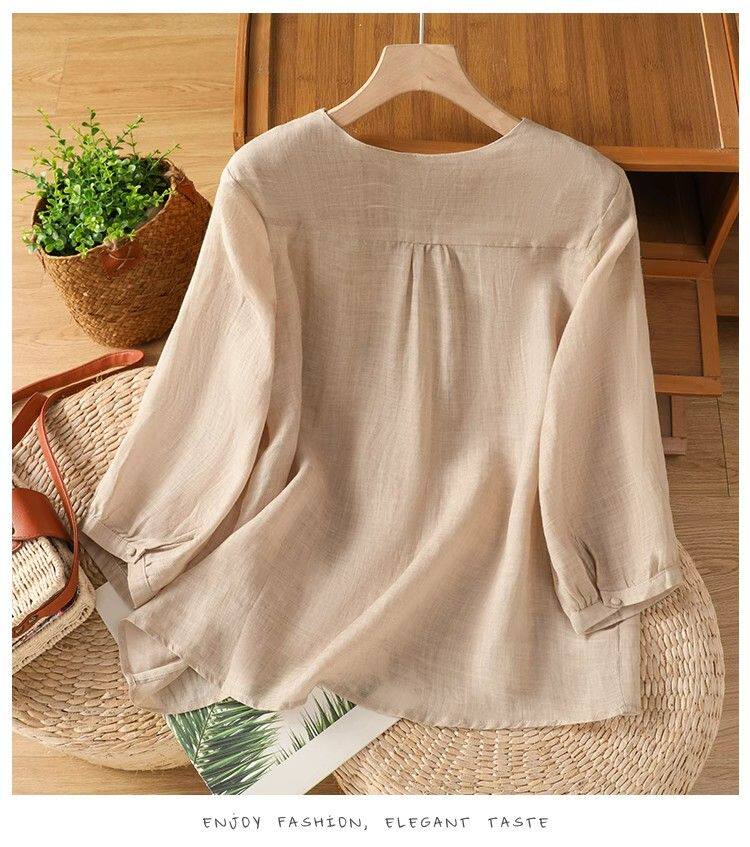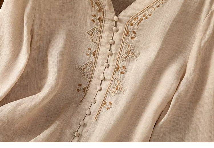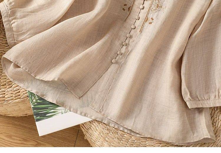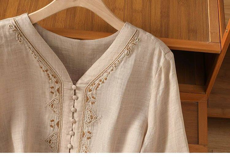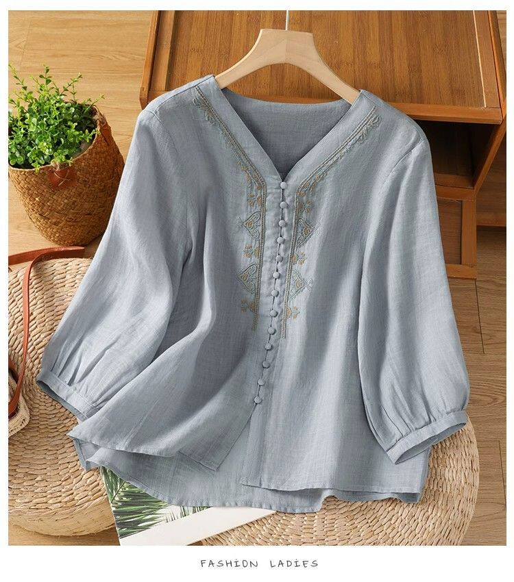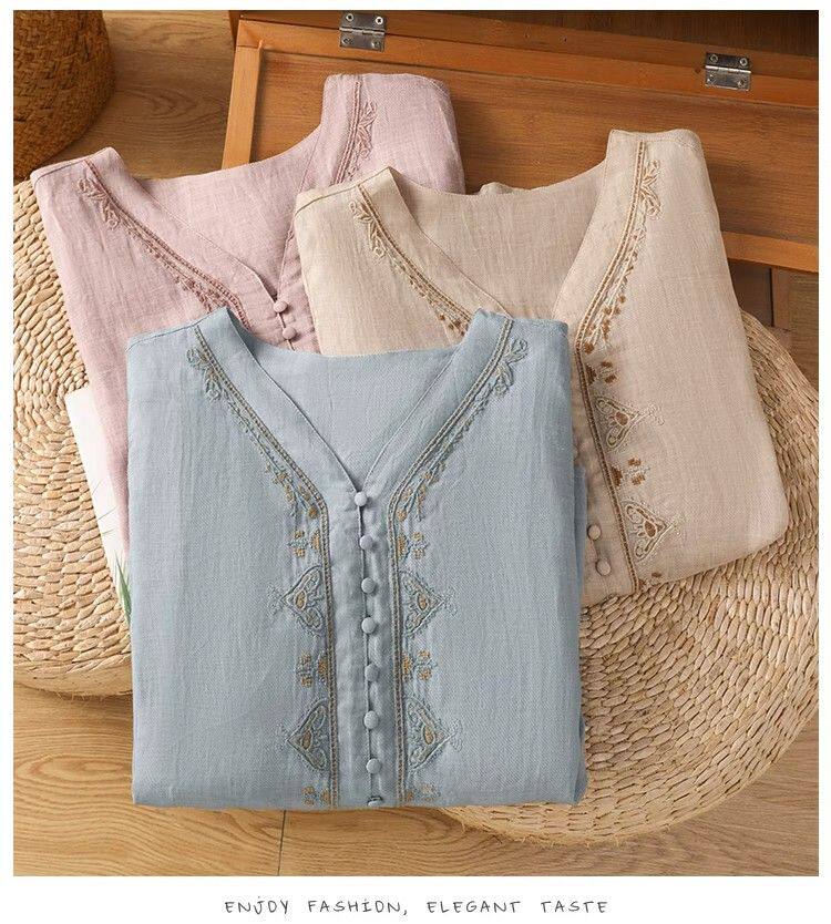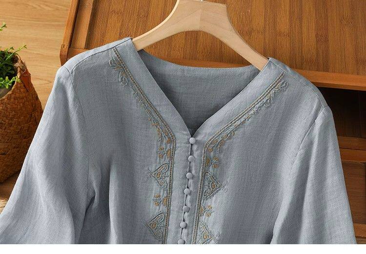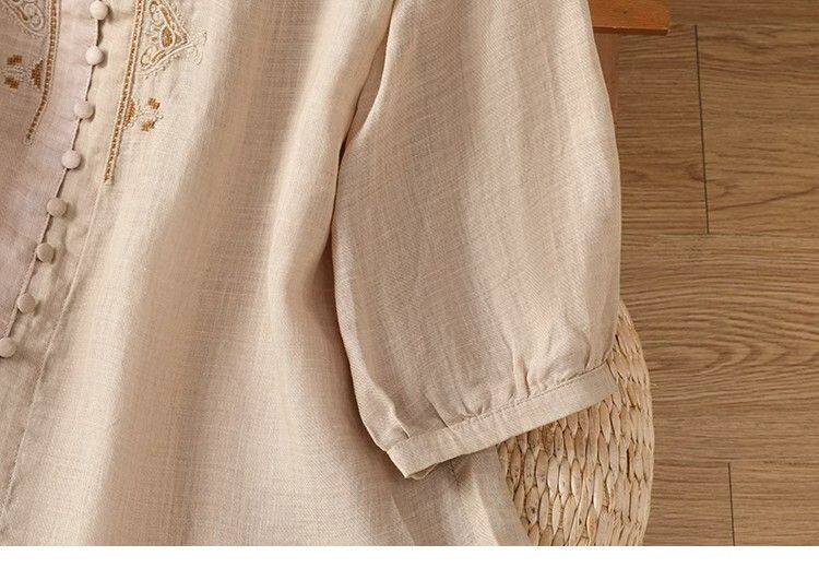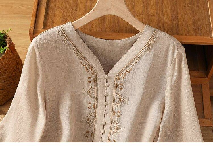 復古輕薄棉麻V領刺綉襯衫女夏季爆款洋氣媽媽高級苧麻五分袖上衣