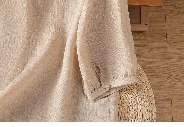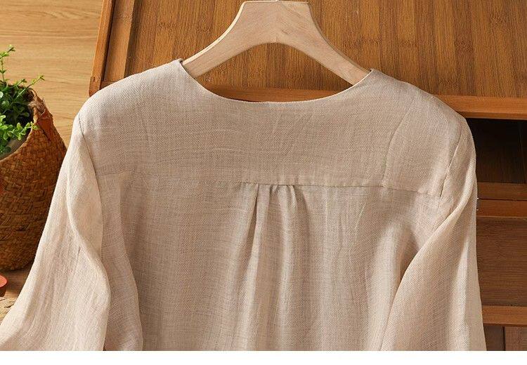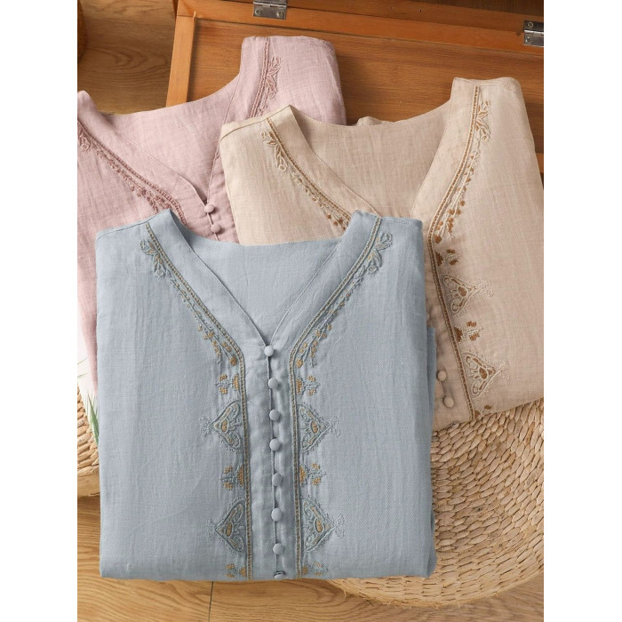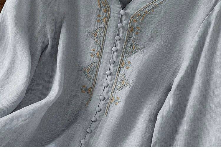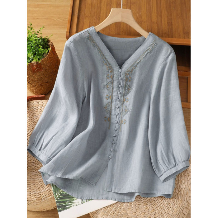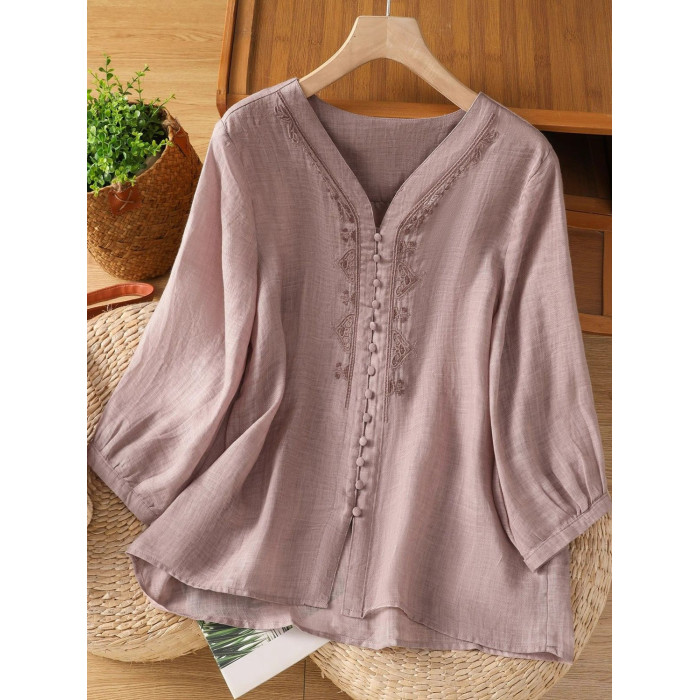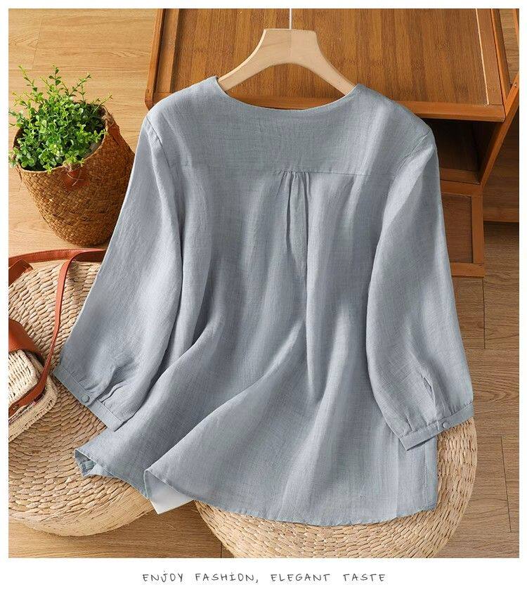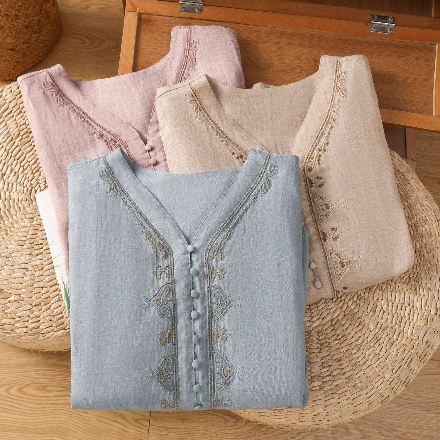 復古輕薄棉麻V領刺綉襯衫女夏季爆款洋氣媽媽高級苧麻五分袖上衣