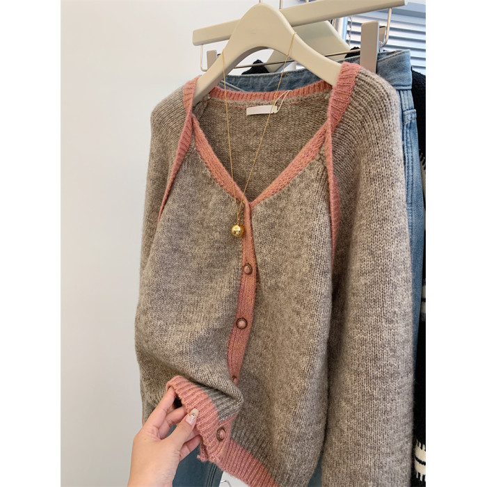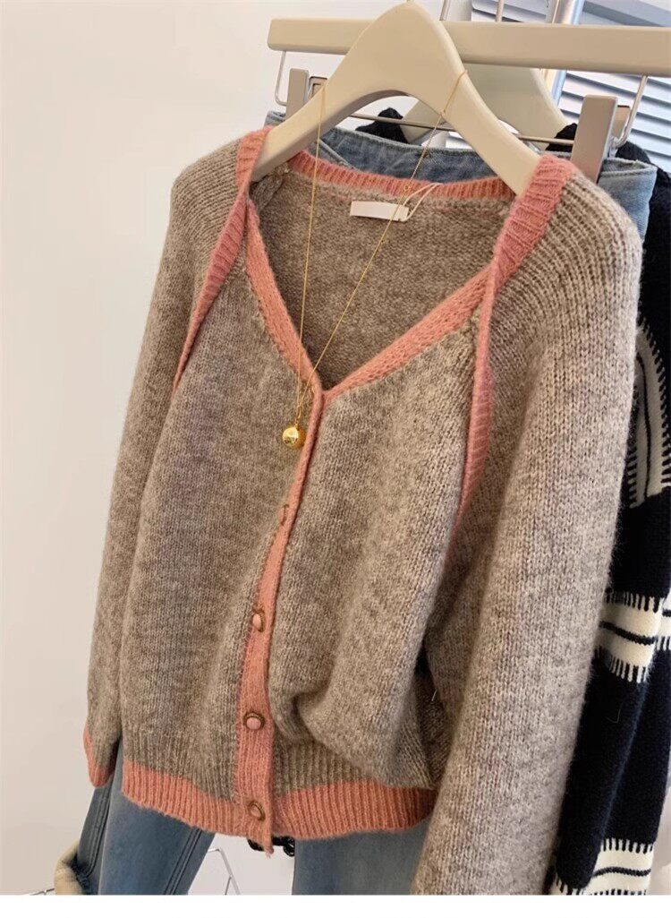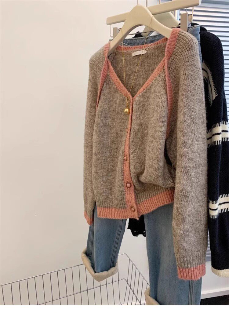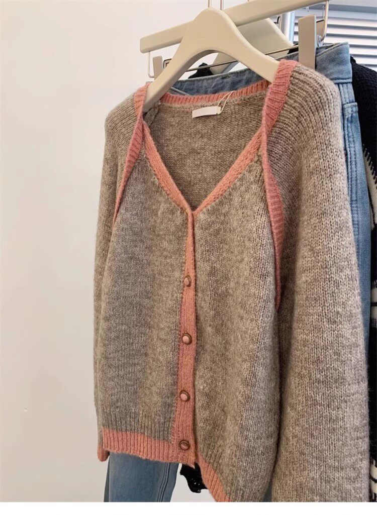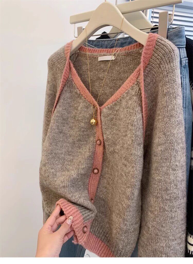 歐貨高級感假兩件撞色v領針織開衫女秋冬軟糯慵懶風羊毛毛衣外套