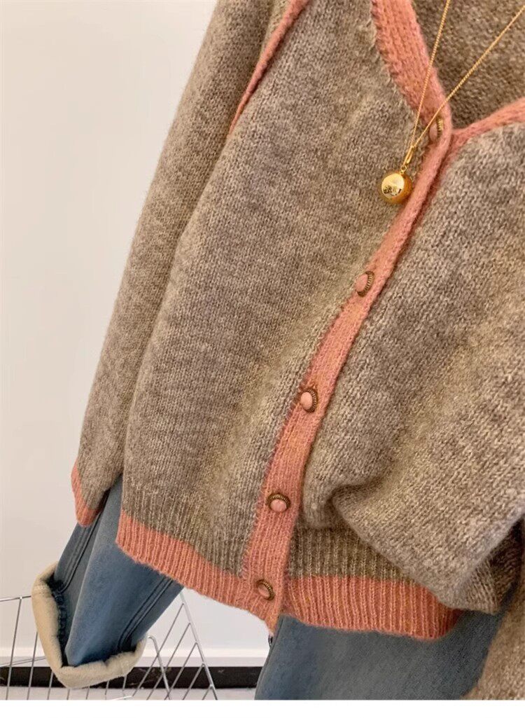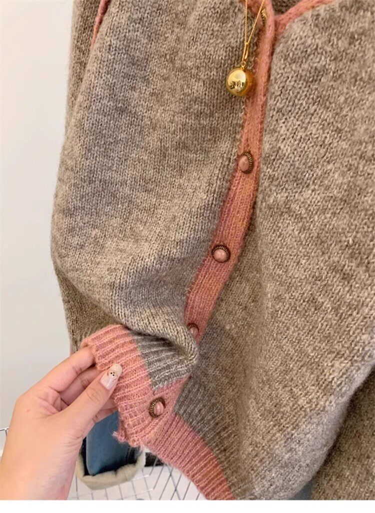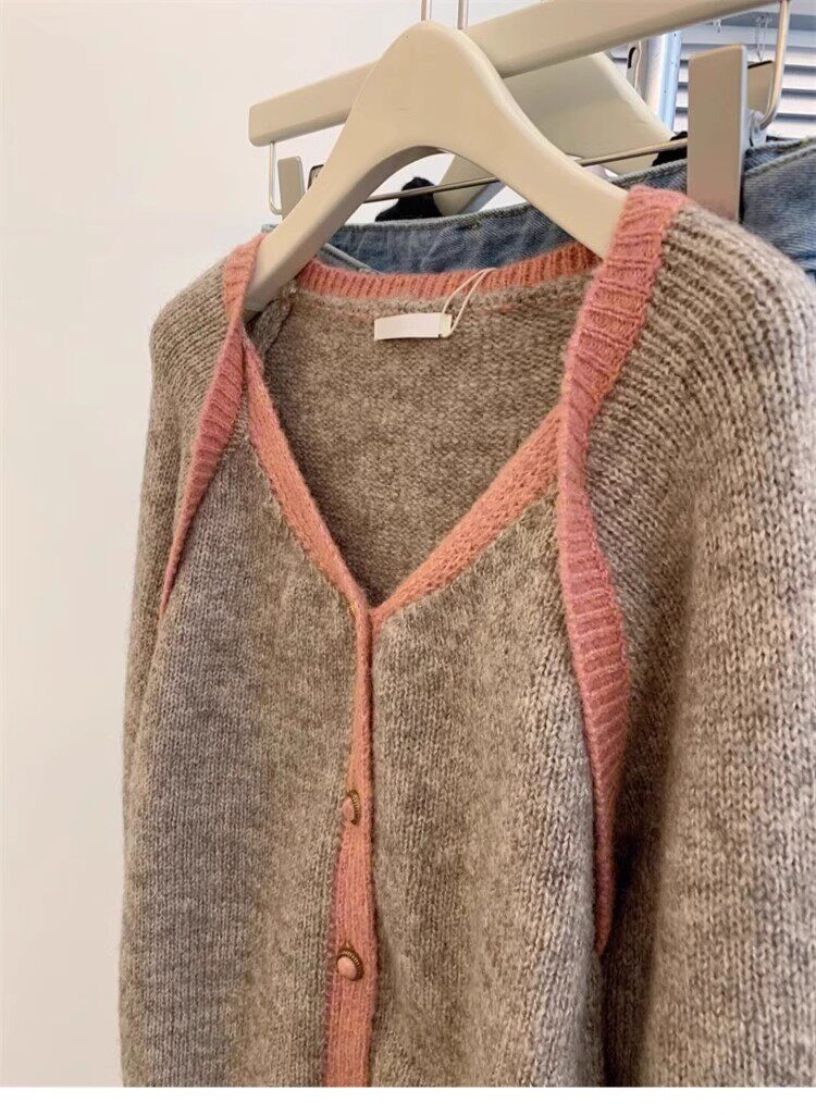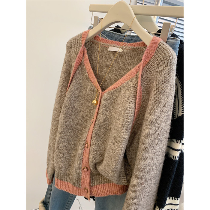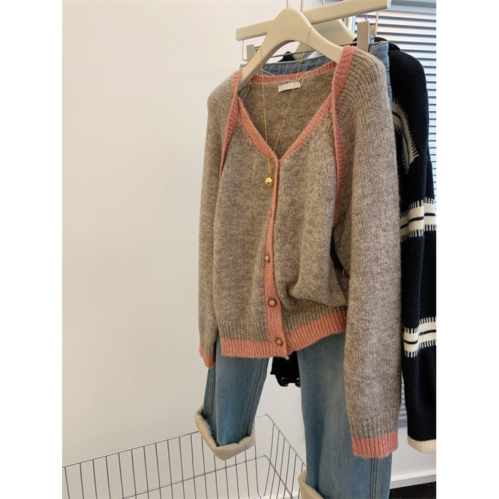 歐貨高級感假兩件撞色v領針織開衫女秋冬軟糯慵懶風羊毛毛衣外套