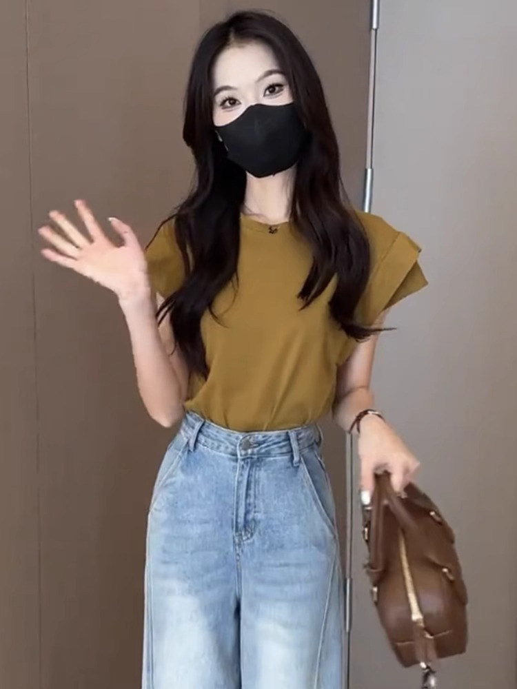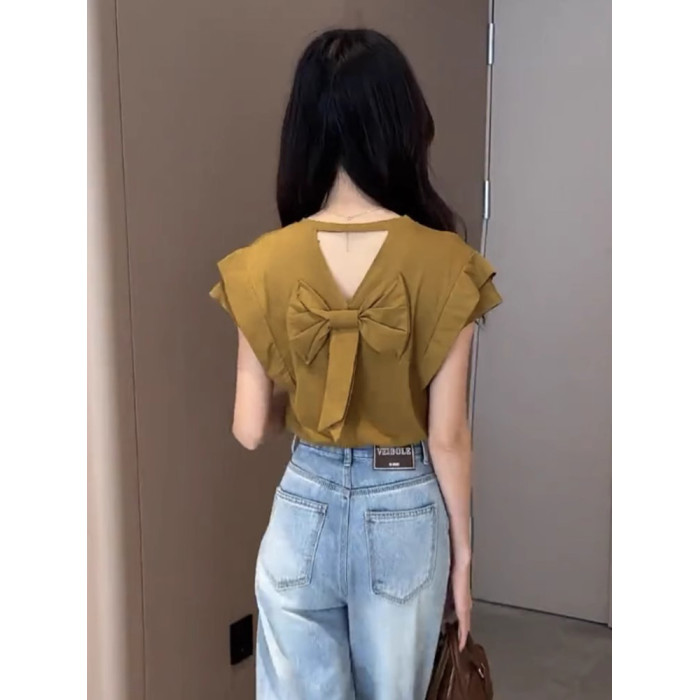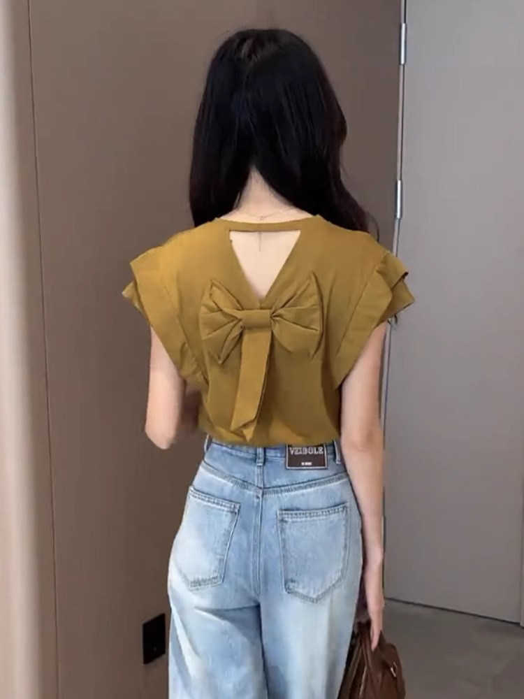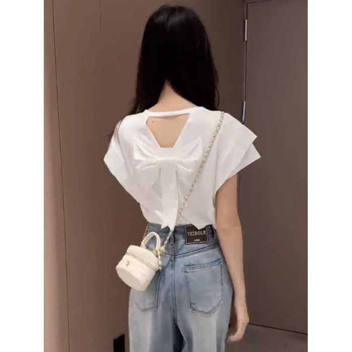 法式洋氣時尚設計感打底衫今年夏季新款純色短袖蝴蝶結女裝上衣潮