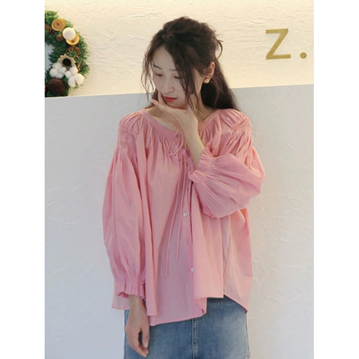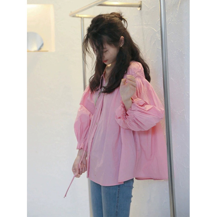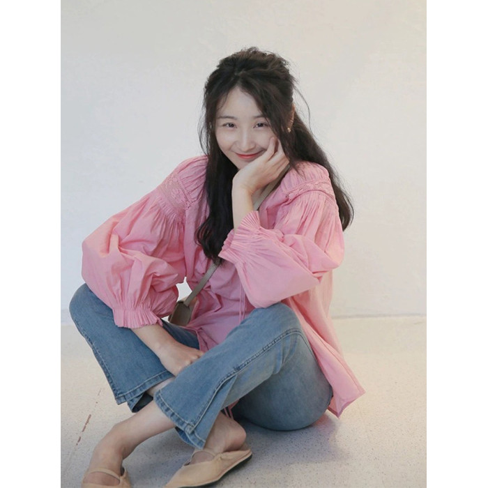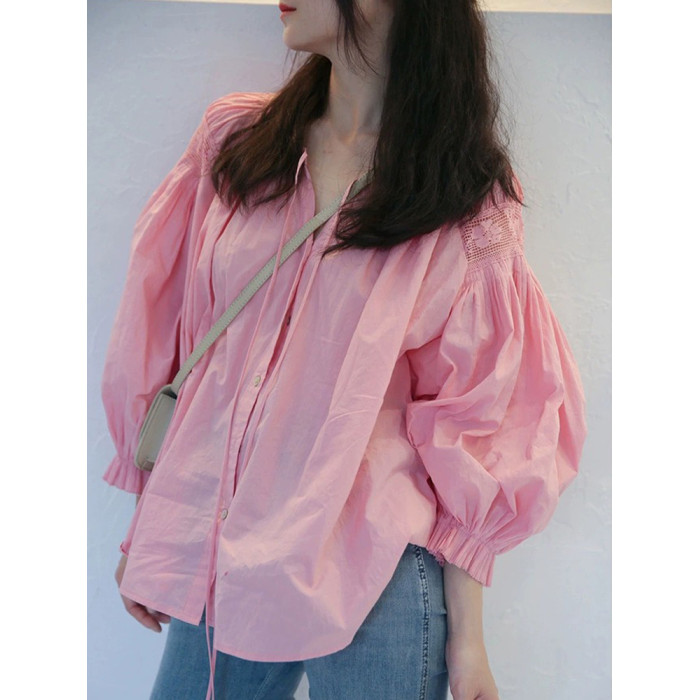 甜美減齡法式別致燈籠袖粉色襯衫女夏季薄款別致漂亮洋氣顯瘦小衫