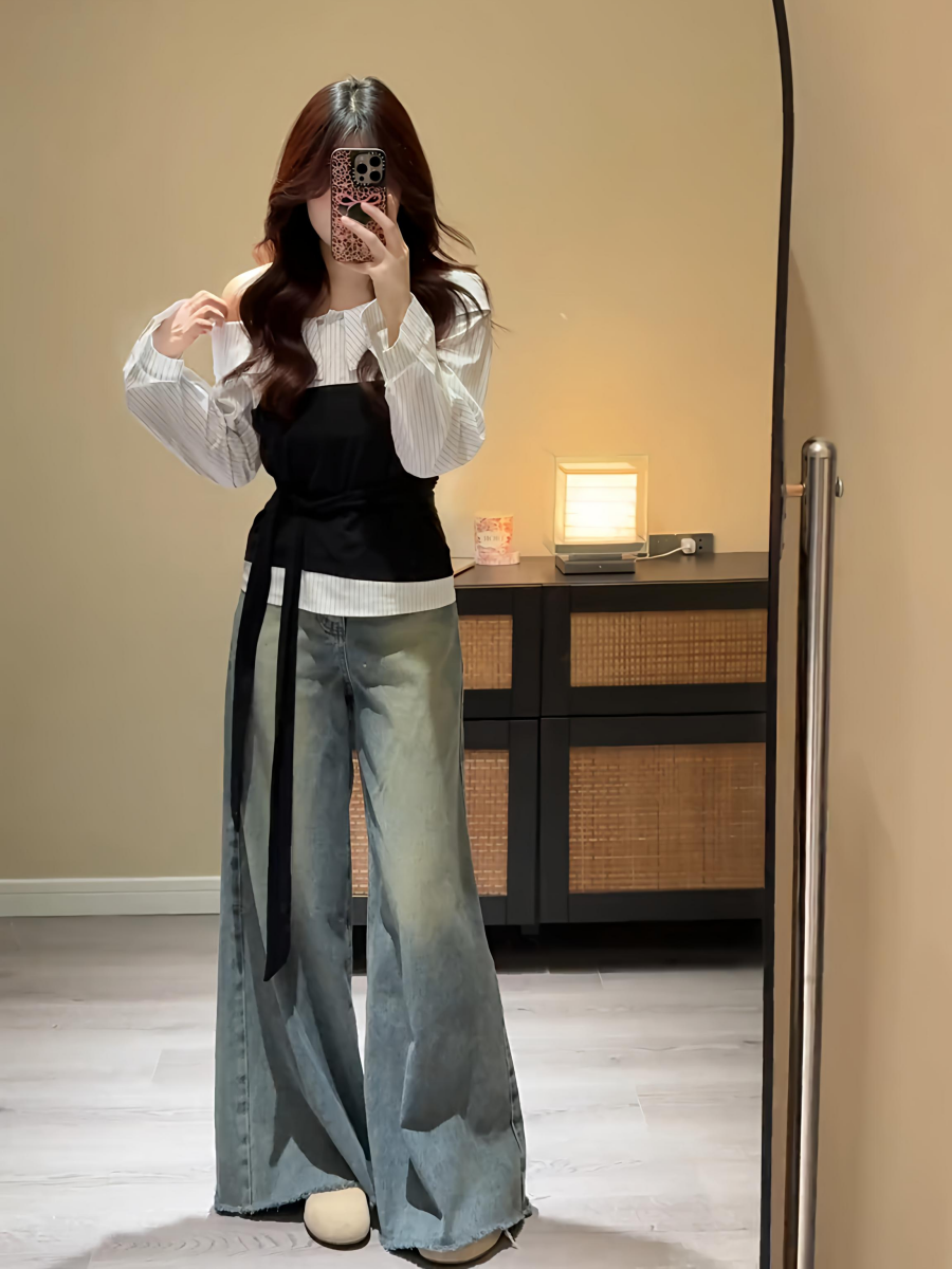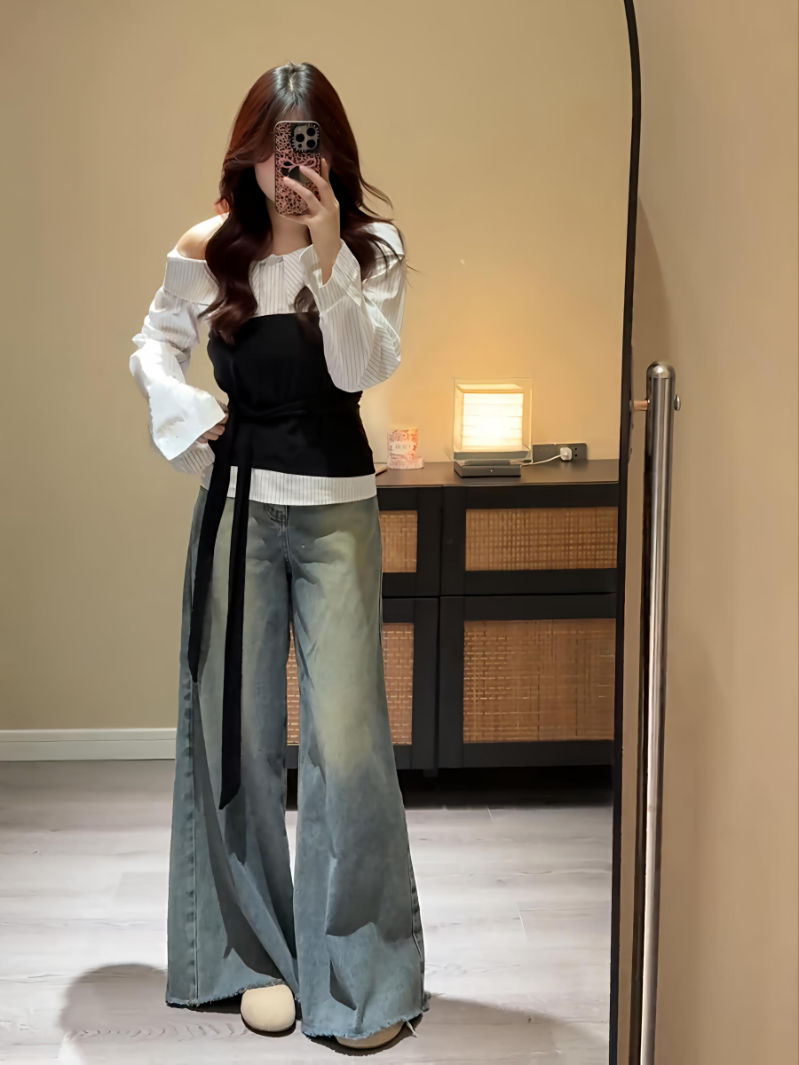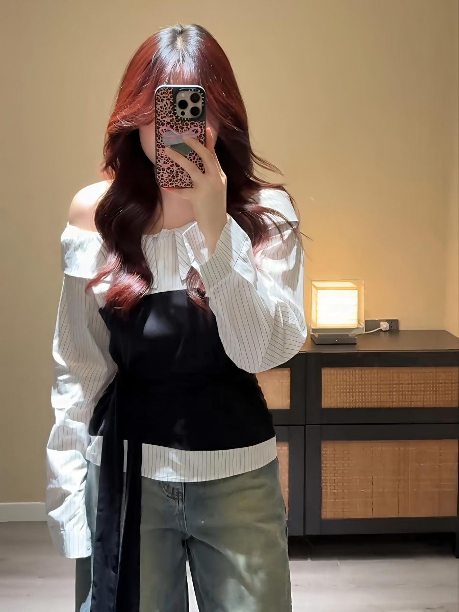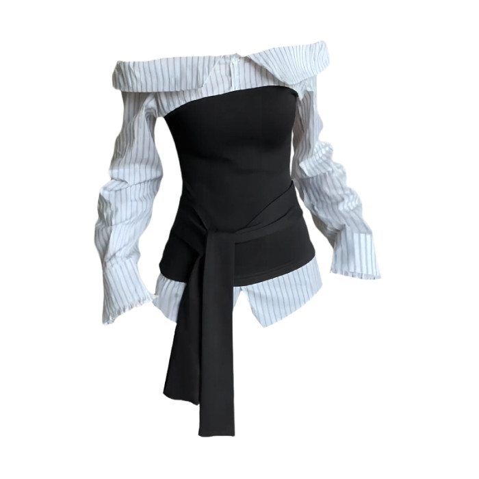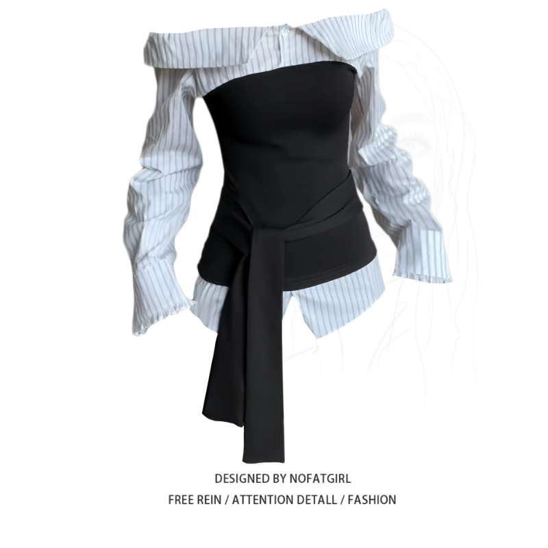 大碼胖MM高級感條紋拼接一字肩長袖襯衫早秋通勤百搭假兩件上衣女