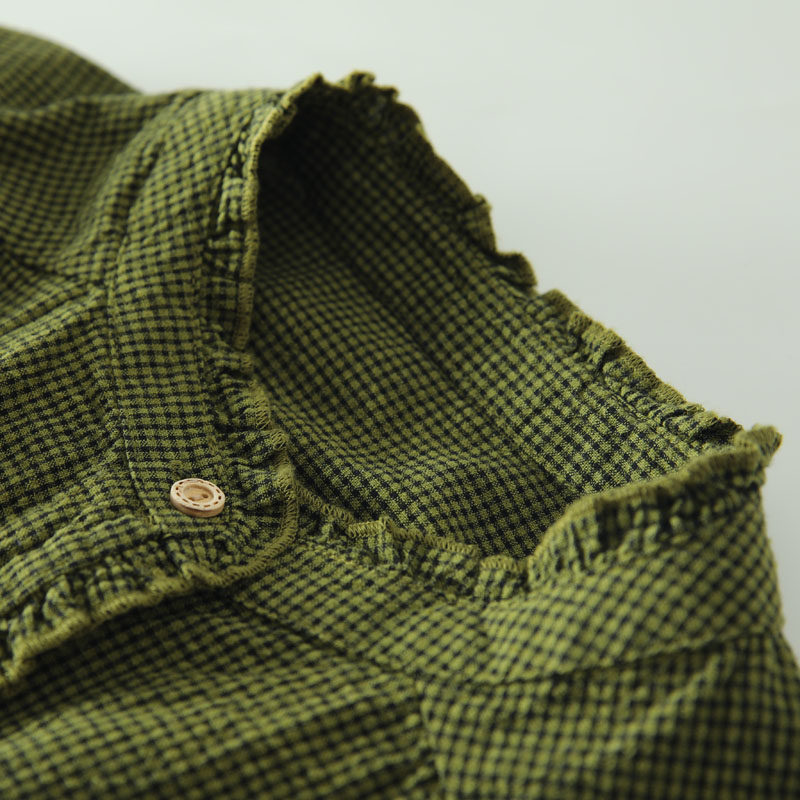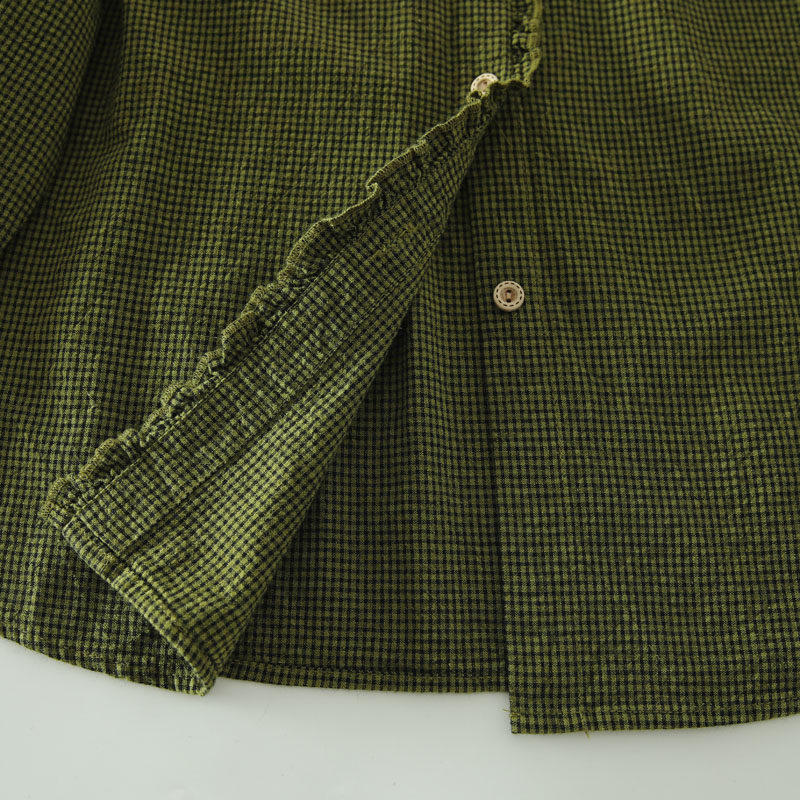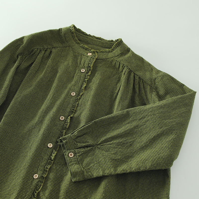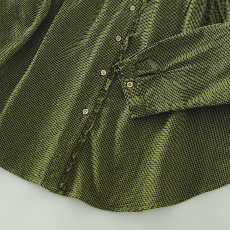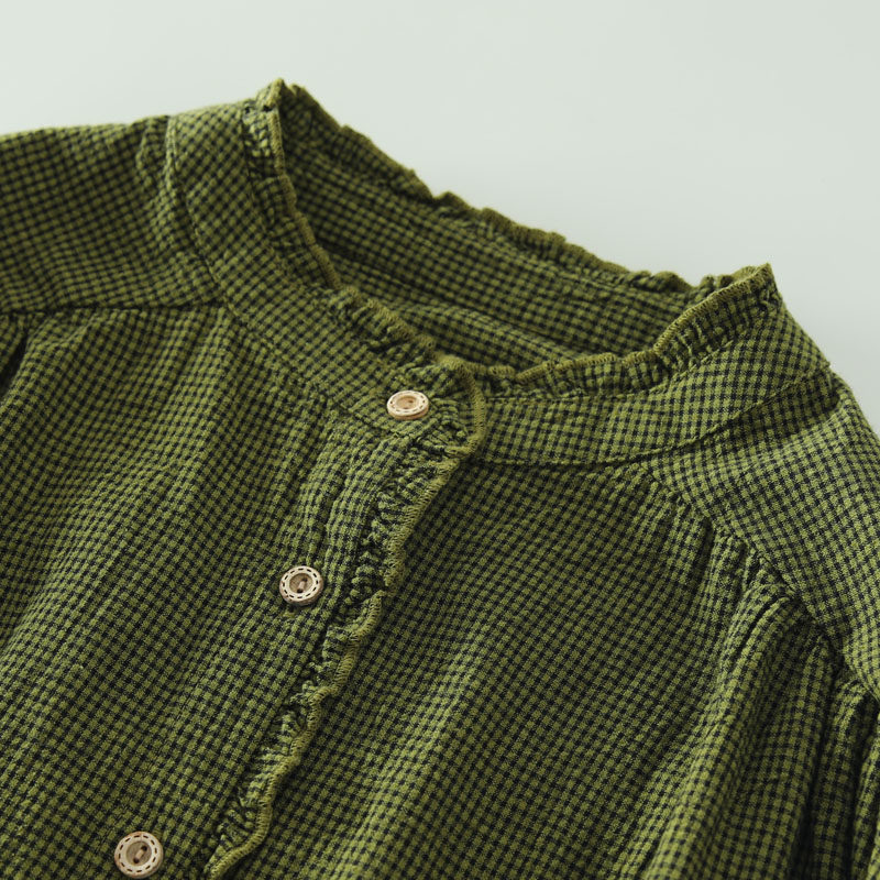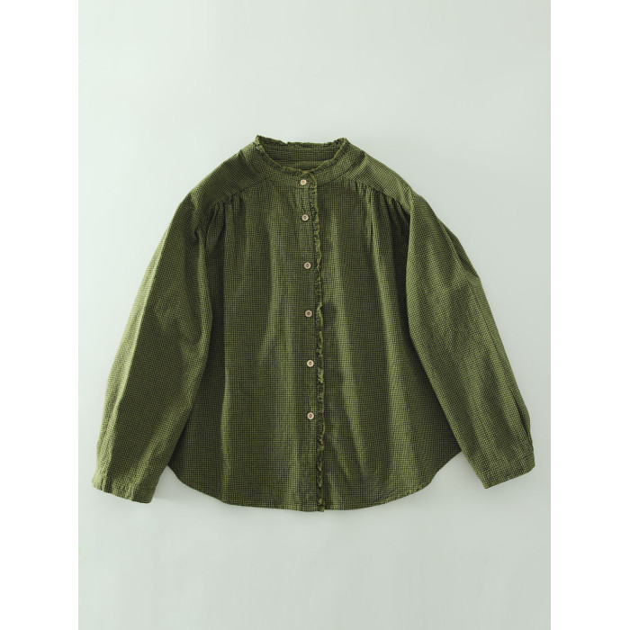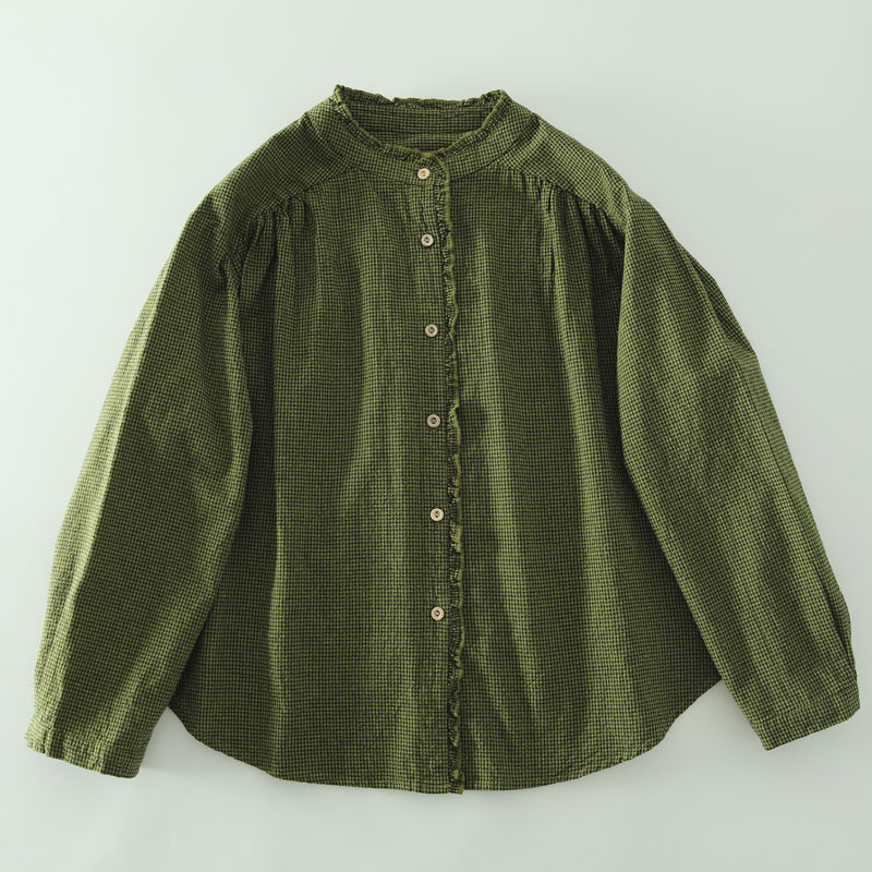 春秋款文藝復古木耳花邊立領格子襯衫女日系寬鬆百搭長袖襯衣上衣