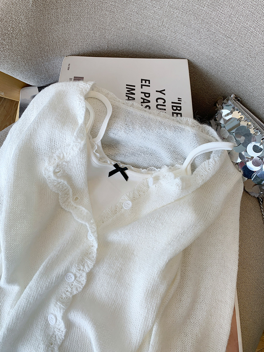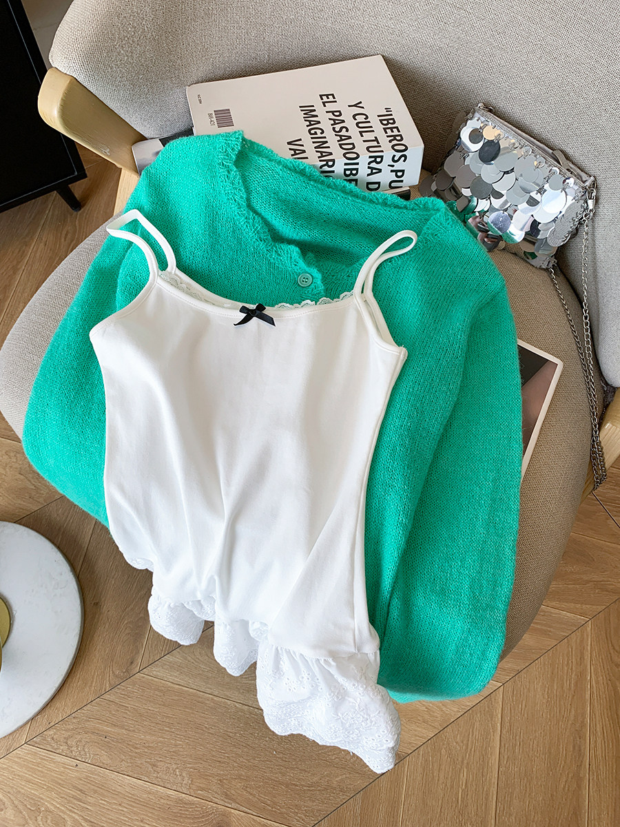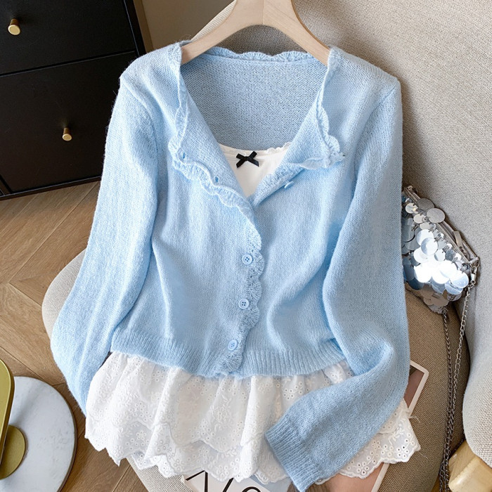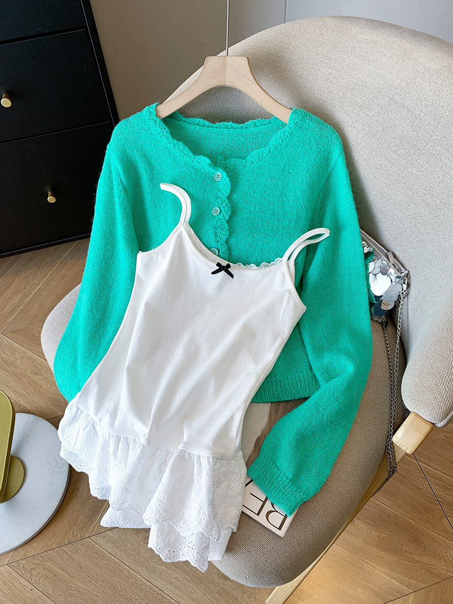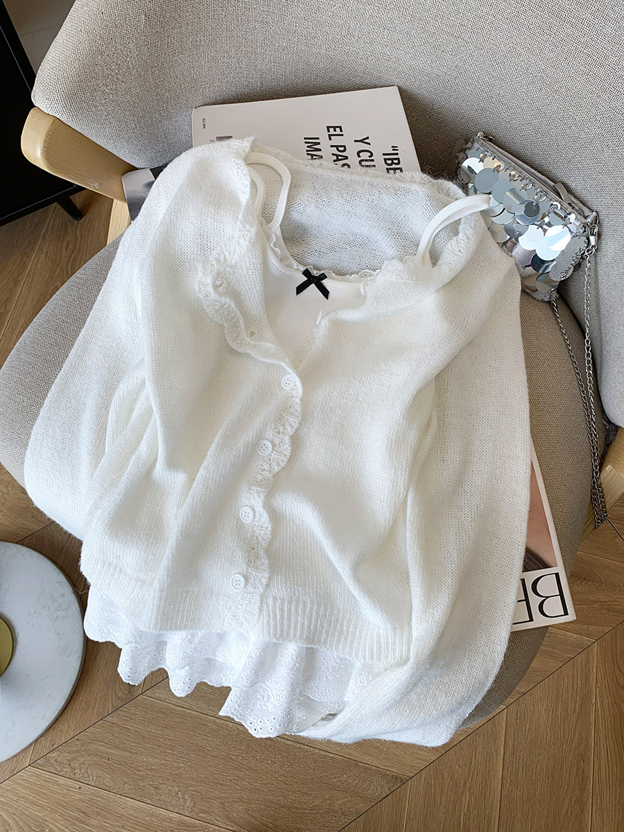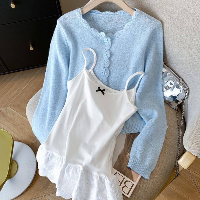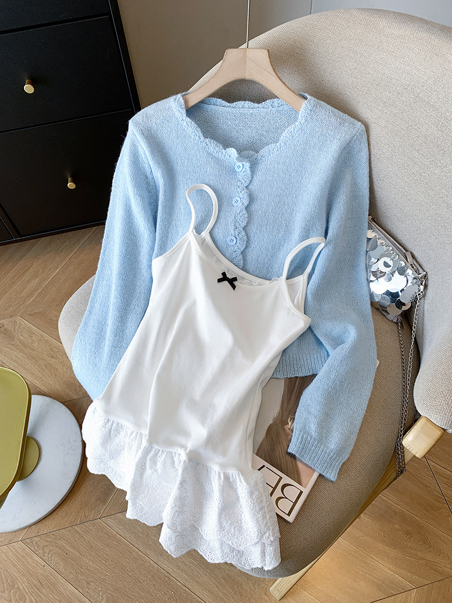 專櫃撤廻剪標韓系蕾絲拼接吊帶女春季新款甜美顯白開衫曡穿兩件套