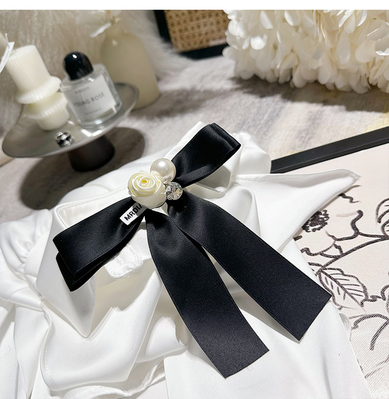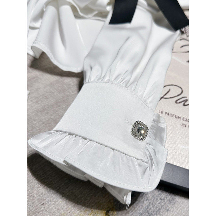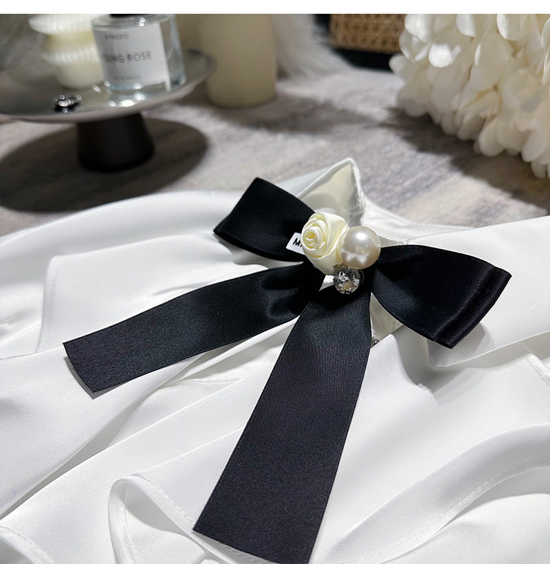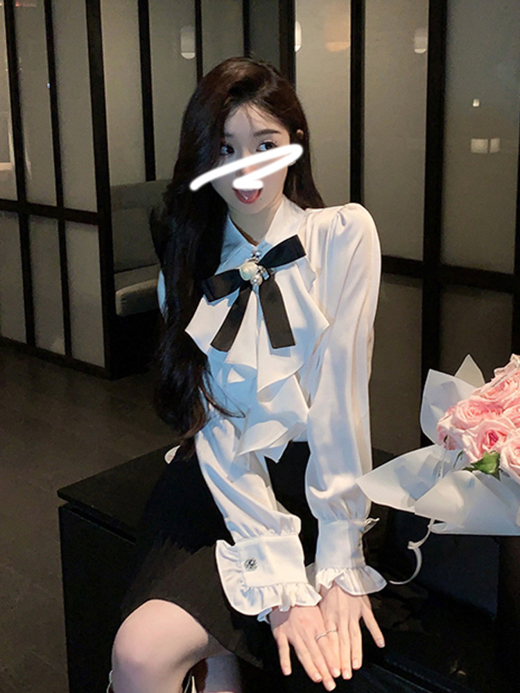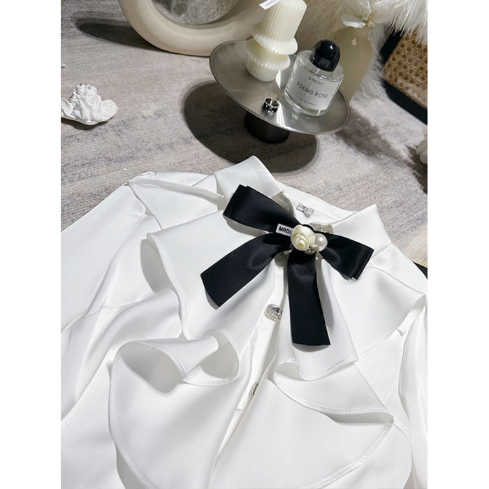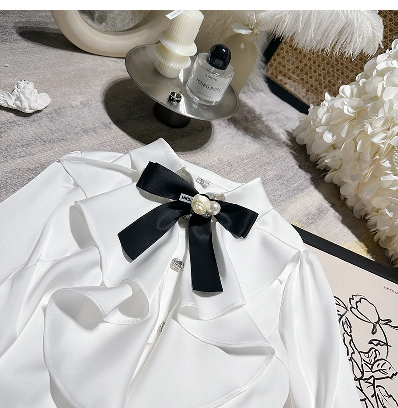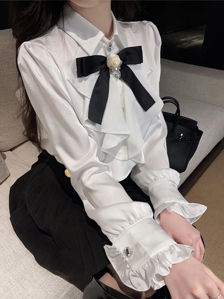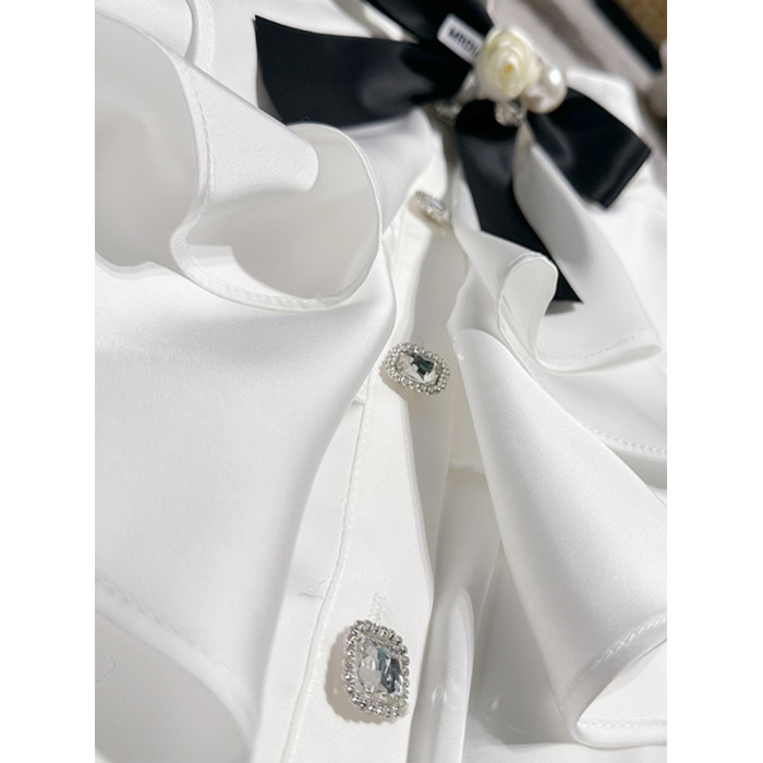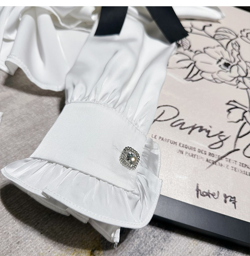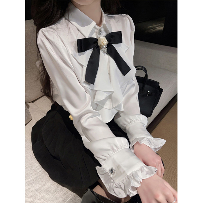 FFmiss◆宮廷風荷葉邊鑲鑽蝴蝶結緞面襯衫女重工氣質珍珠花朵襯衣