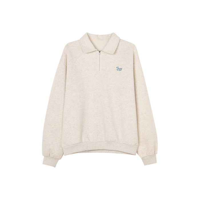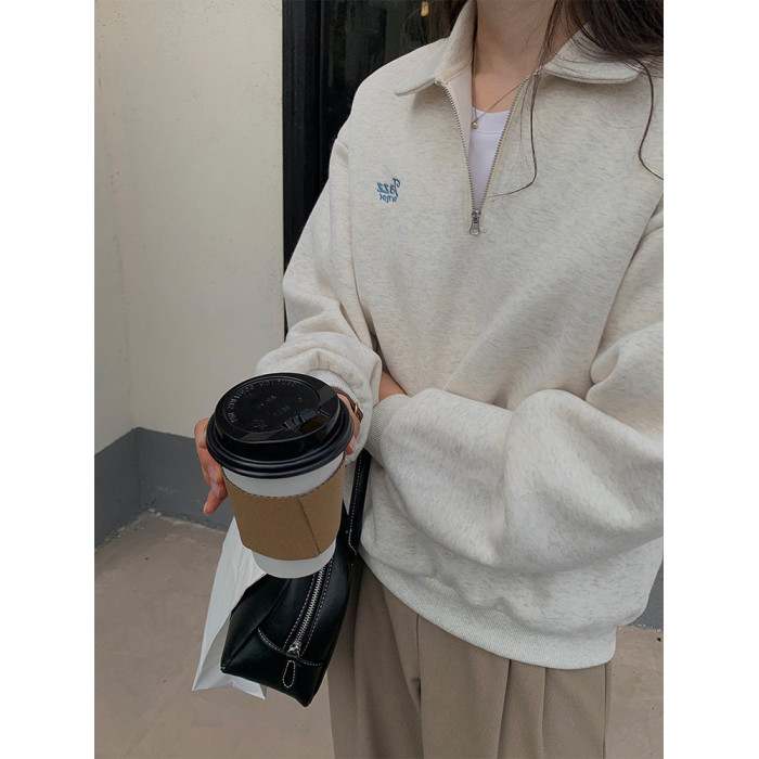 美式復古正肩灰色polo領衛衣女春秋復古慵懶oversize寬鬆拉鍊上衣