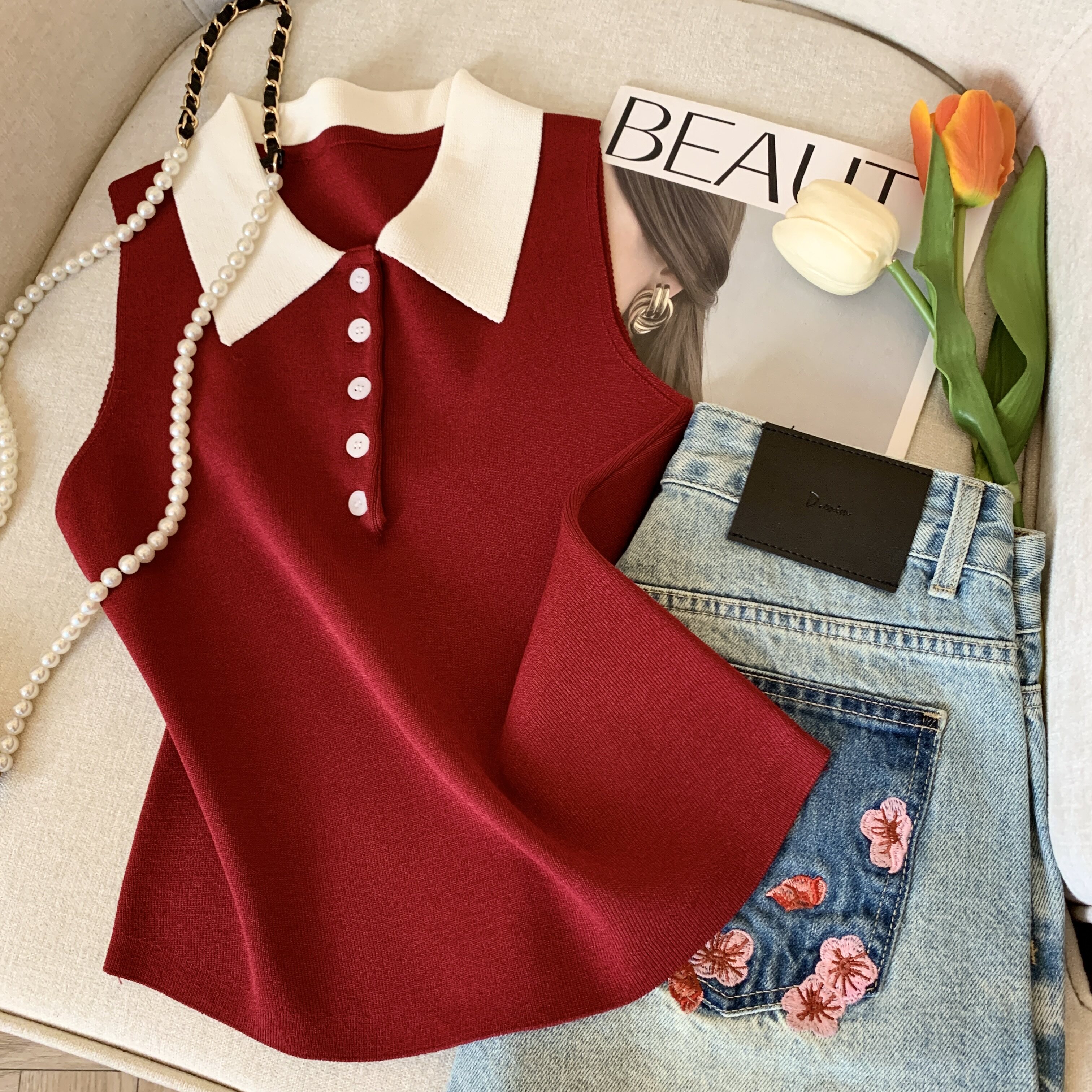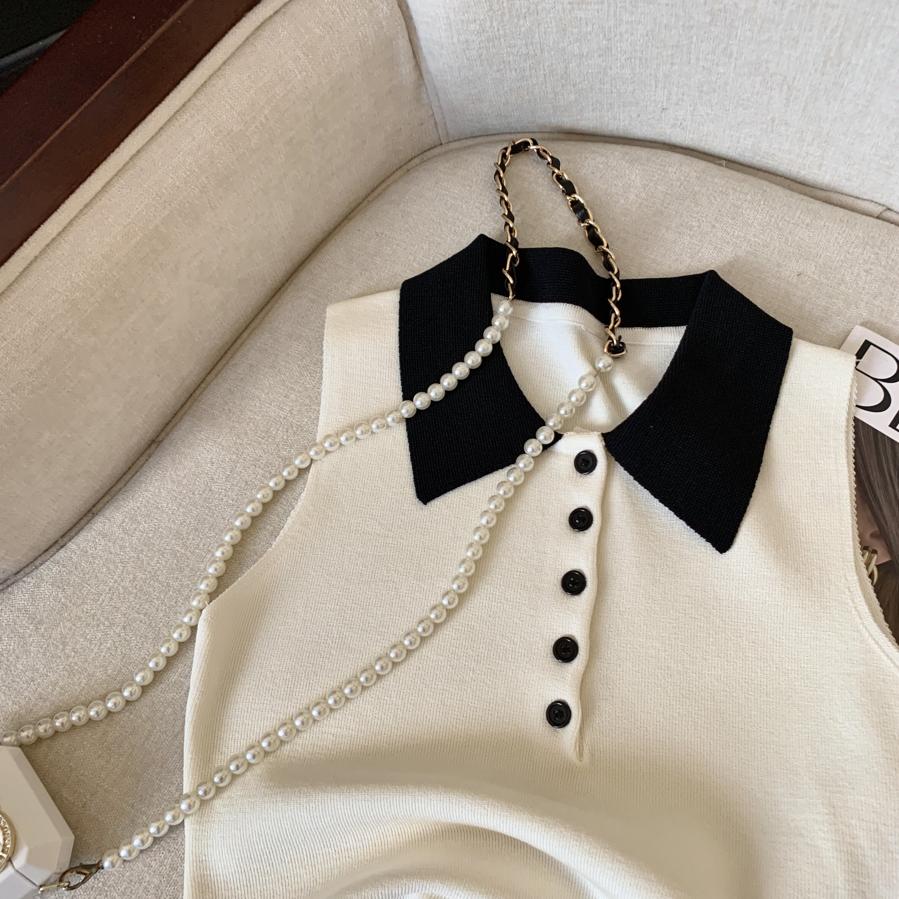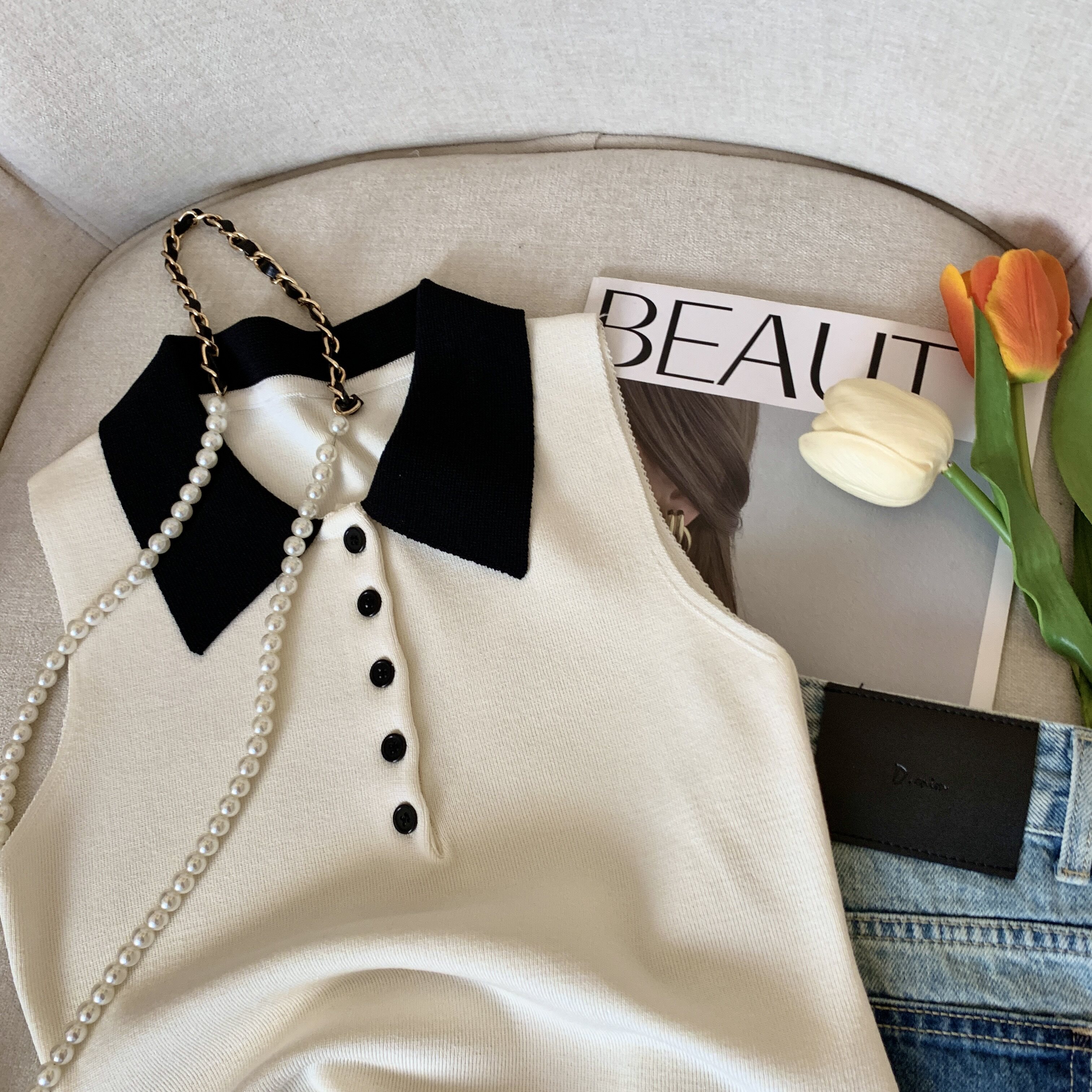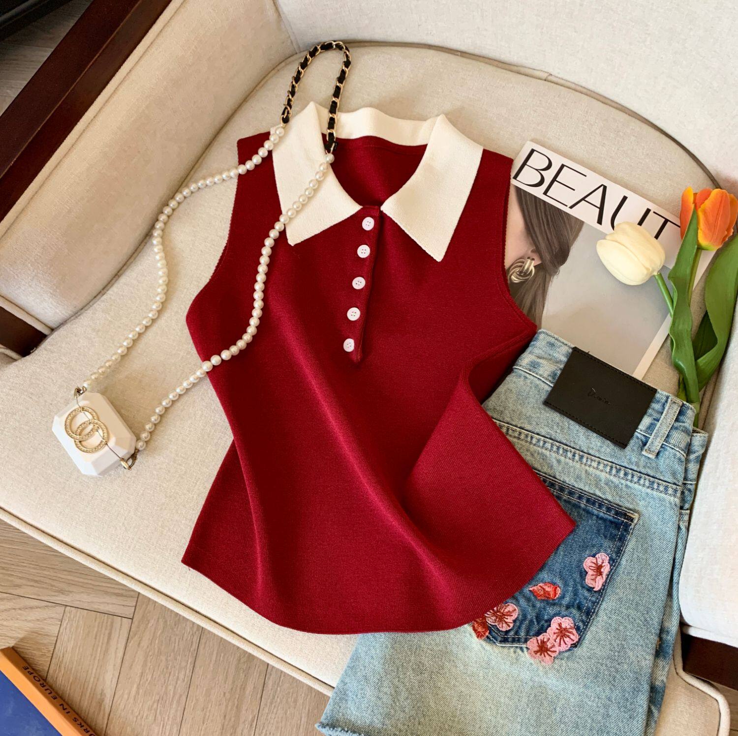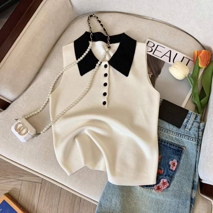 專櫃撤廻剪標韓系POLO領無袖針織背心女夏季新款別致修身內搭上衣