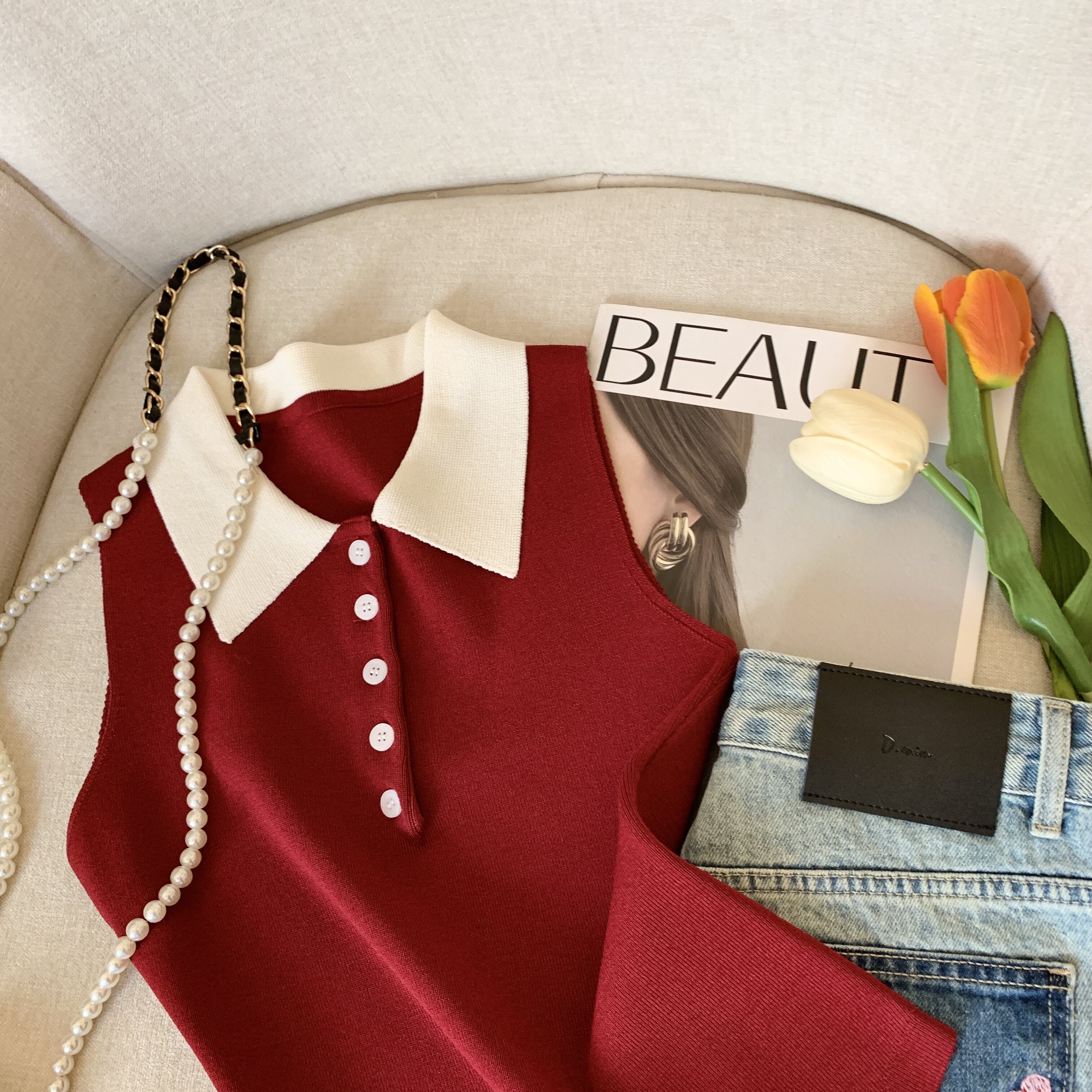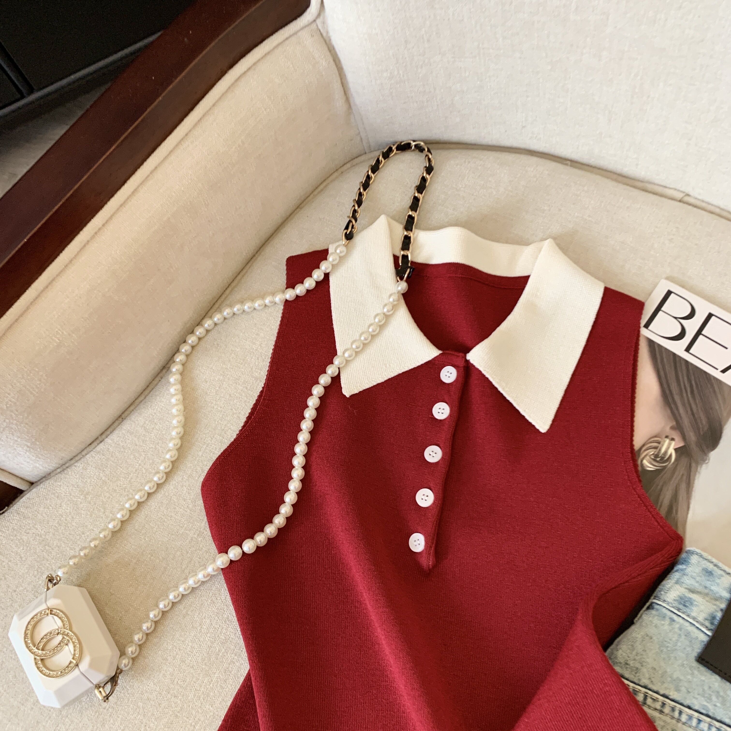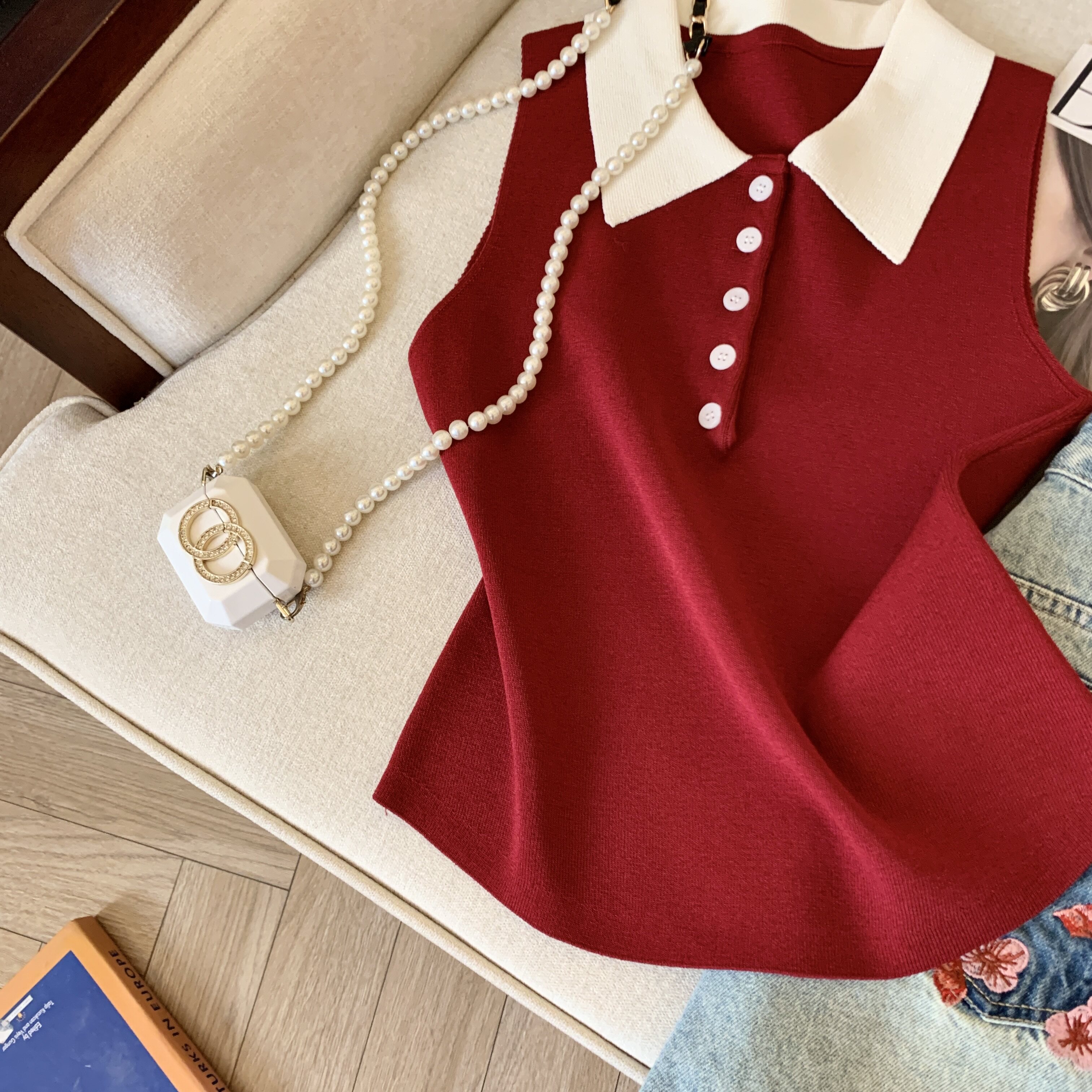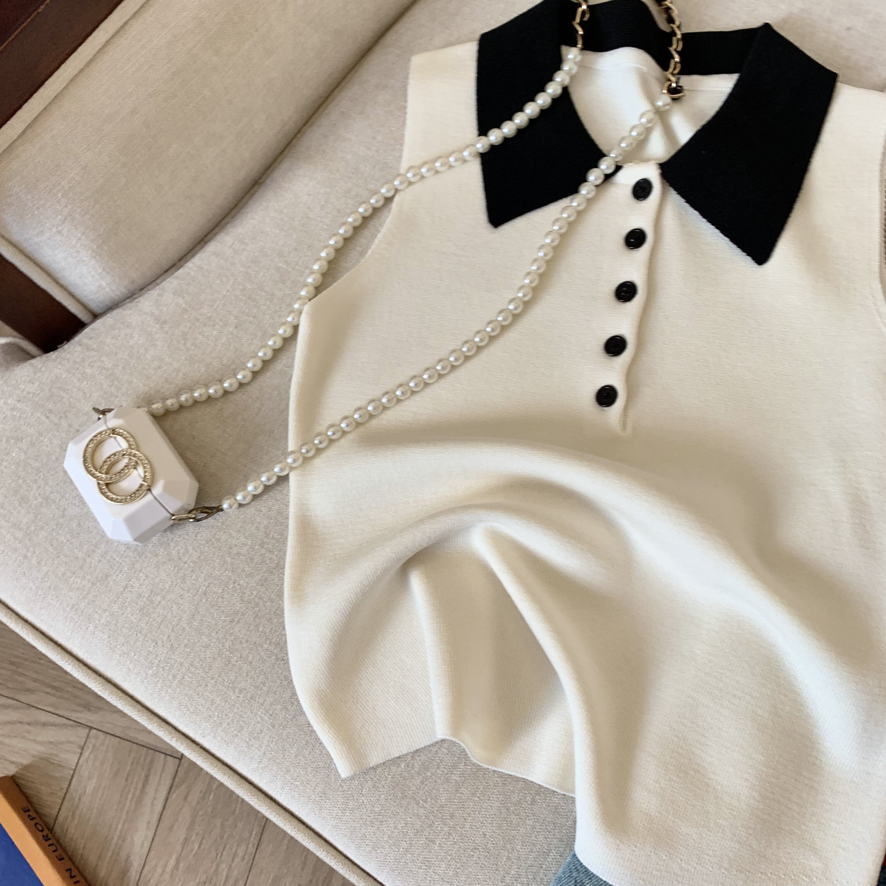 專櫃撤廻剪標韓系POLO領無袖針織背心女夏季新款別致修身內搭上衣
