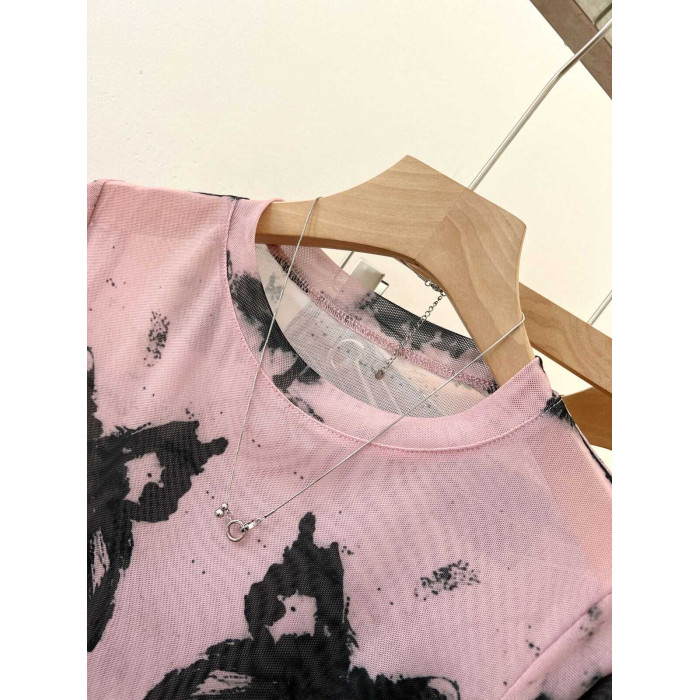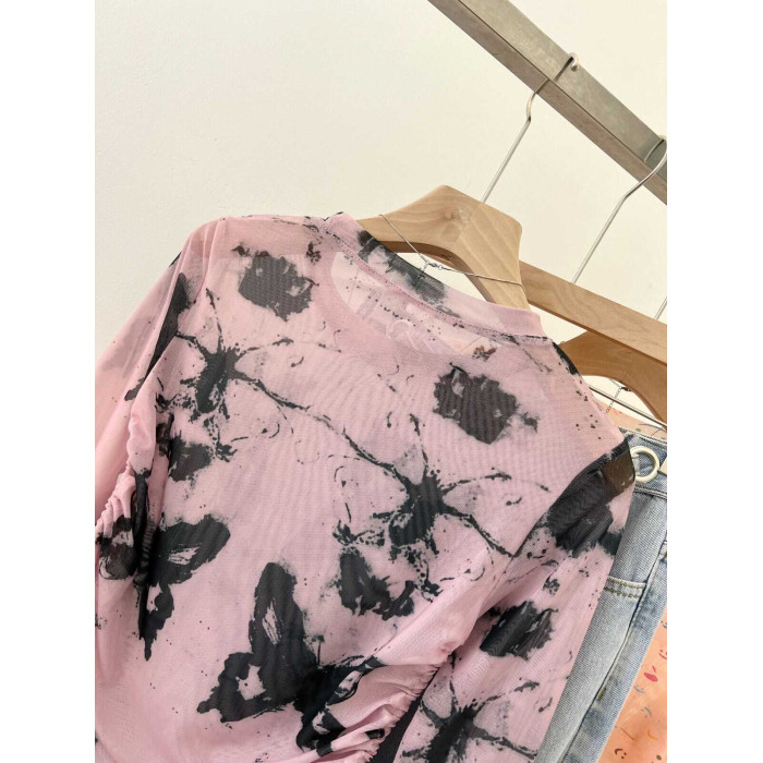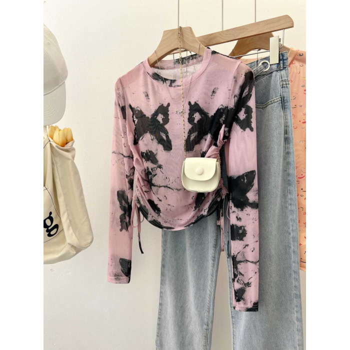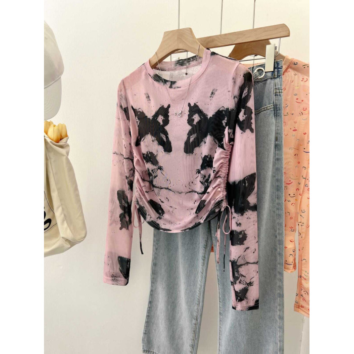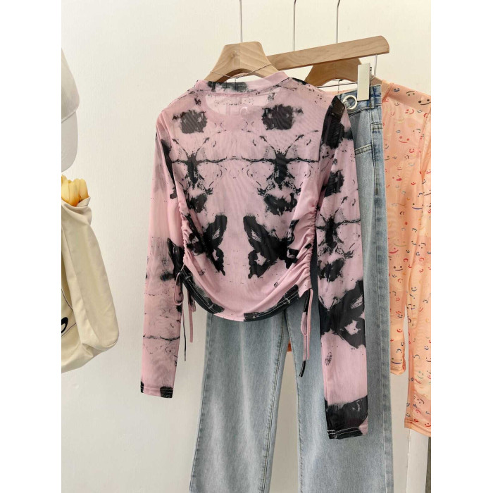 專櫃撤廻剪標美式紥染蝴蝶防曬長袖T恤女夏季甜辣抽繩網紗打底衫