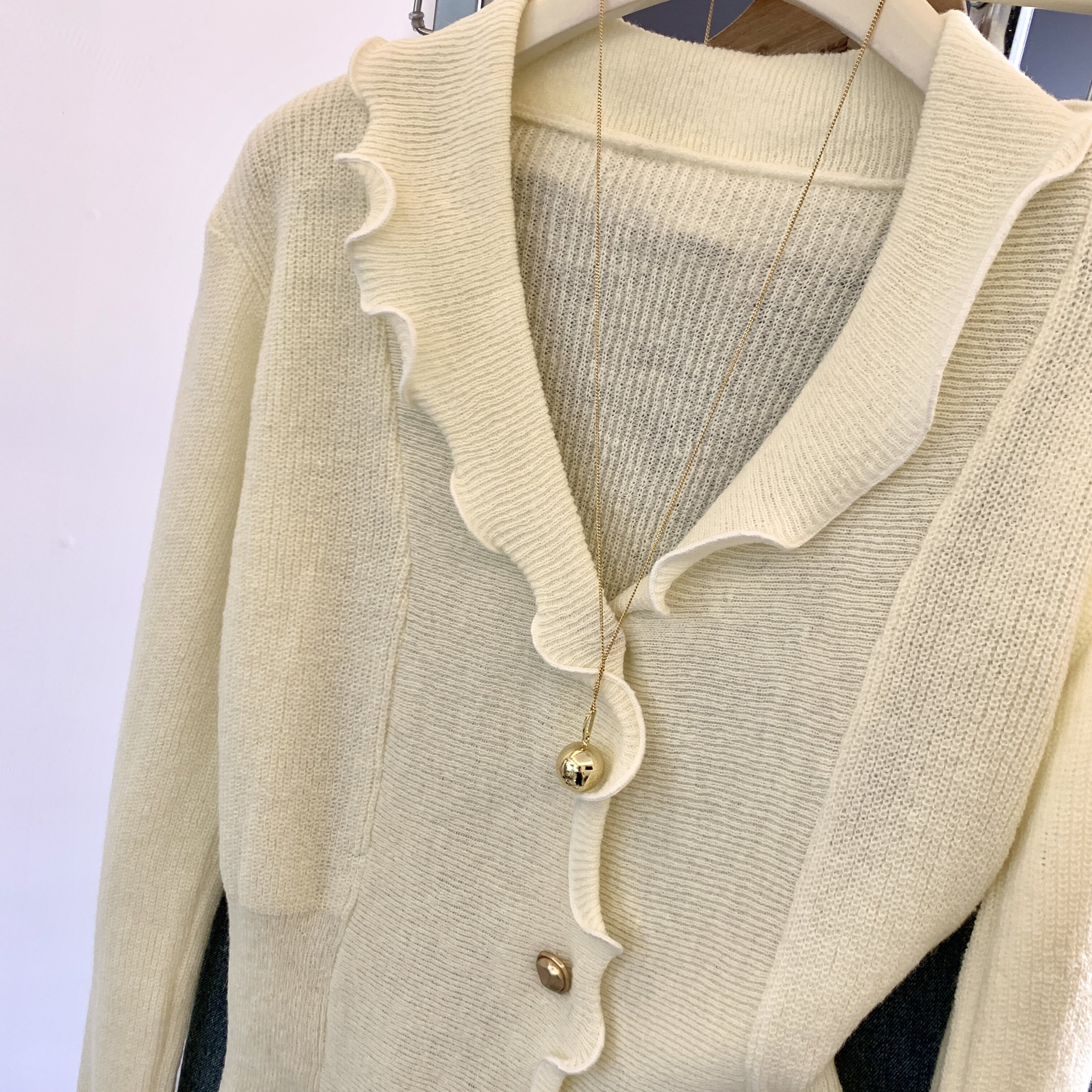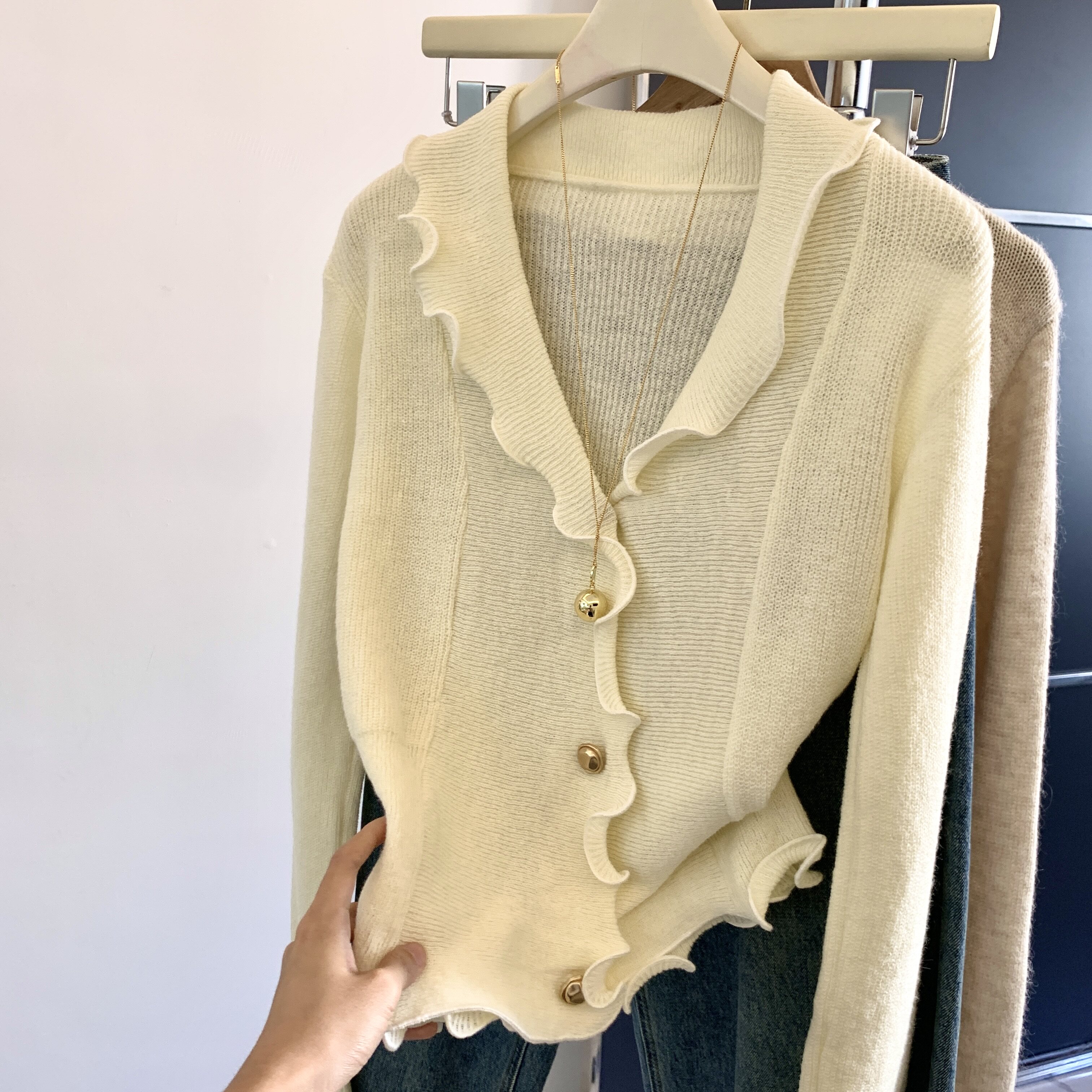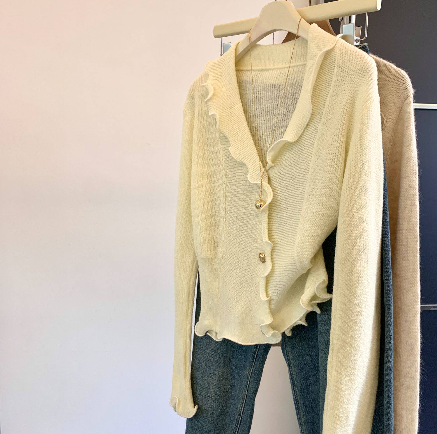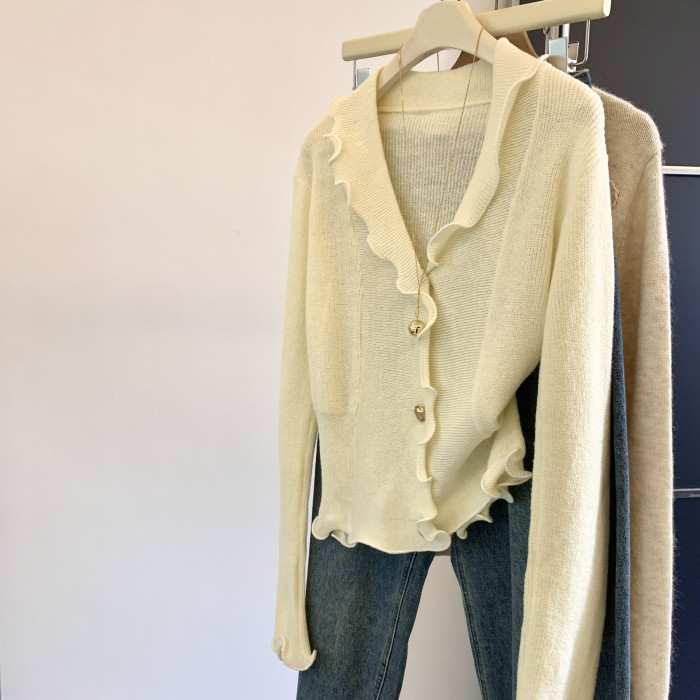 專櫃撤廻剪標法式木耳邊V領針織開衫女春季新款獨特顯瘦別致上衣