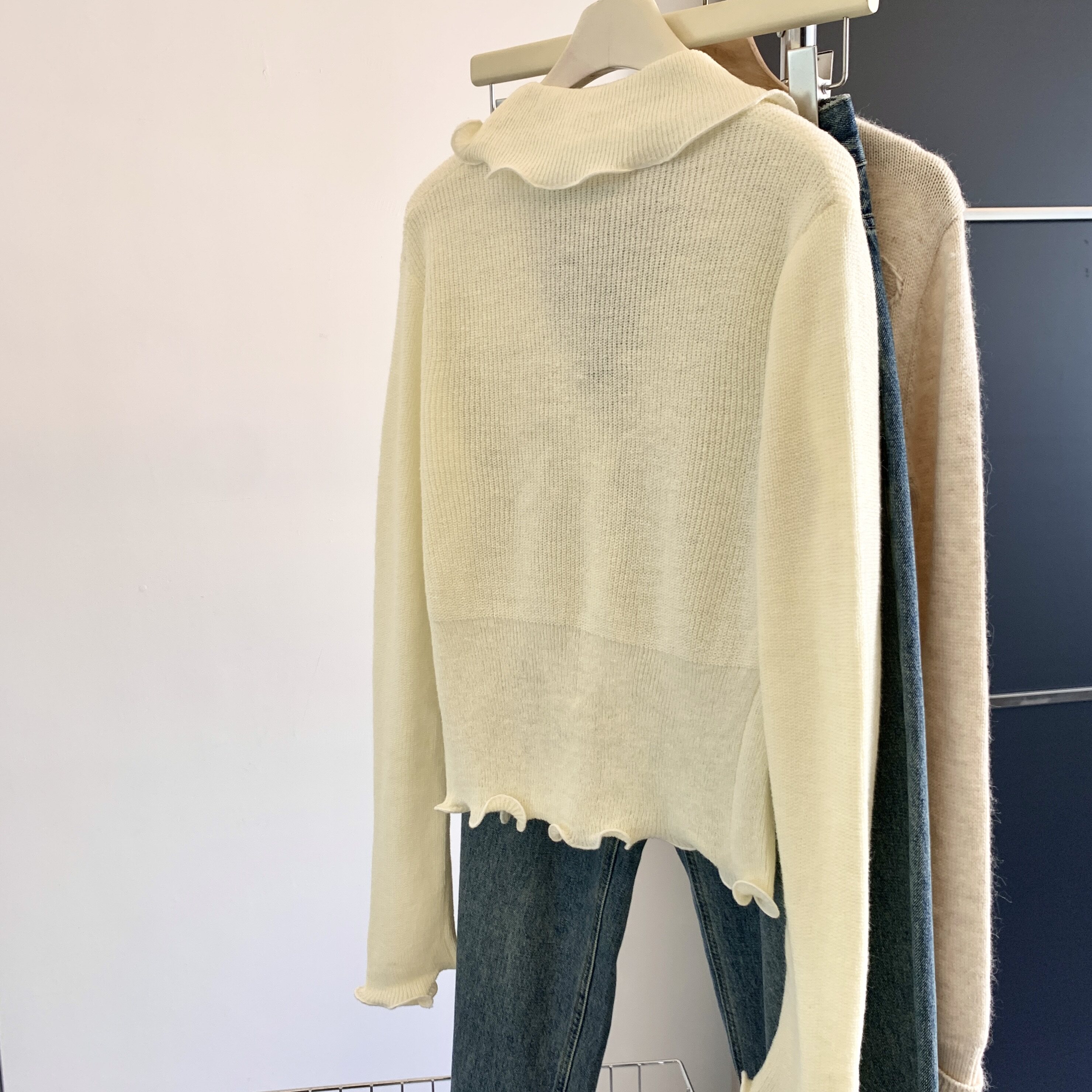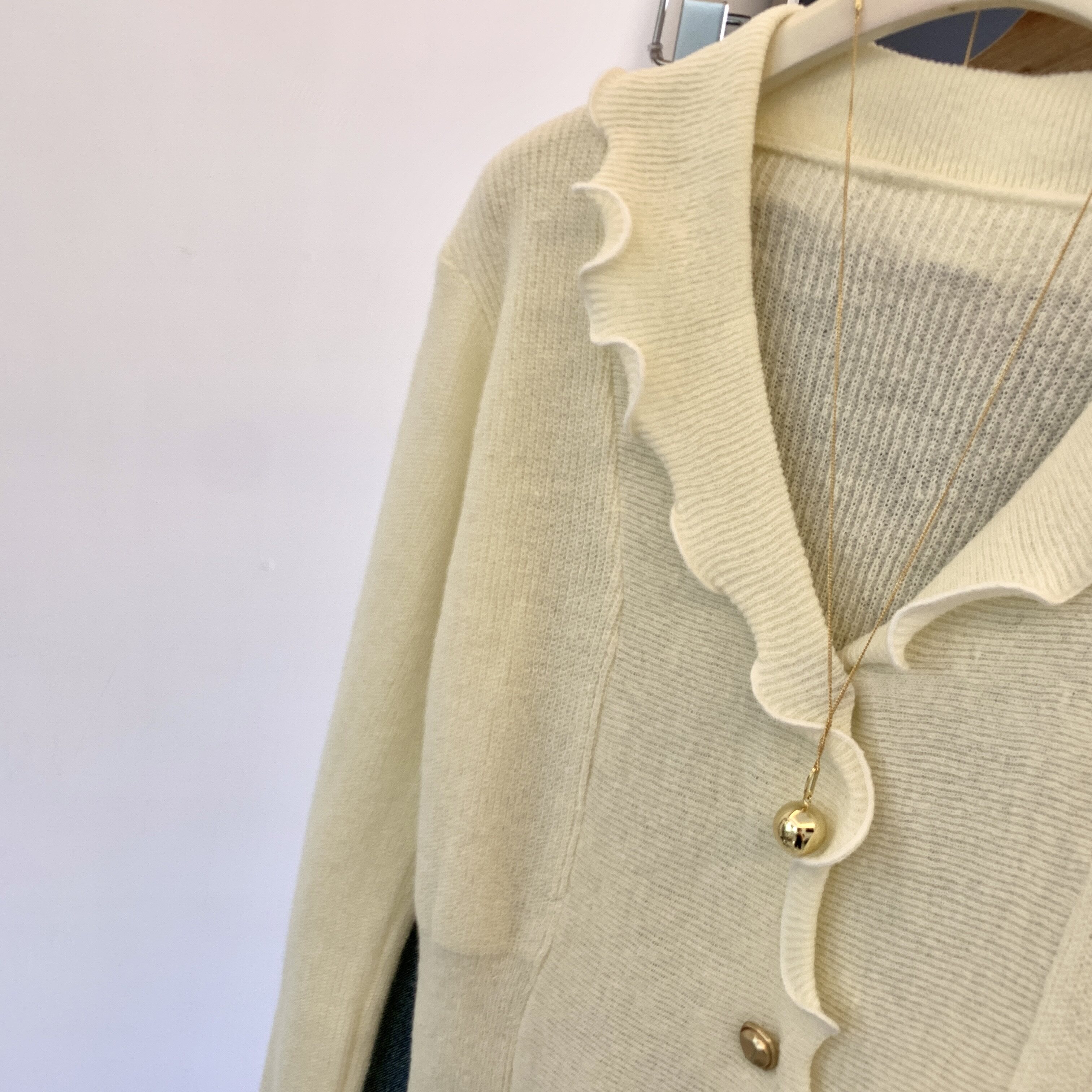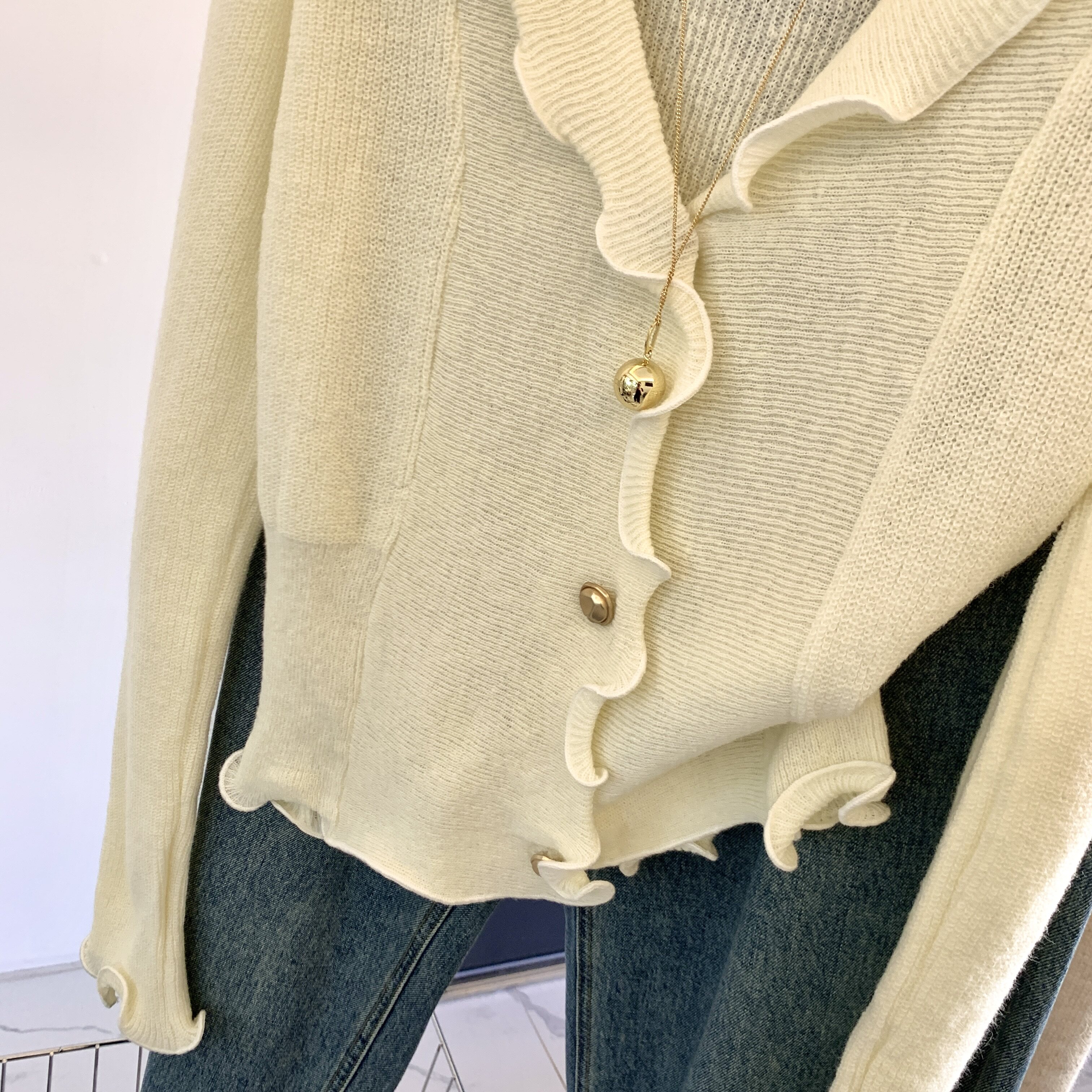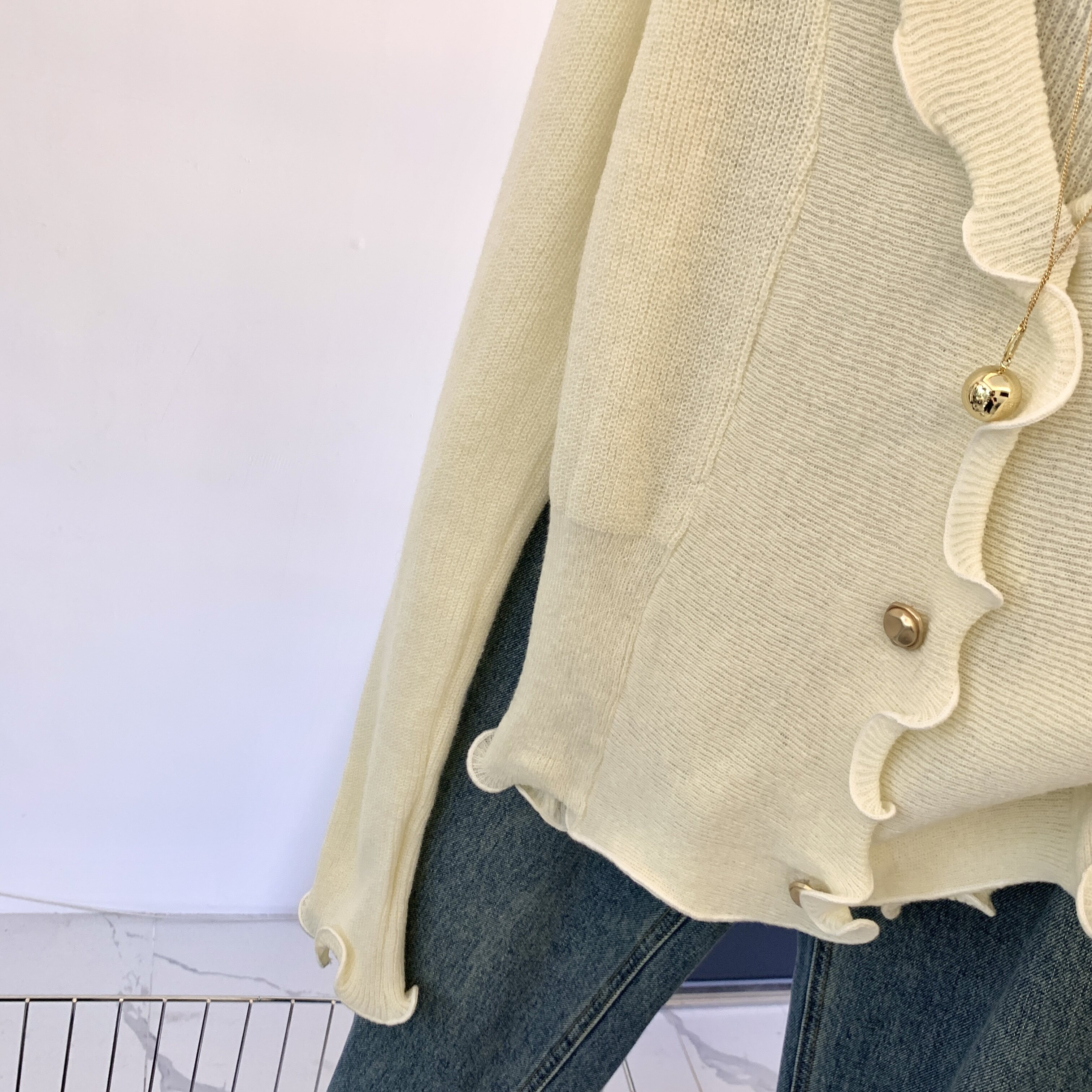 專櫃撤廻剪標法式木耳邊V領針織開衫女春季新款獨特顯瘦別致上衣
