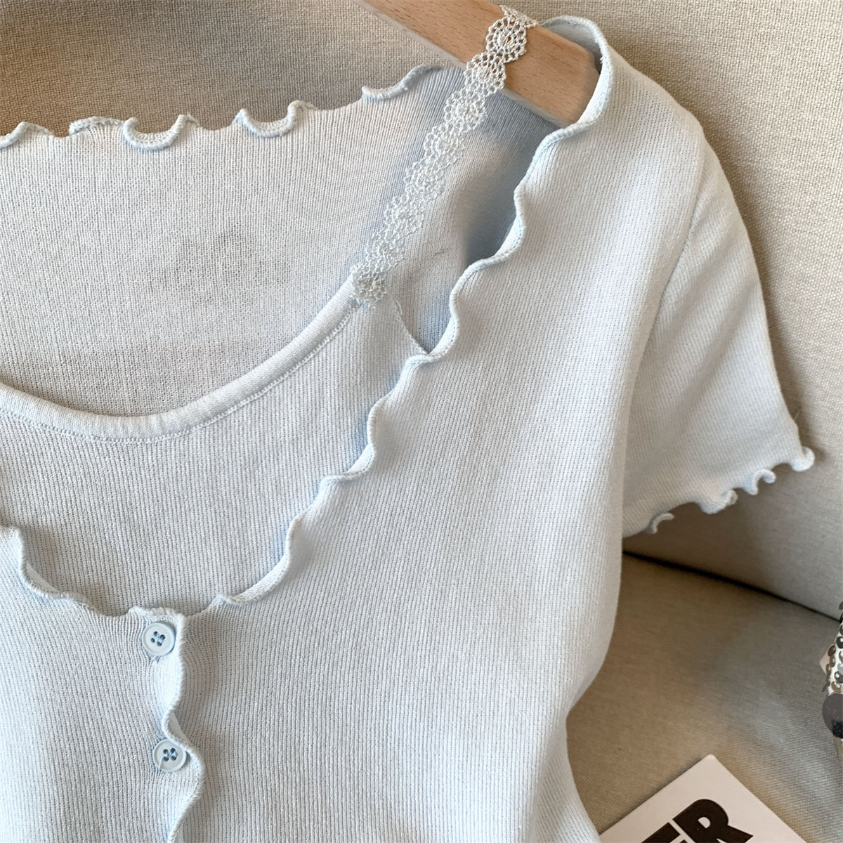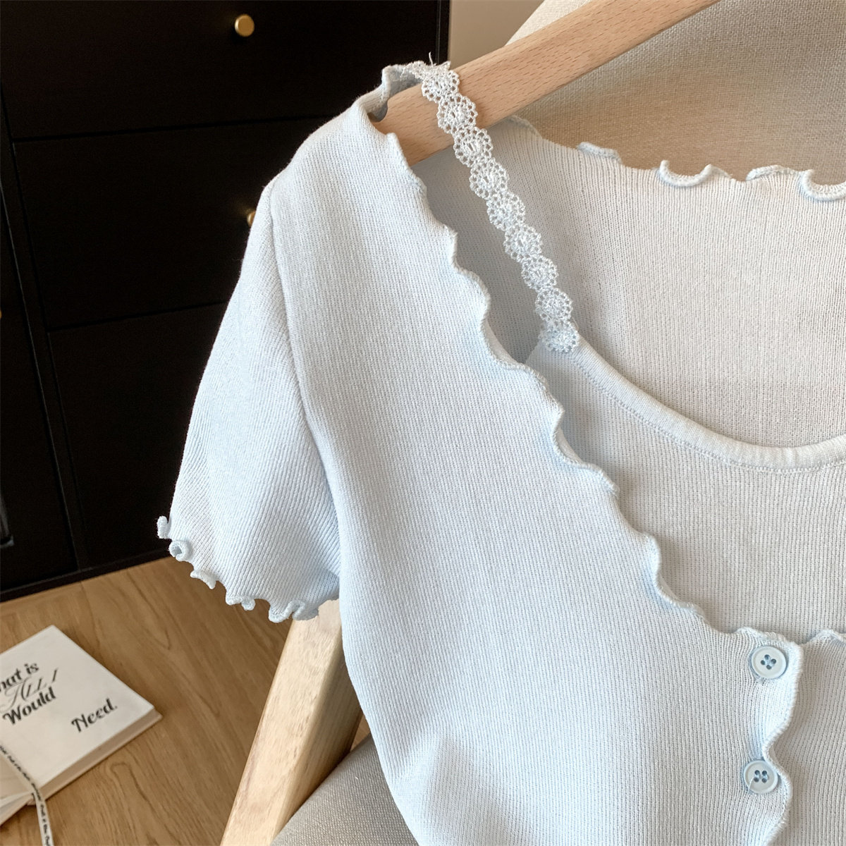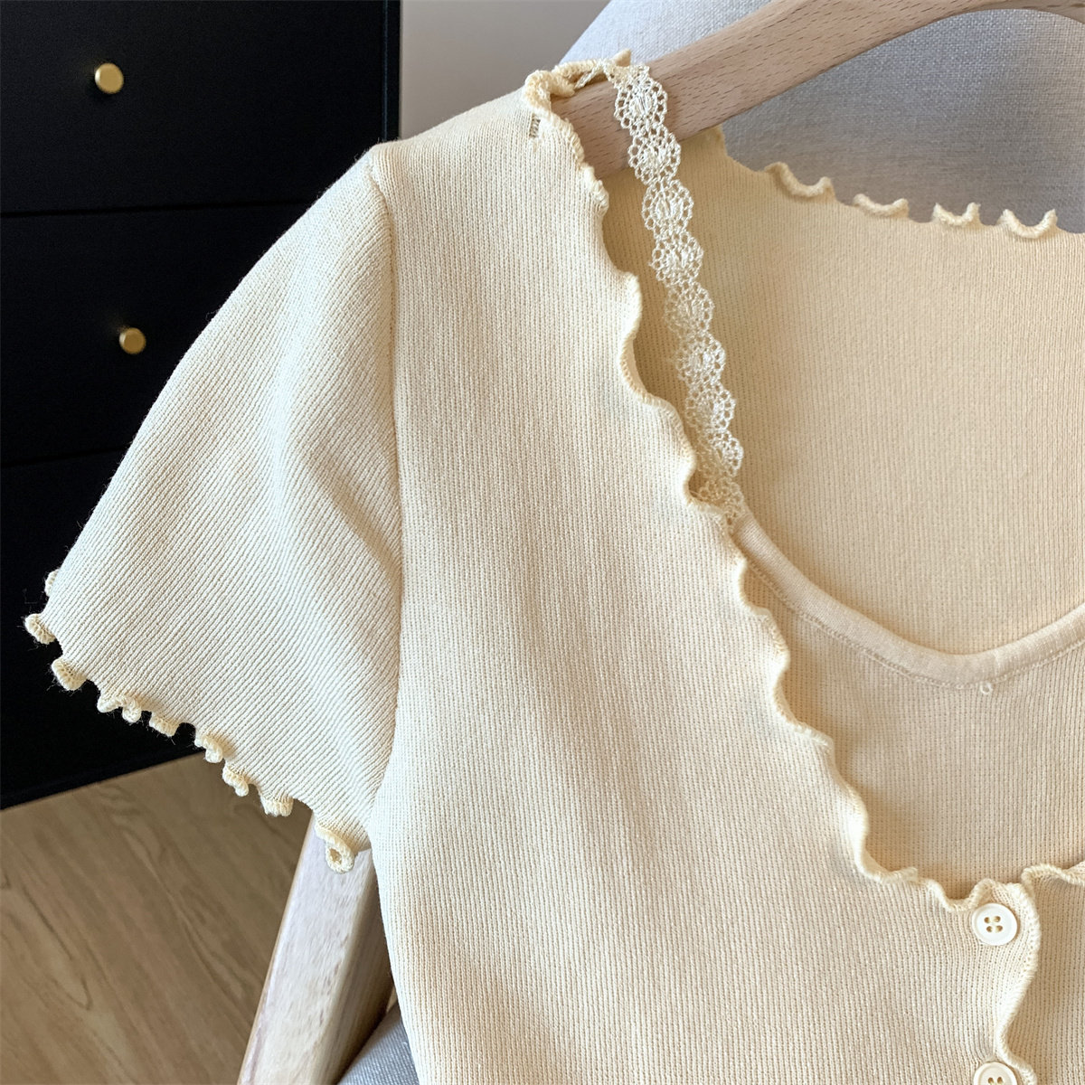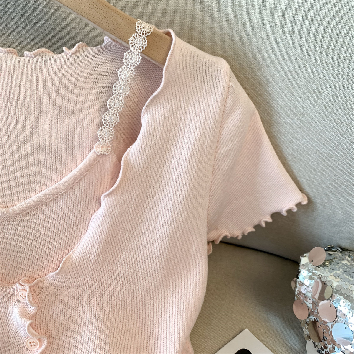 專櫃撤廻剪標甜辣妹假兩件木耳邊針織衫女夏季新款溫柔減齡短上衣