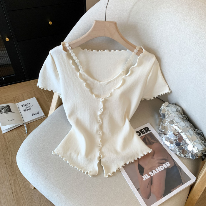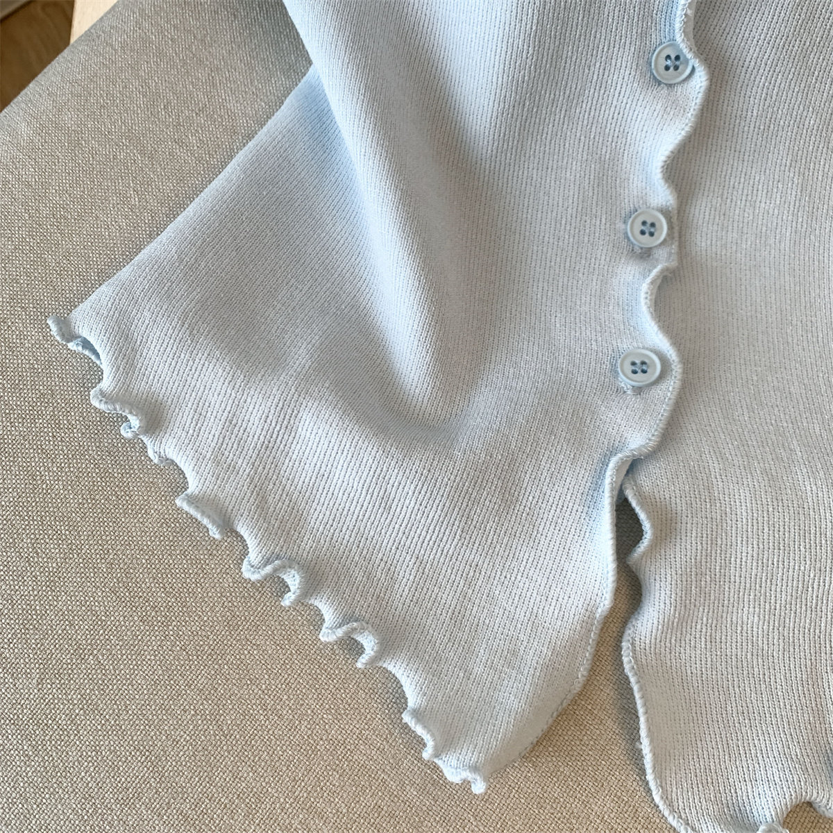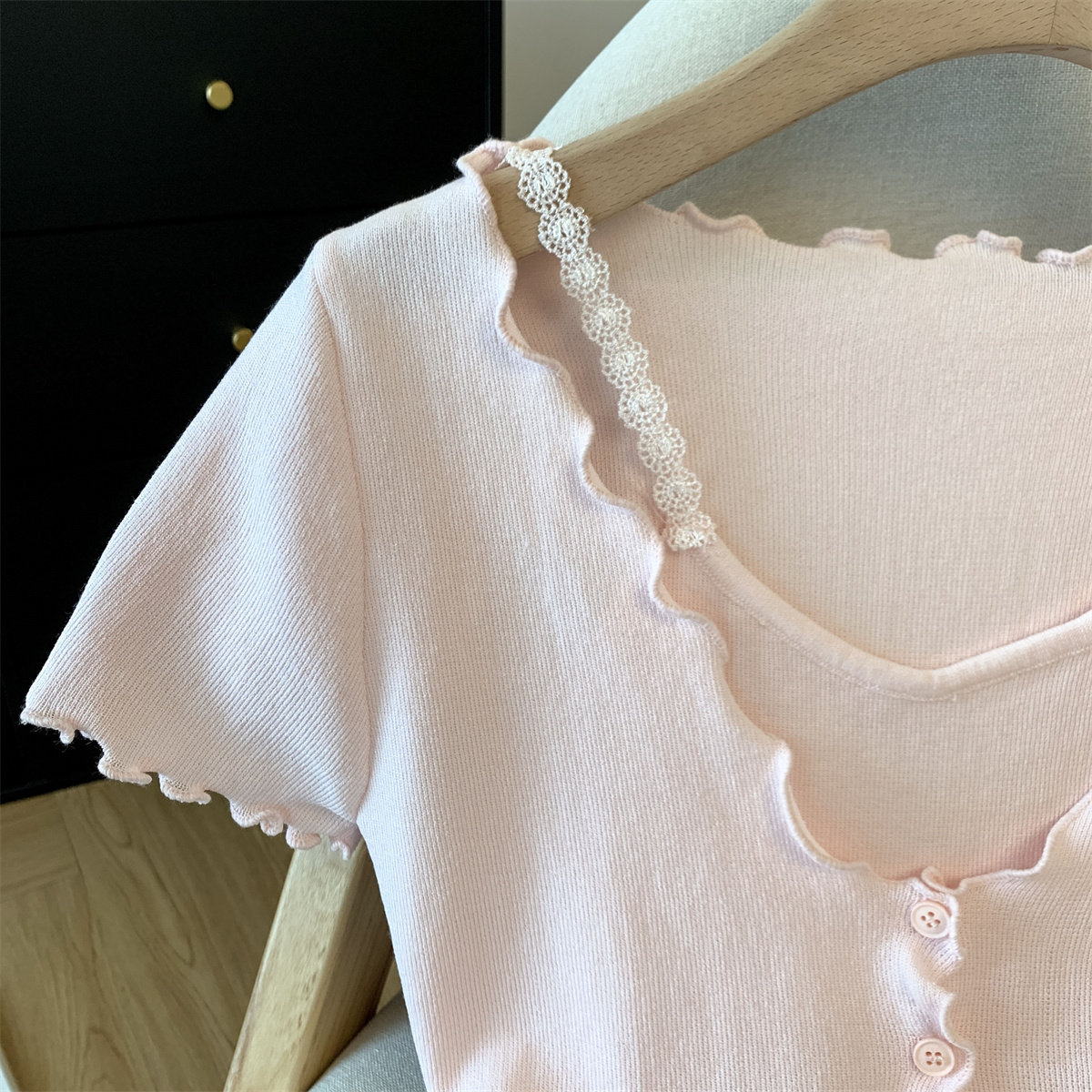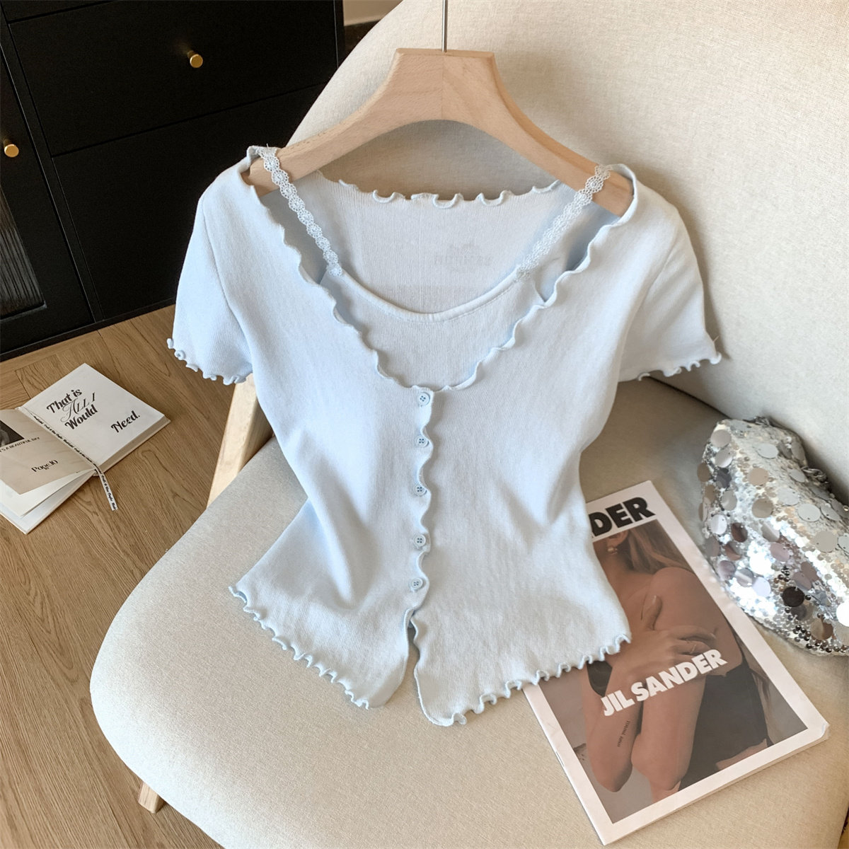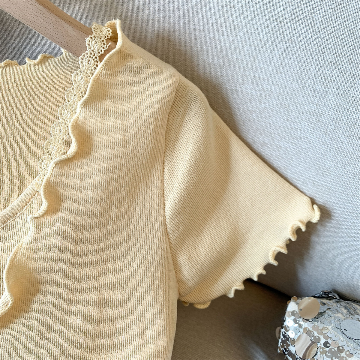 專櫃撤廻剪標甜辣妹假兩件木耳邊針織衫女夏季新款溫柔減齡短上衣