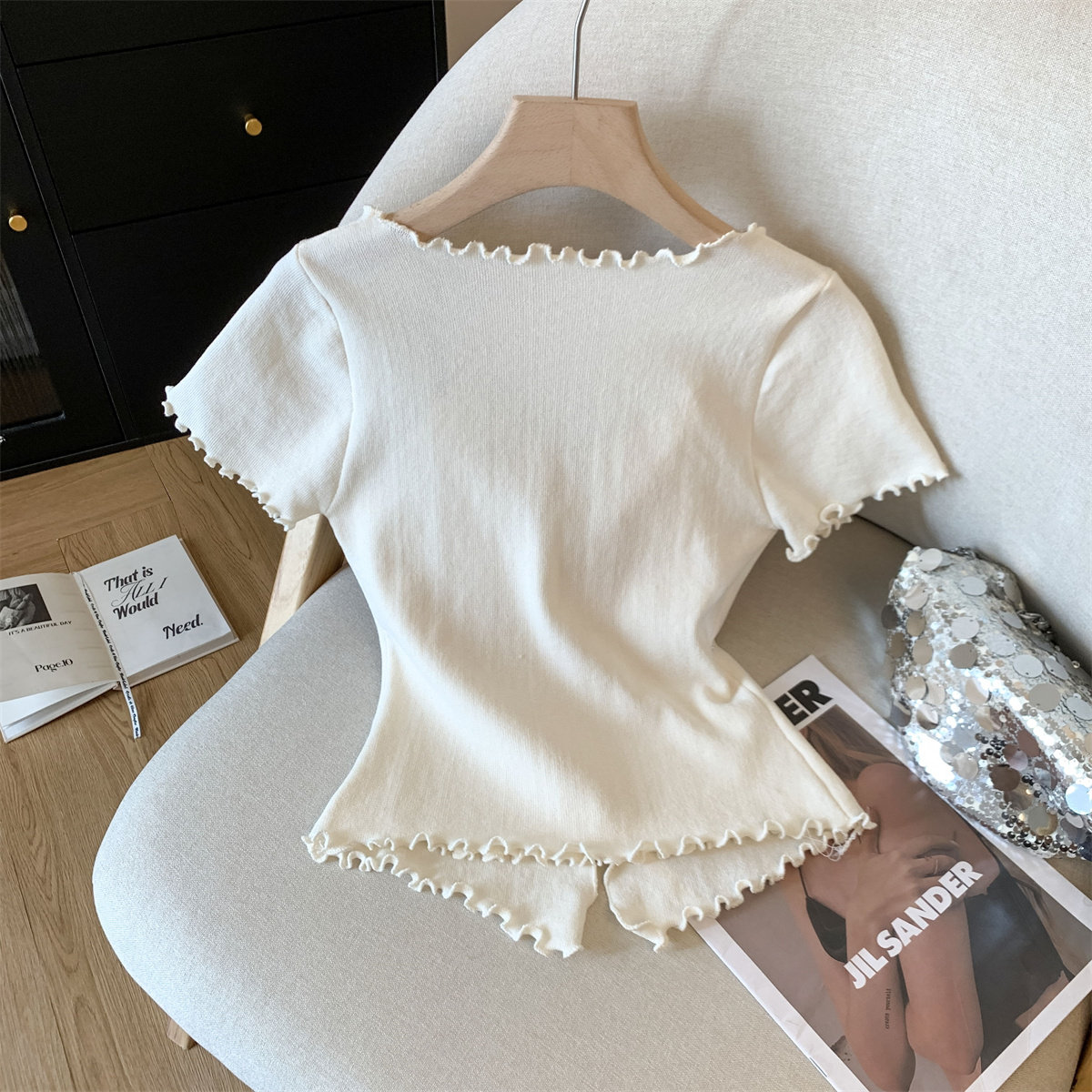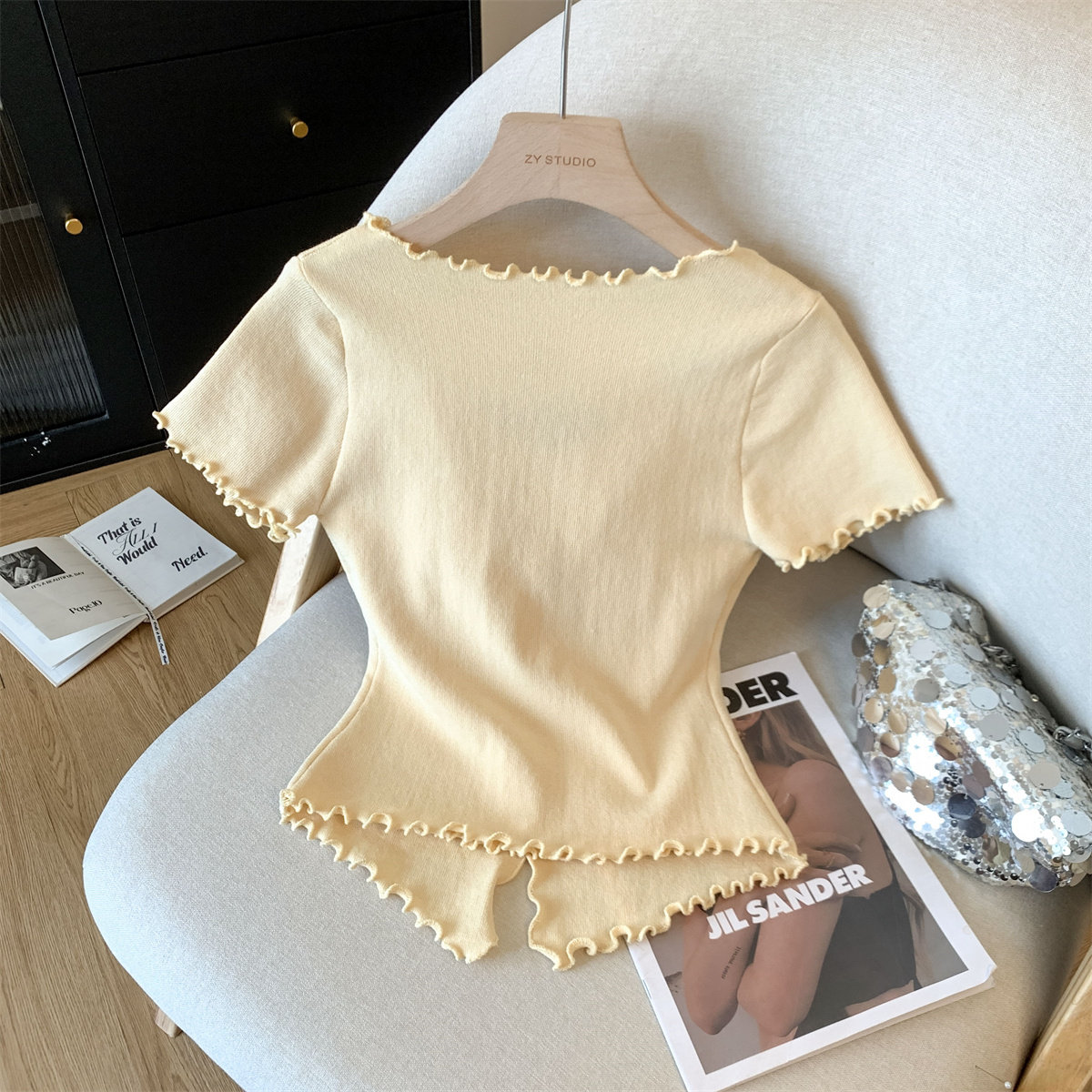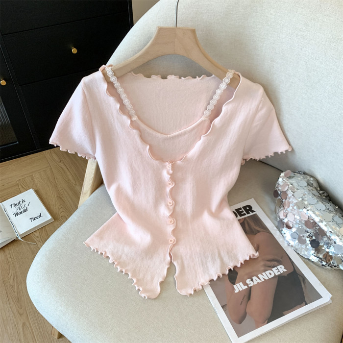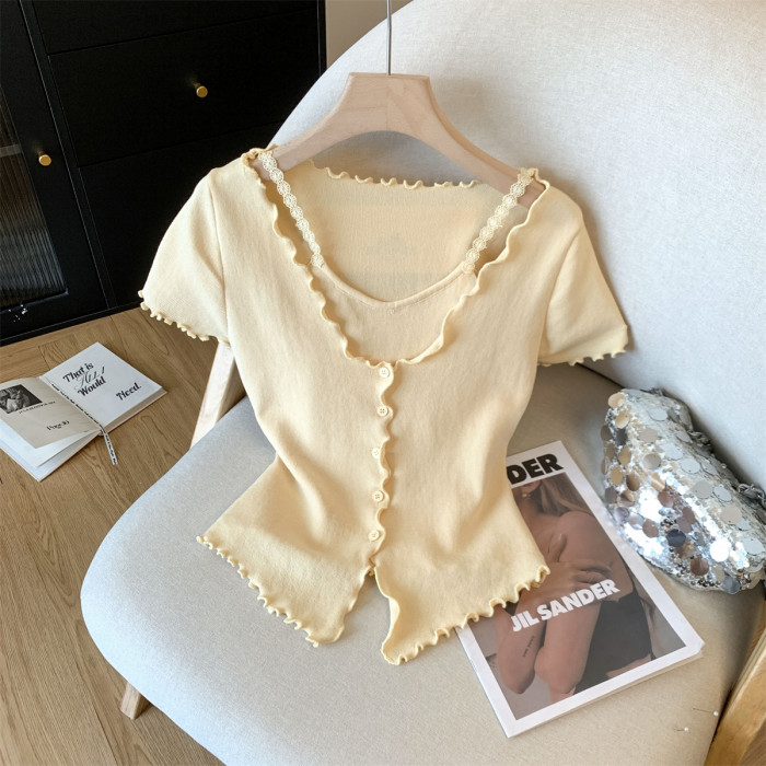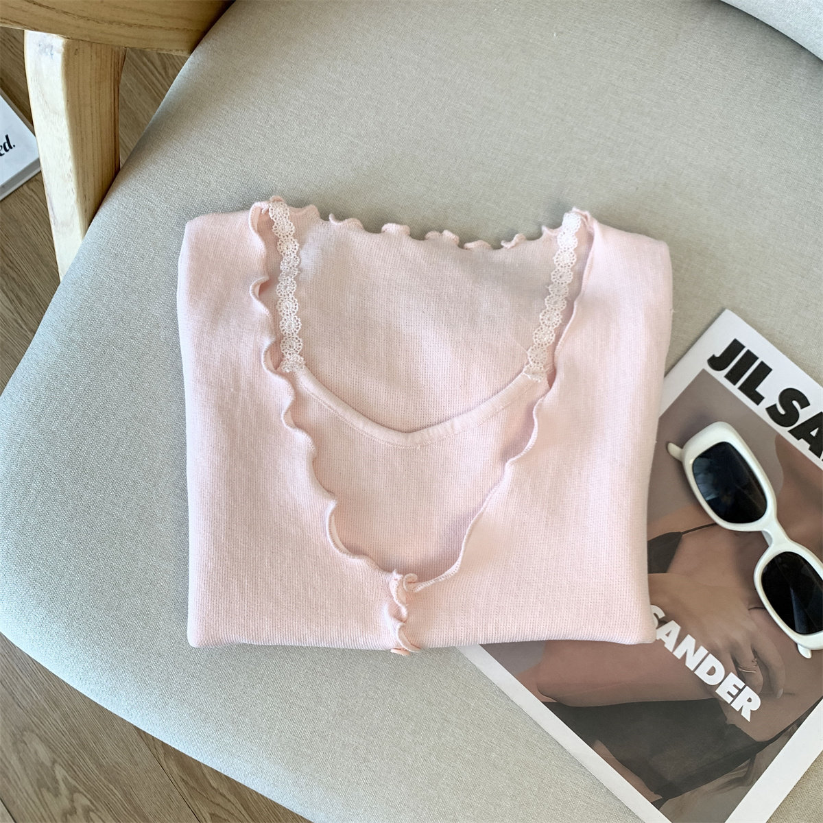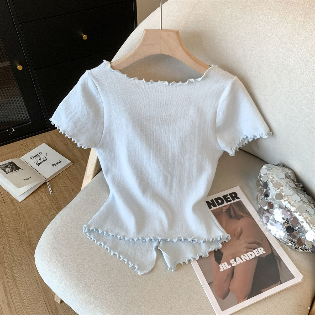 專櫃撤廻剪標甜辣妹假兩件木耳邊針織衫女夏季新款溫柔減齡短上衣