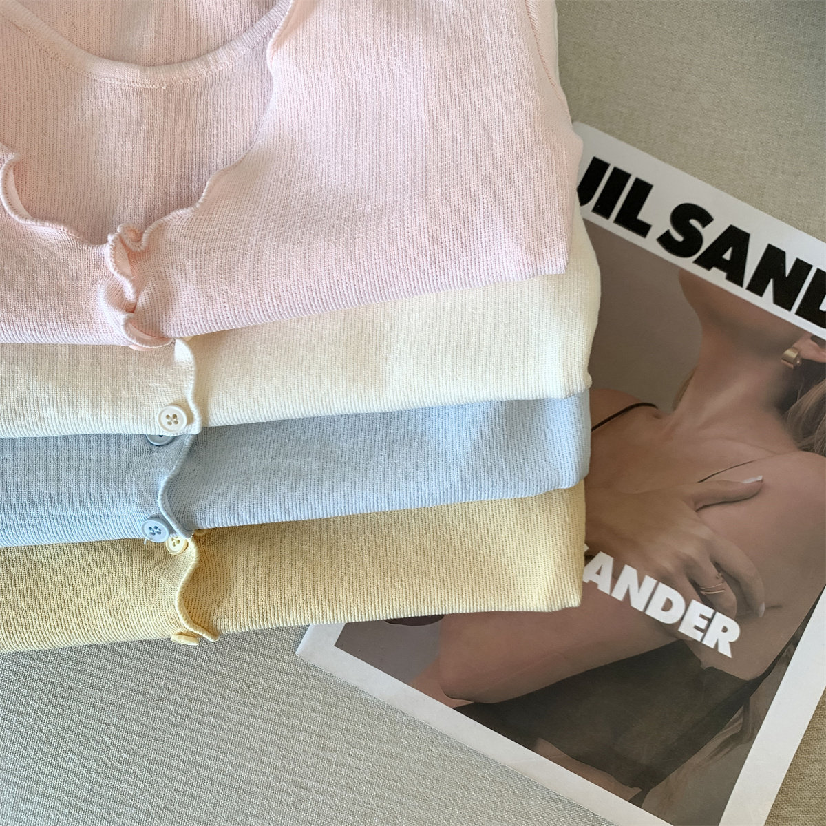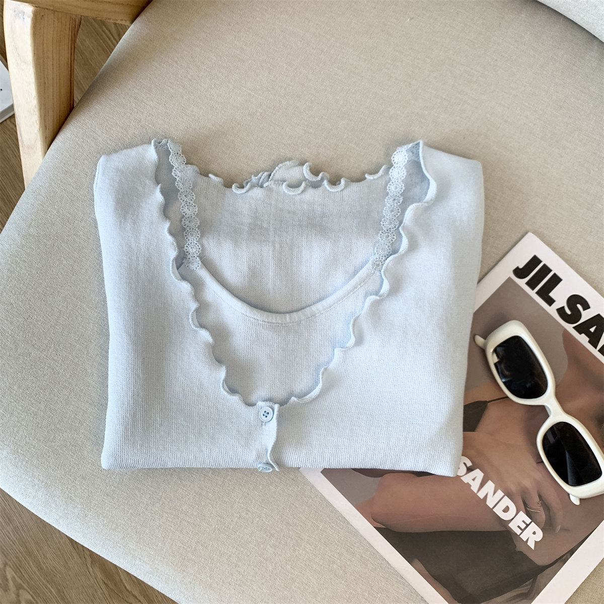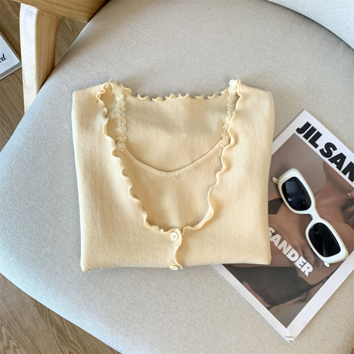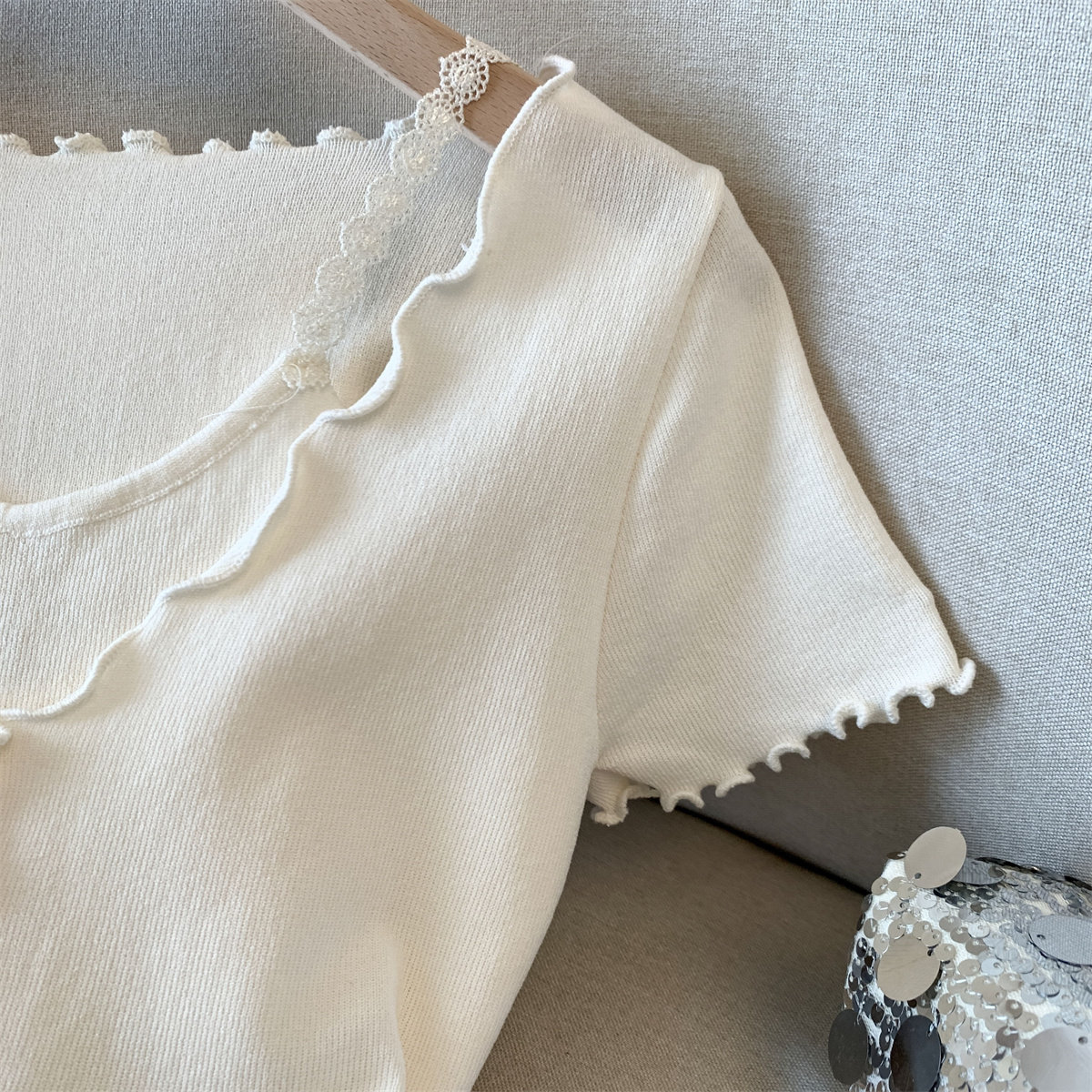 專櫃撤廻剪標甜辣妹假兩件木耳邊針織衫女夏季新款溫柔減齡短上衣