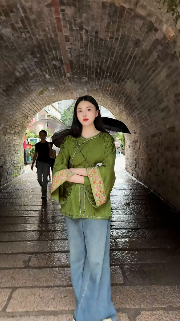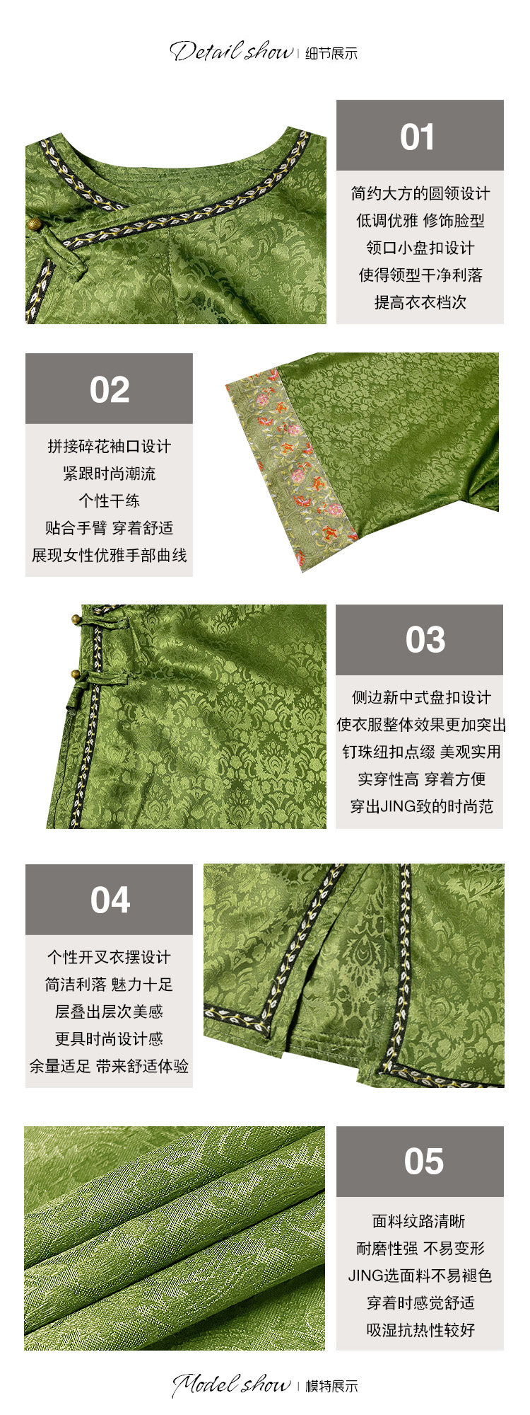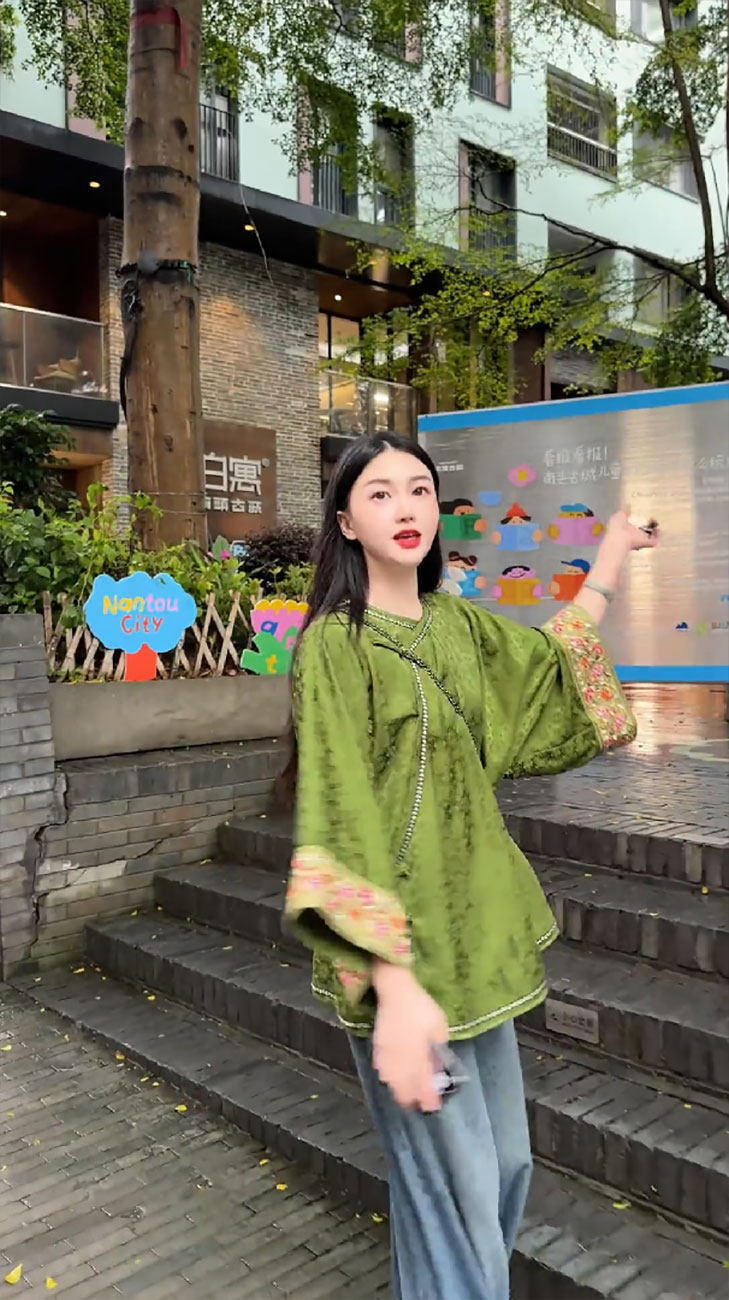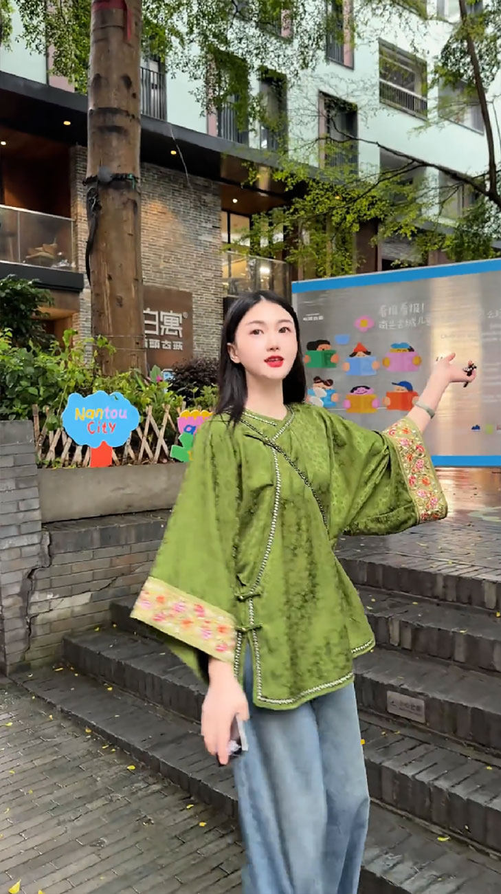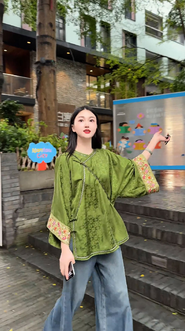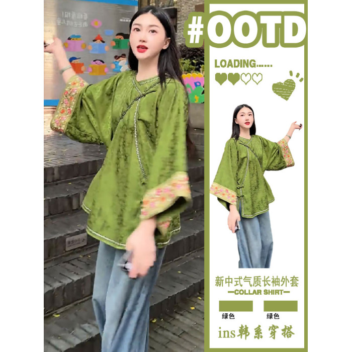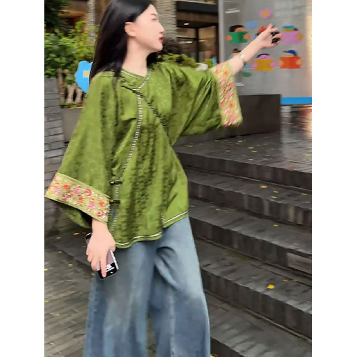 新中式大碼綠色國風襯衫外套女秋2025新款盤釦唐裝上衣喇叭袖襯衣
