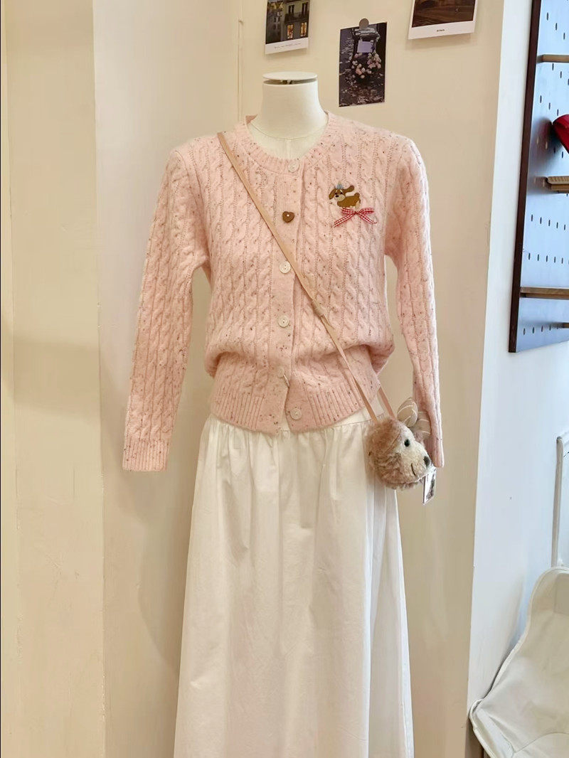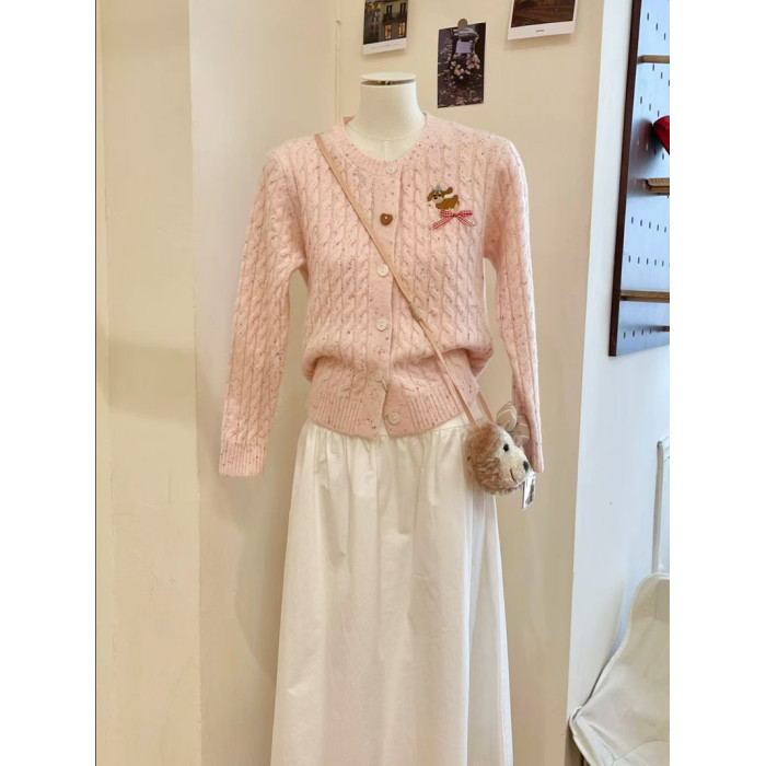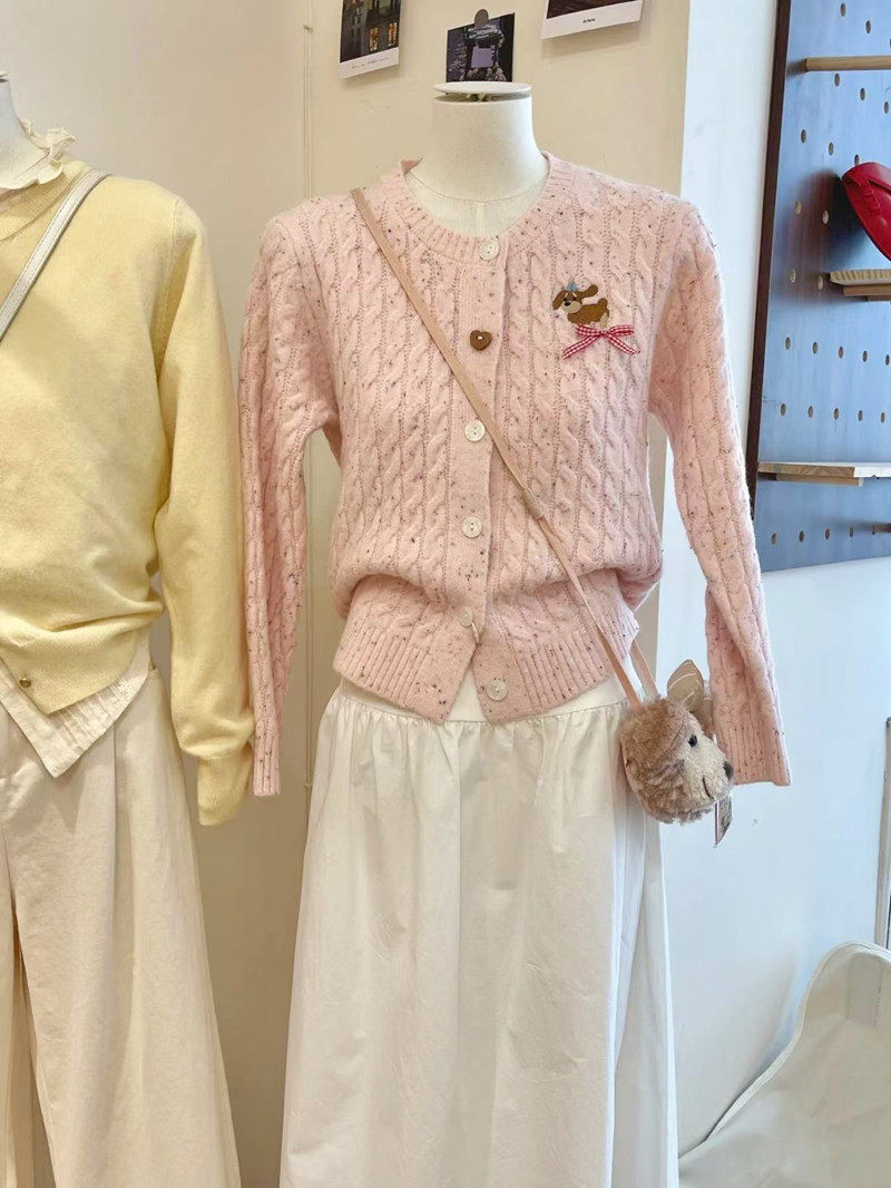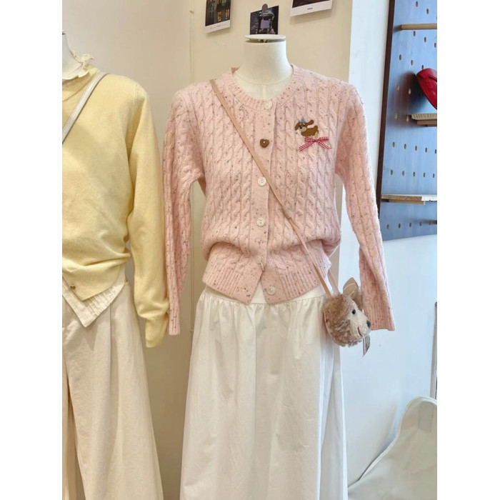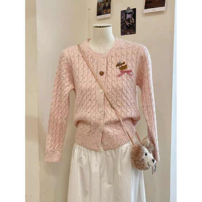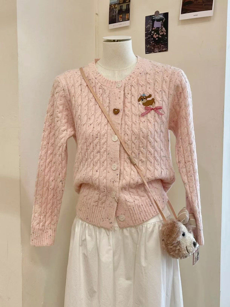 專櫃撤廻剪標粉色甜美刺綉麻花針織開衫女秋冬高級感彩點軟糯毛衣