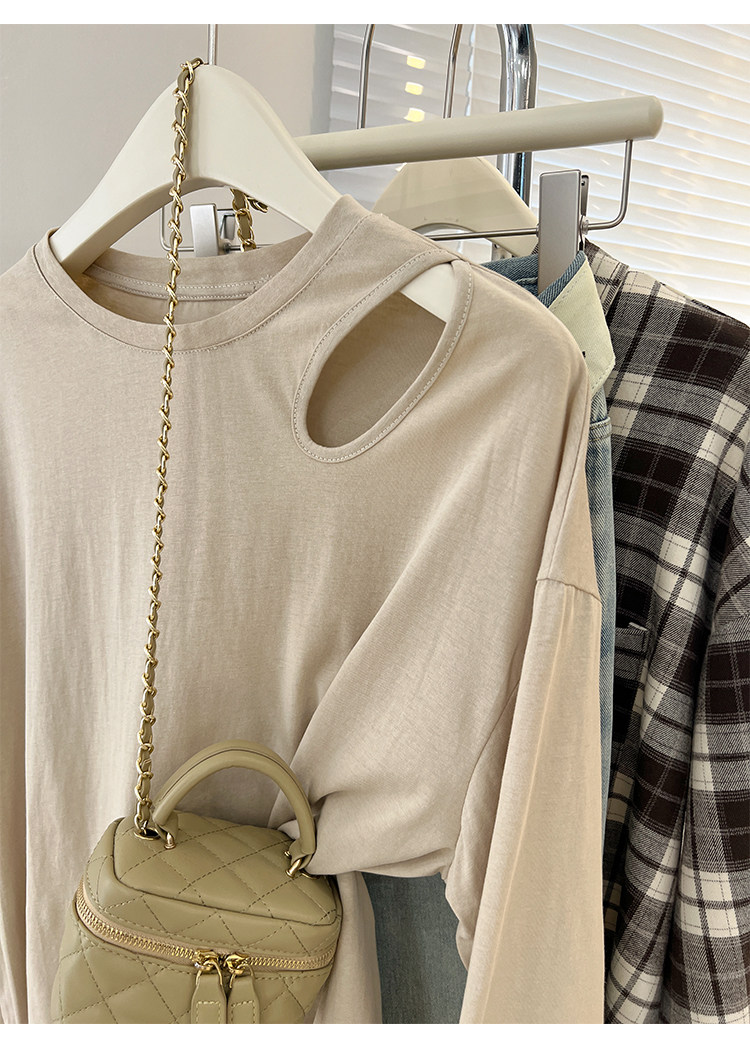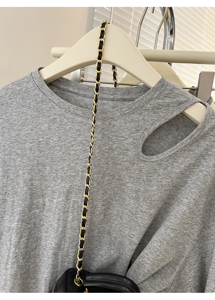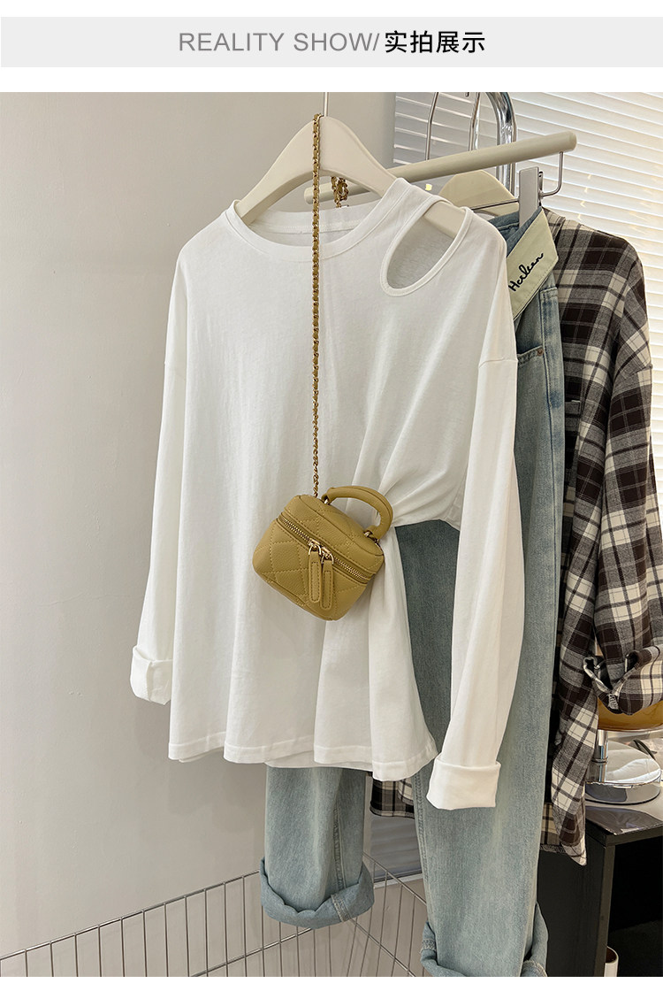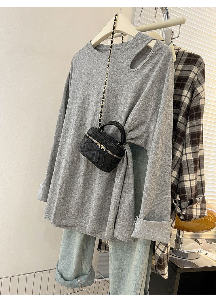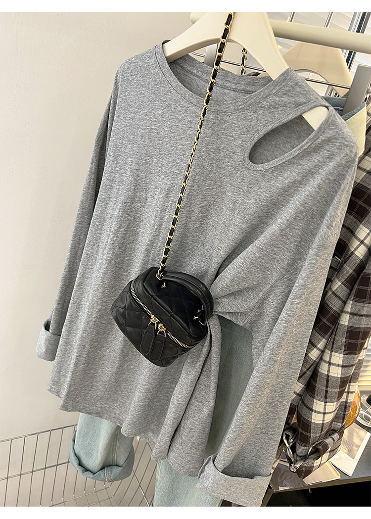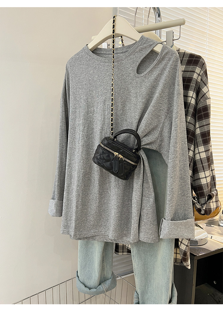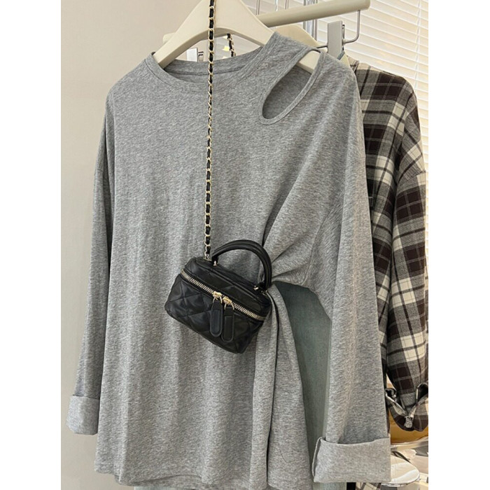 南油輕奢高貨撿漏!設計感灰色露肩t恤女2025秋季寬鬆顯瘦長袖上衣