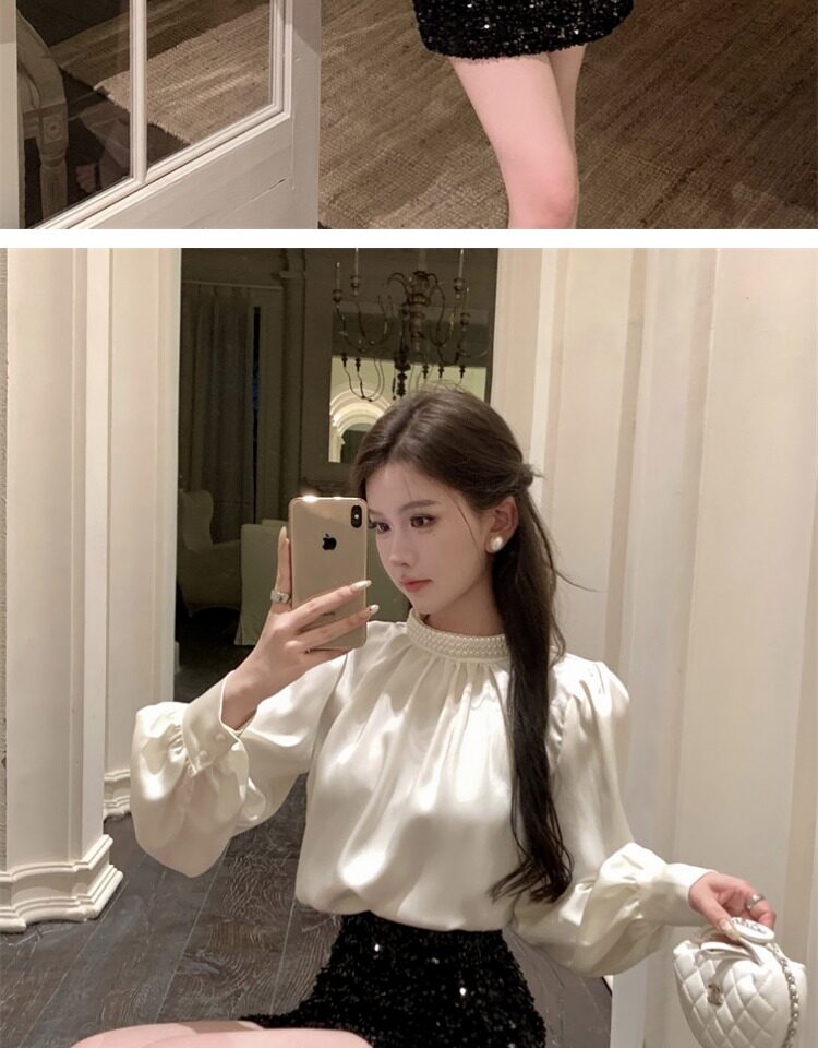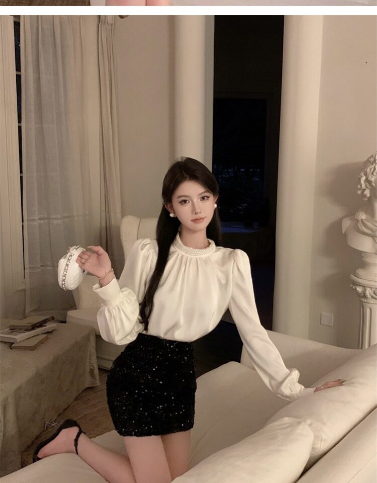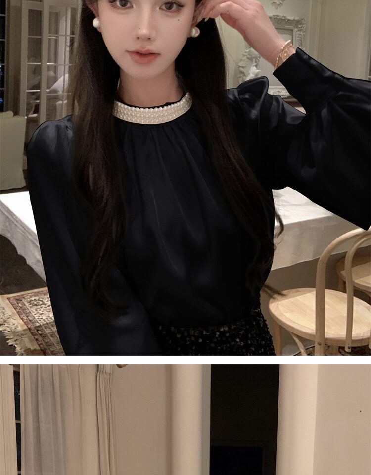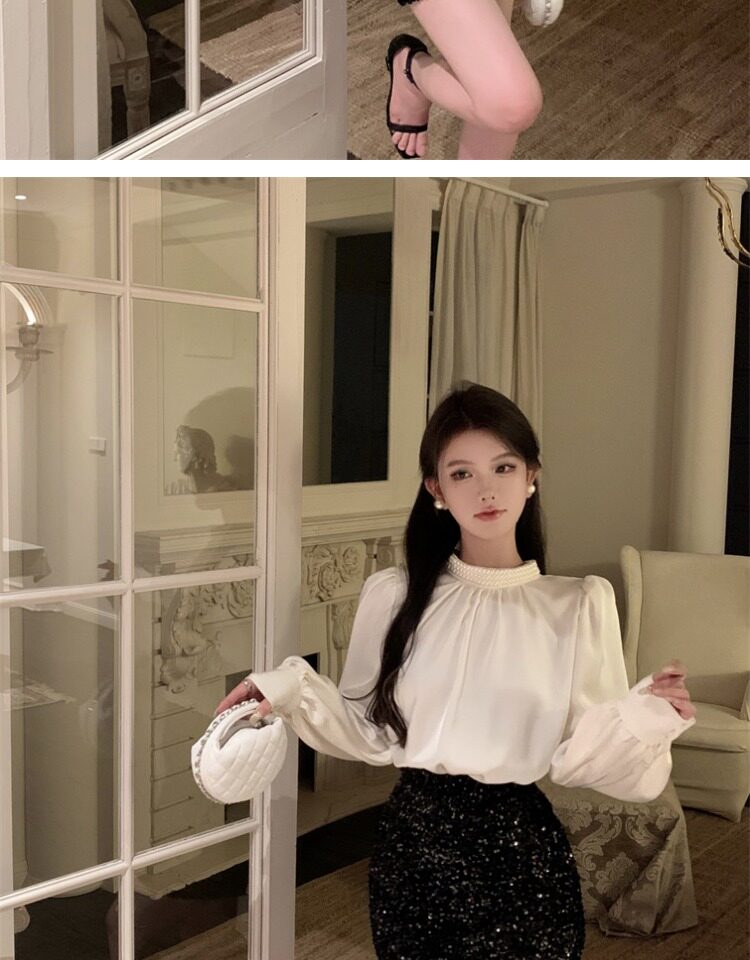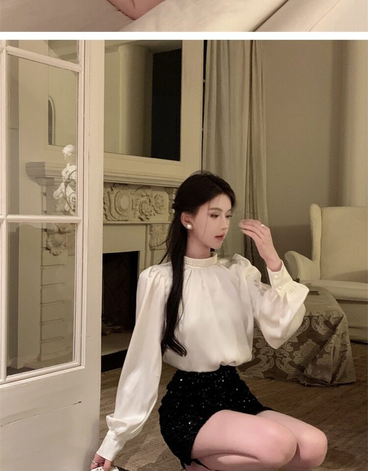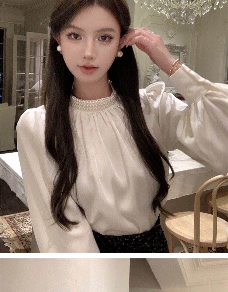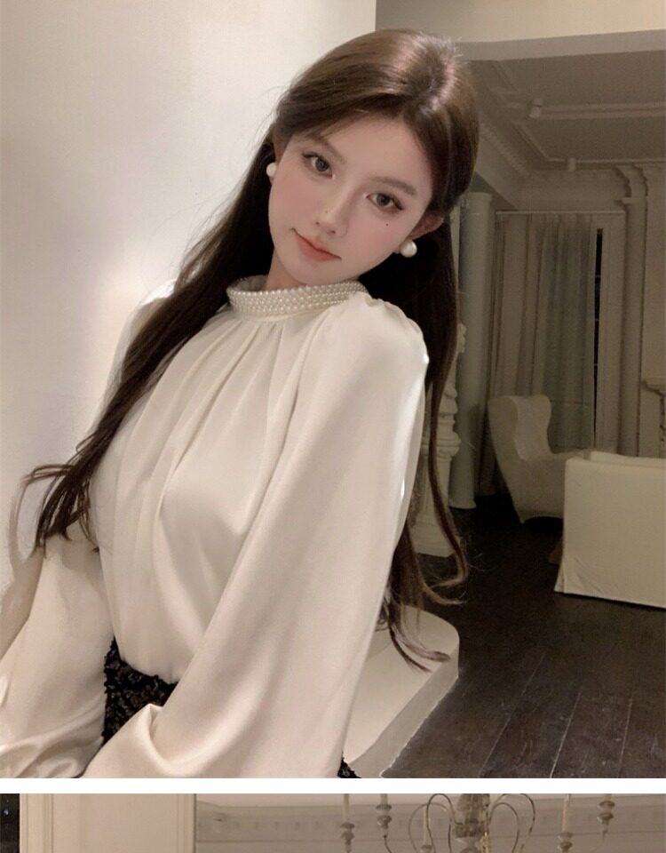法式富家千金襯衫女宮廷風輕奢高級感穿搭珍珠緞面白色小資上衣