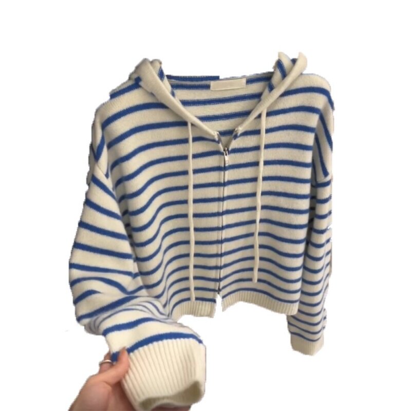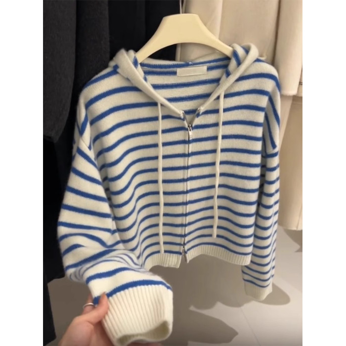 廣州十三行冬季女裝藍色條紋連帽外穿針織開衫慵懶松弛感毛衣外套
