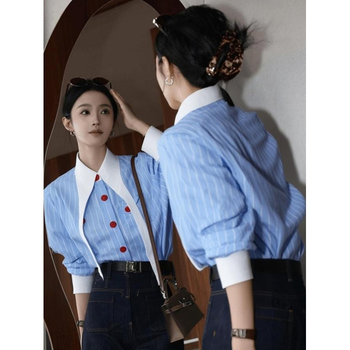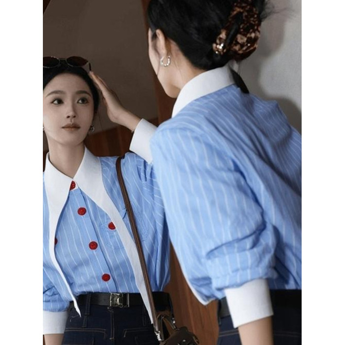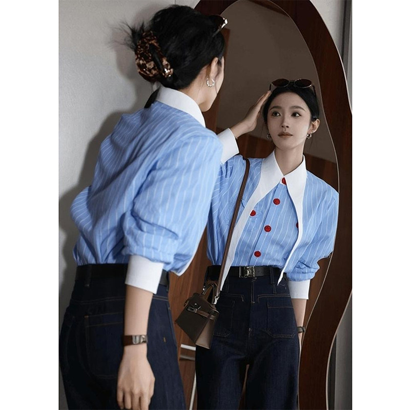法式繙領藍色條紋襯衫女高級設計感慵懶風寬鬆休閒長袖上衣秋冬季