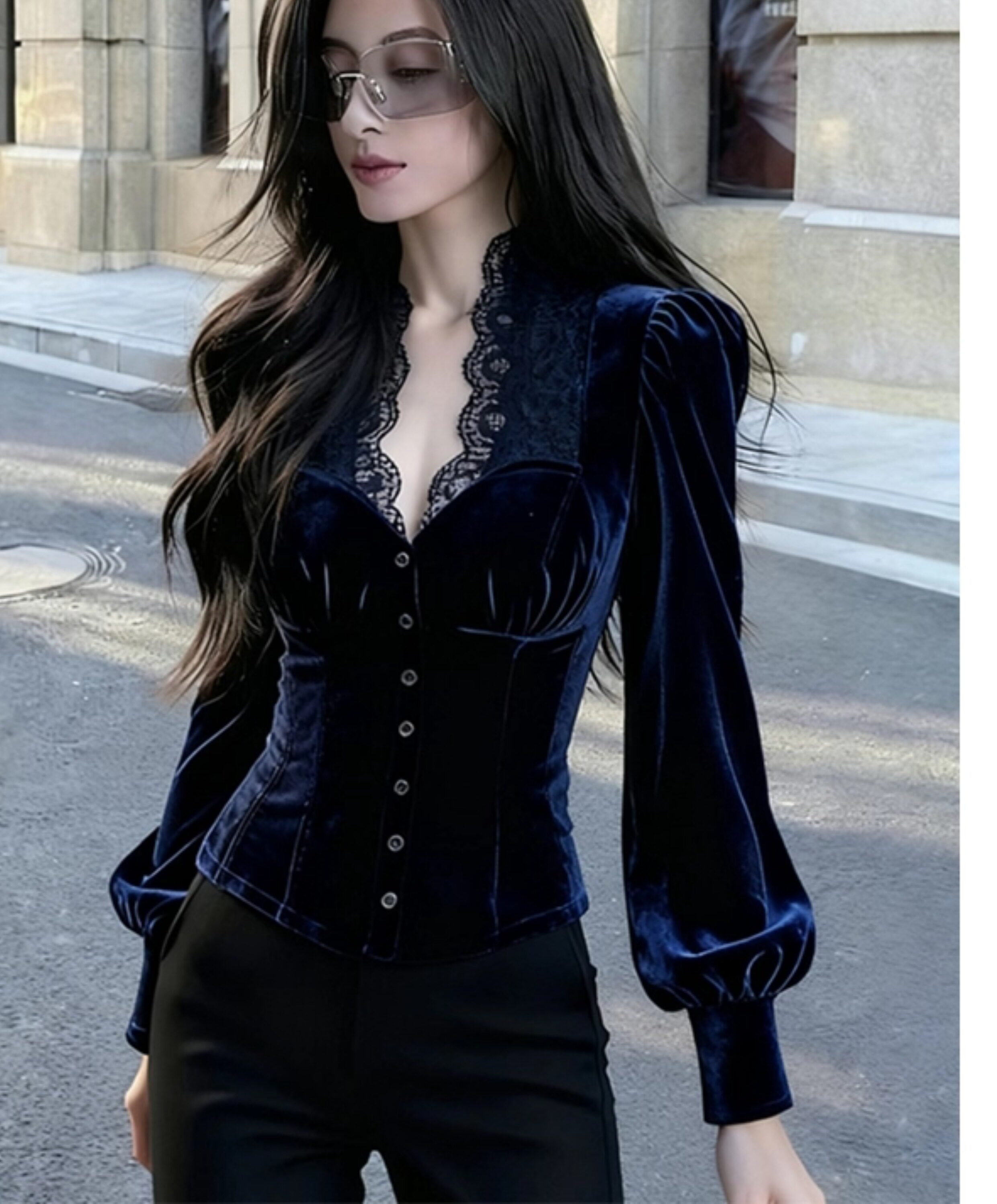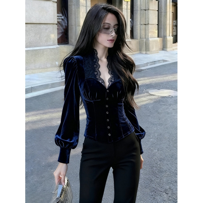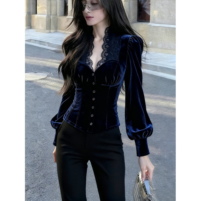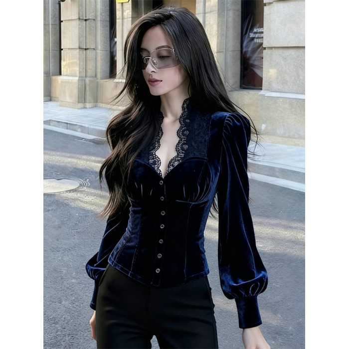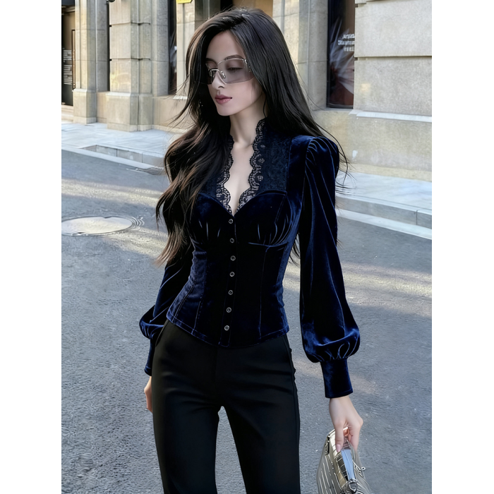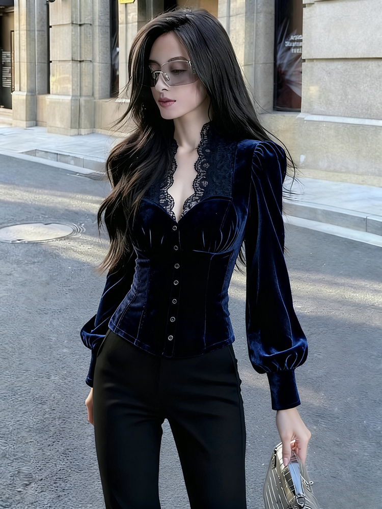 輕熟風藍色蕾絲拼接絲絨泡泡袖襯衫女2025年秋季新款奢華高級上衣