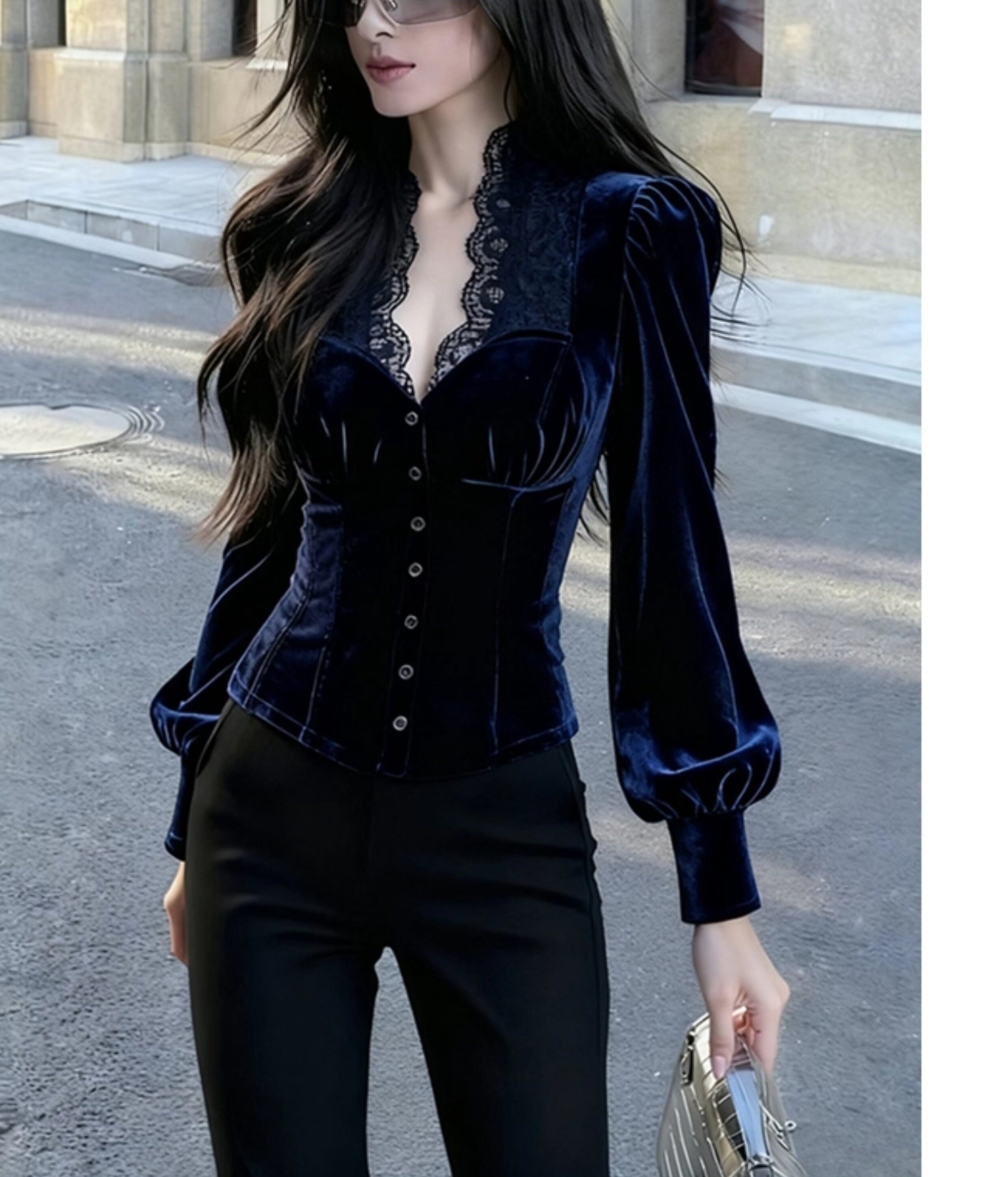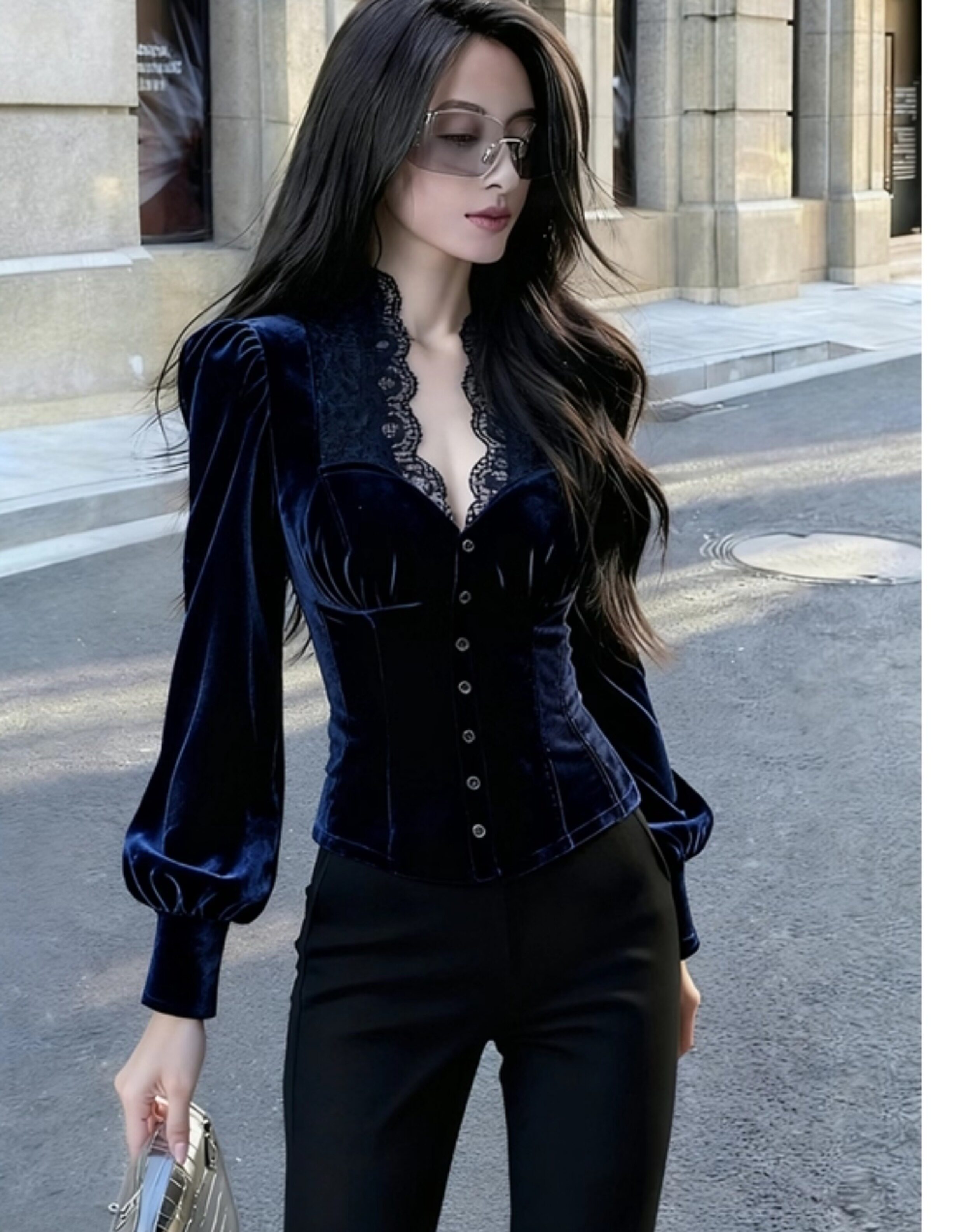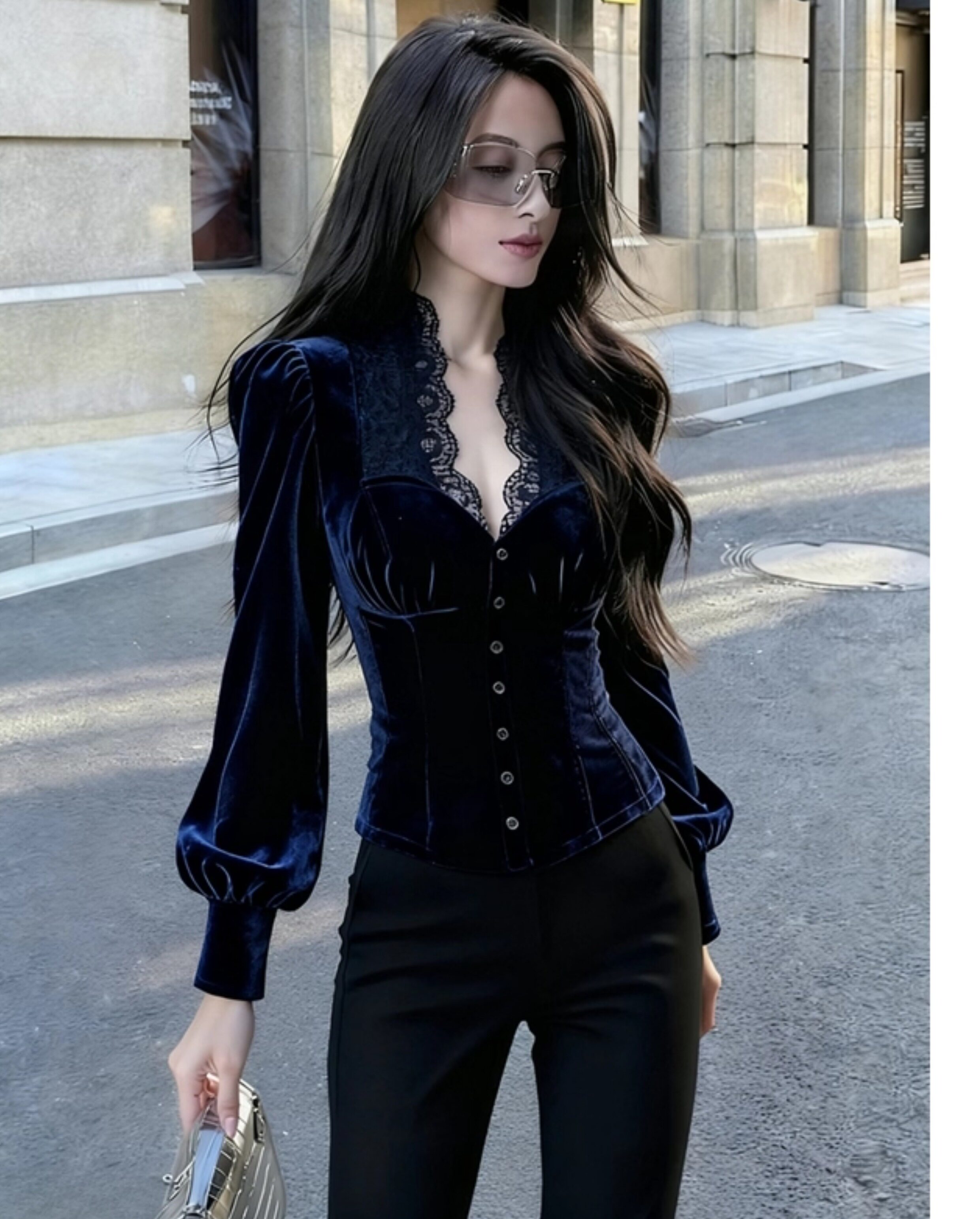 輕熟風藍色蕾絲拼接絲絨泡泡袖襯衫女2025年秋季新款奢華高級上衣