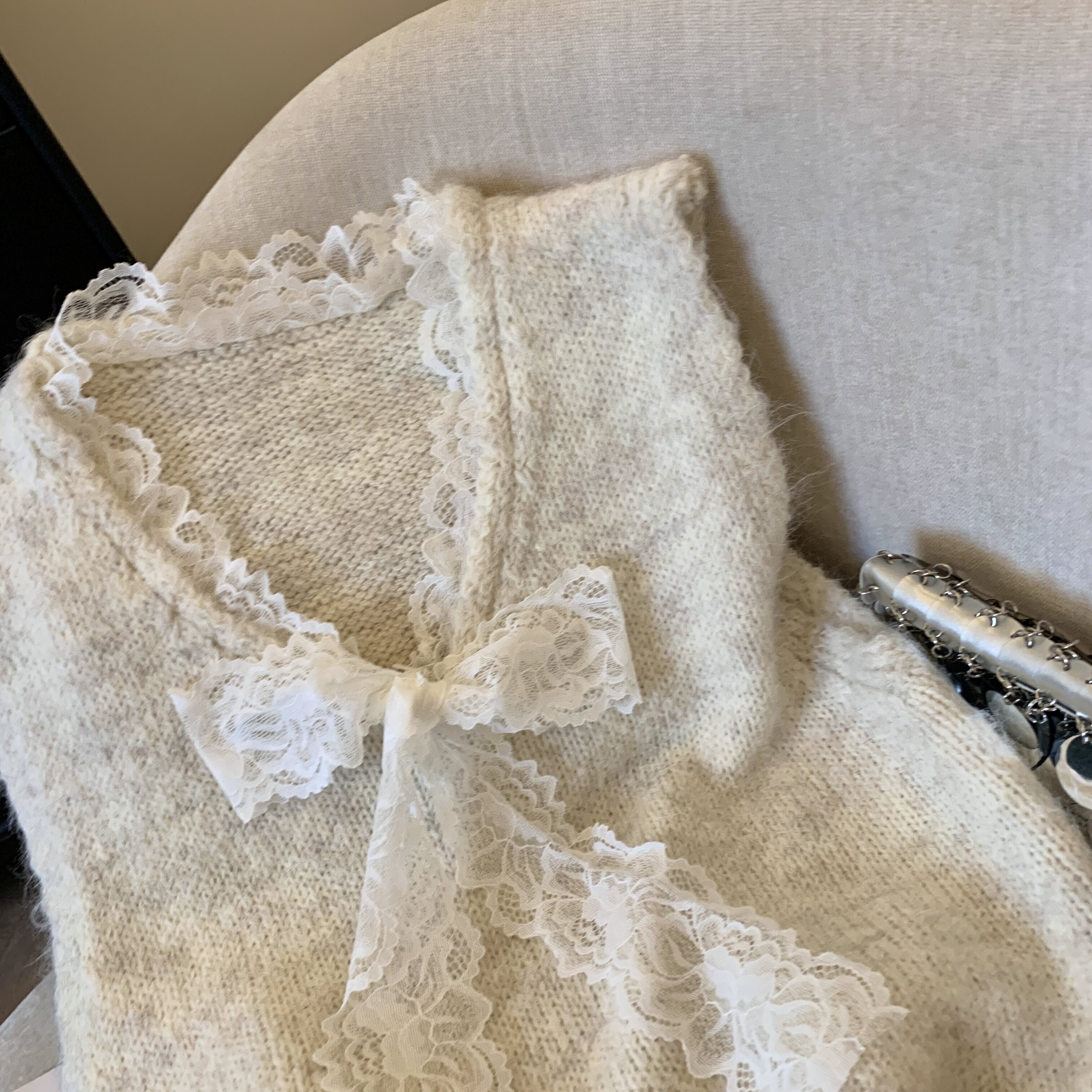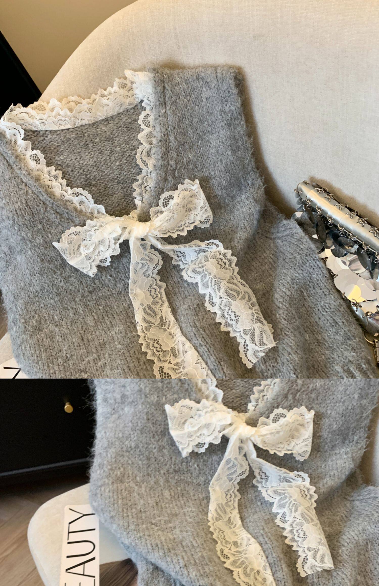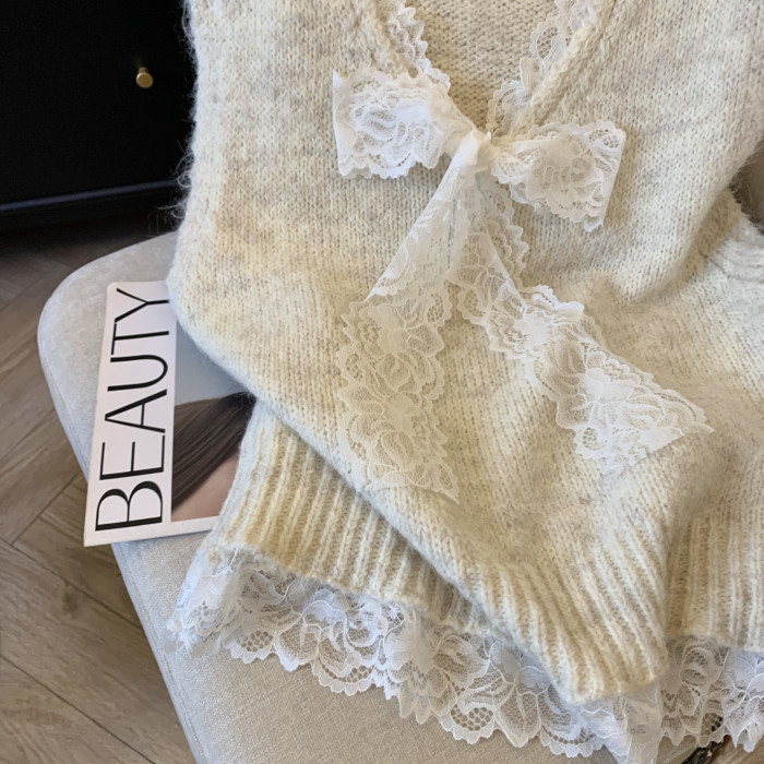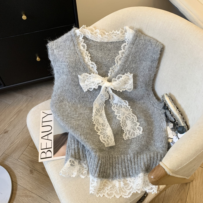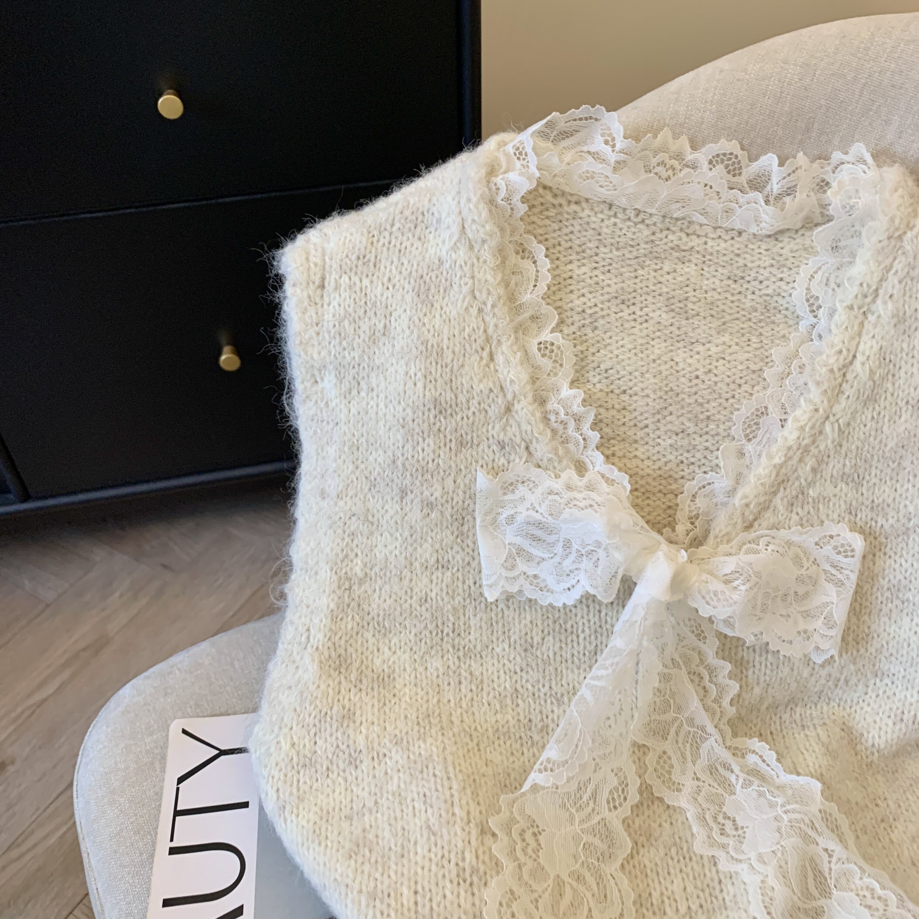 專櫃撤廻剪標系帶蝴蝶結V領馬甲女2025新款設計感蕾絲邊曡穿上衣
