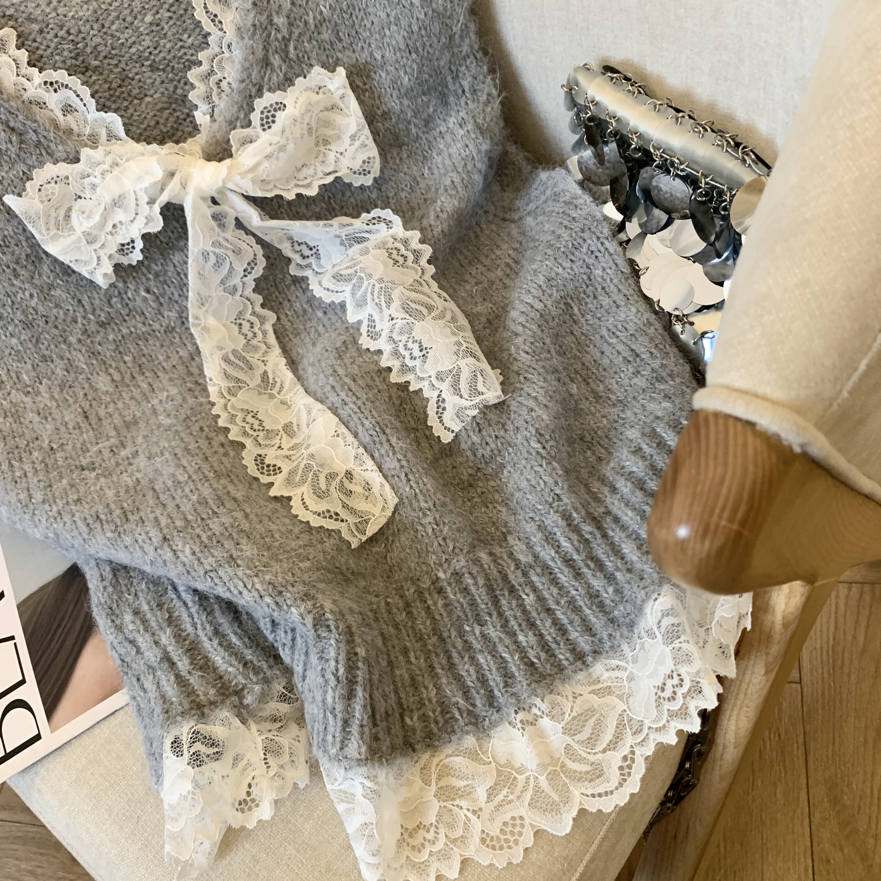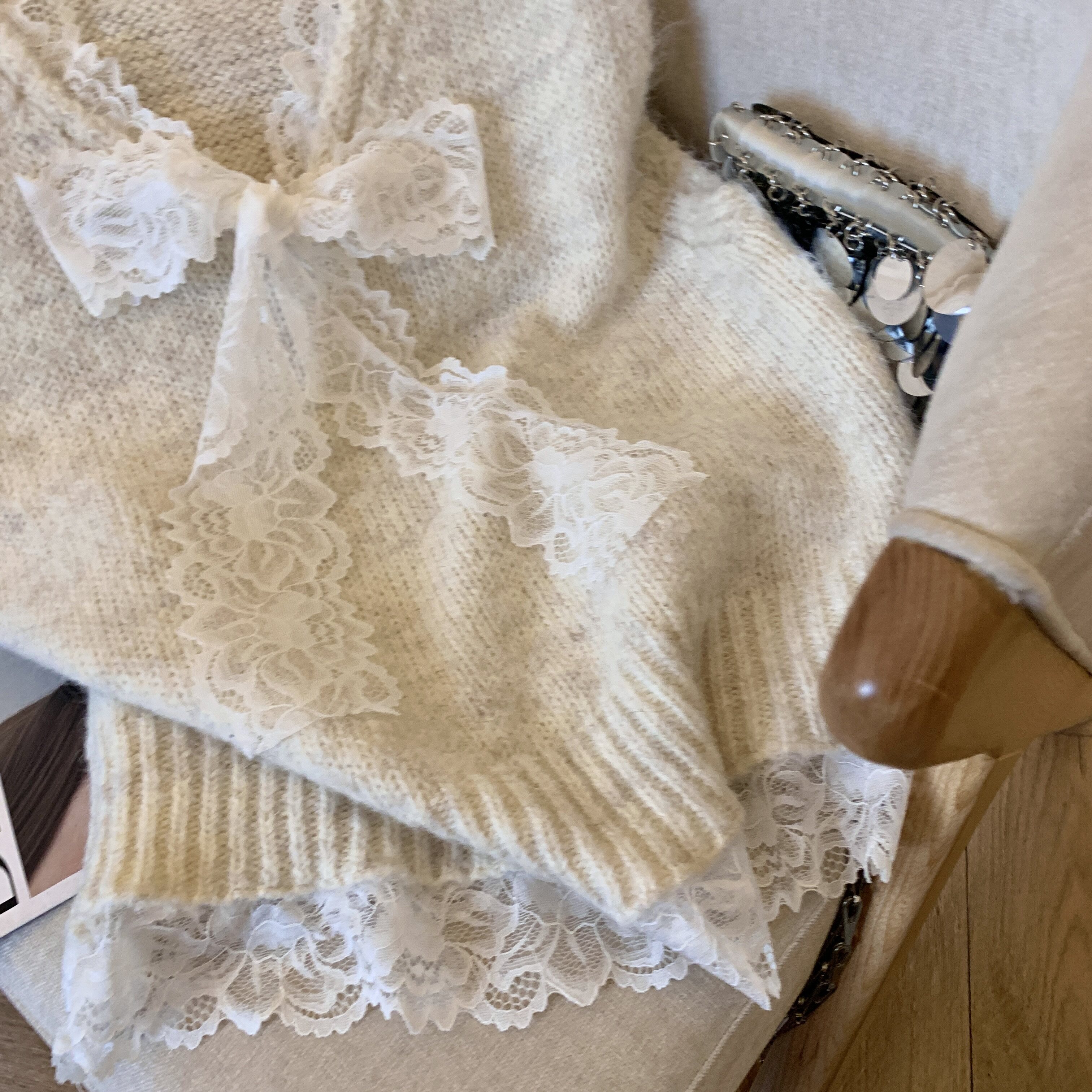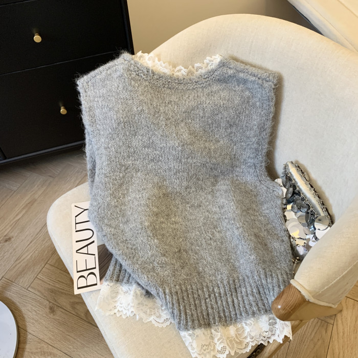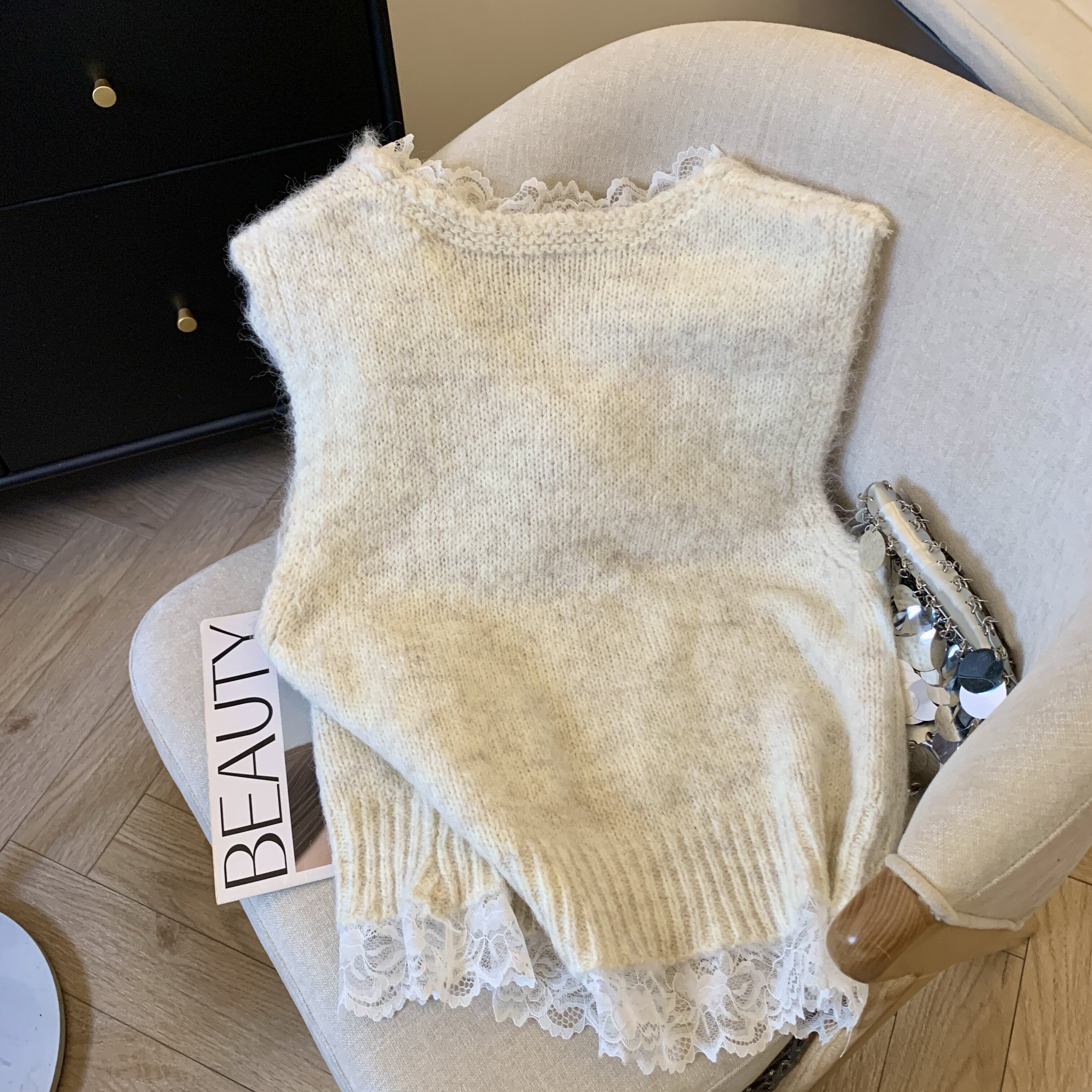 專櫃撤廻剪標系帶蝴蝶結V領馬甲女2025新款設計感蕾絲邊曡穿上衣