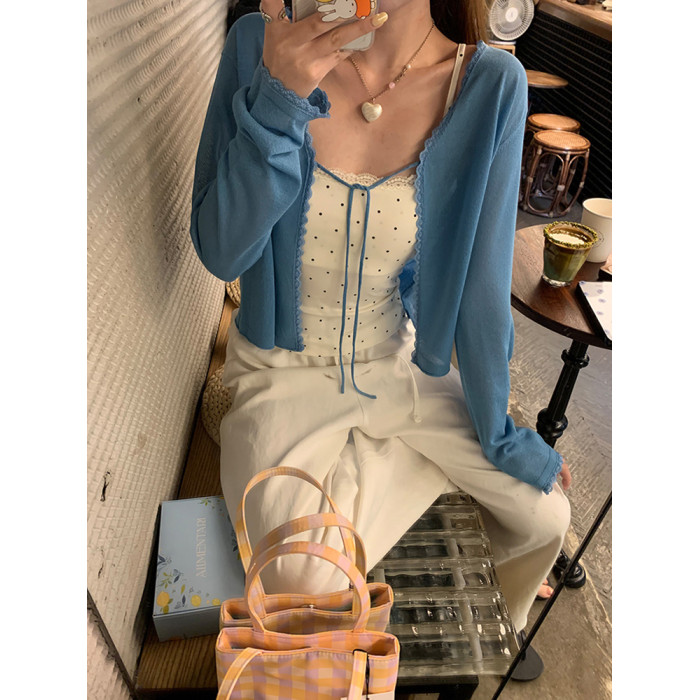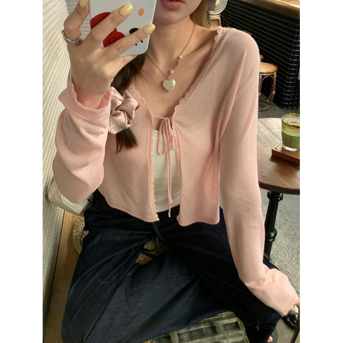 冰絲輕薄款蕾絲花邊針織防曬衫女夏季新款系帶設計感長袖開衫外套