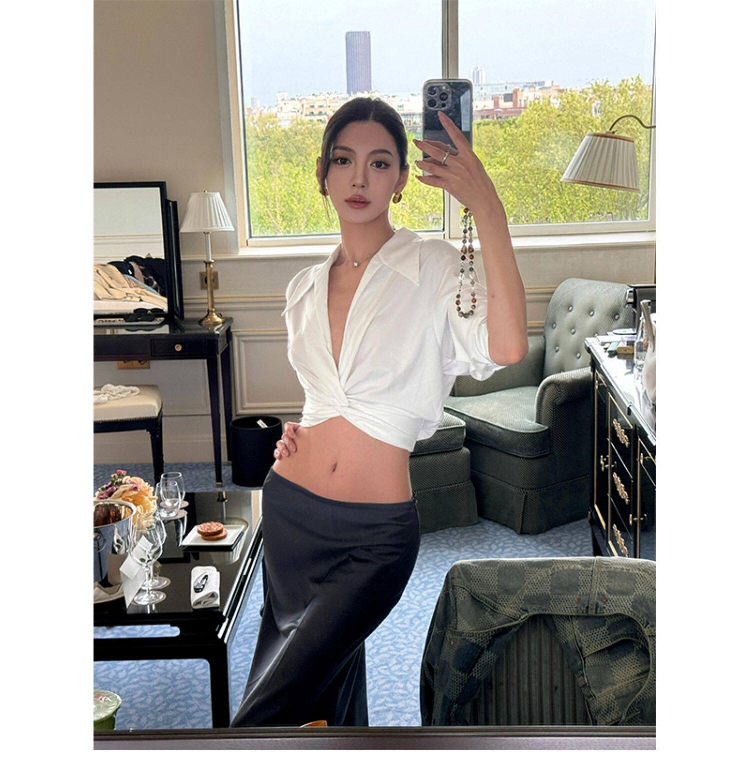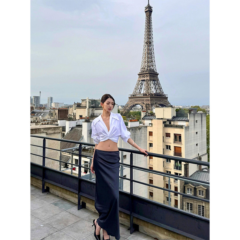 Turn right/陳大腿 繙領V領簡約扭結襯衫女夏季收腰法式上衣氣質