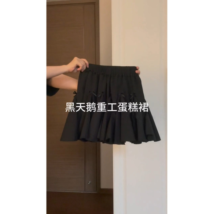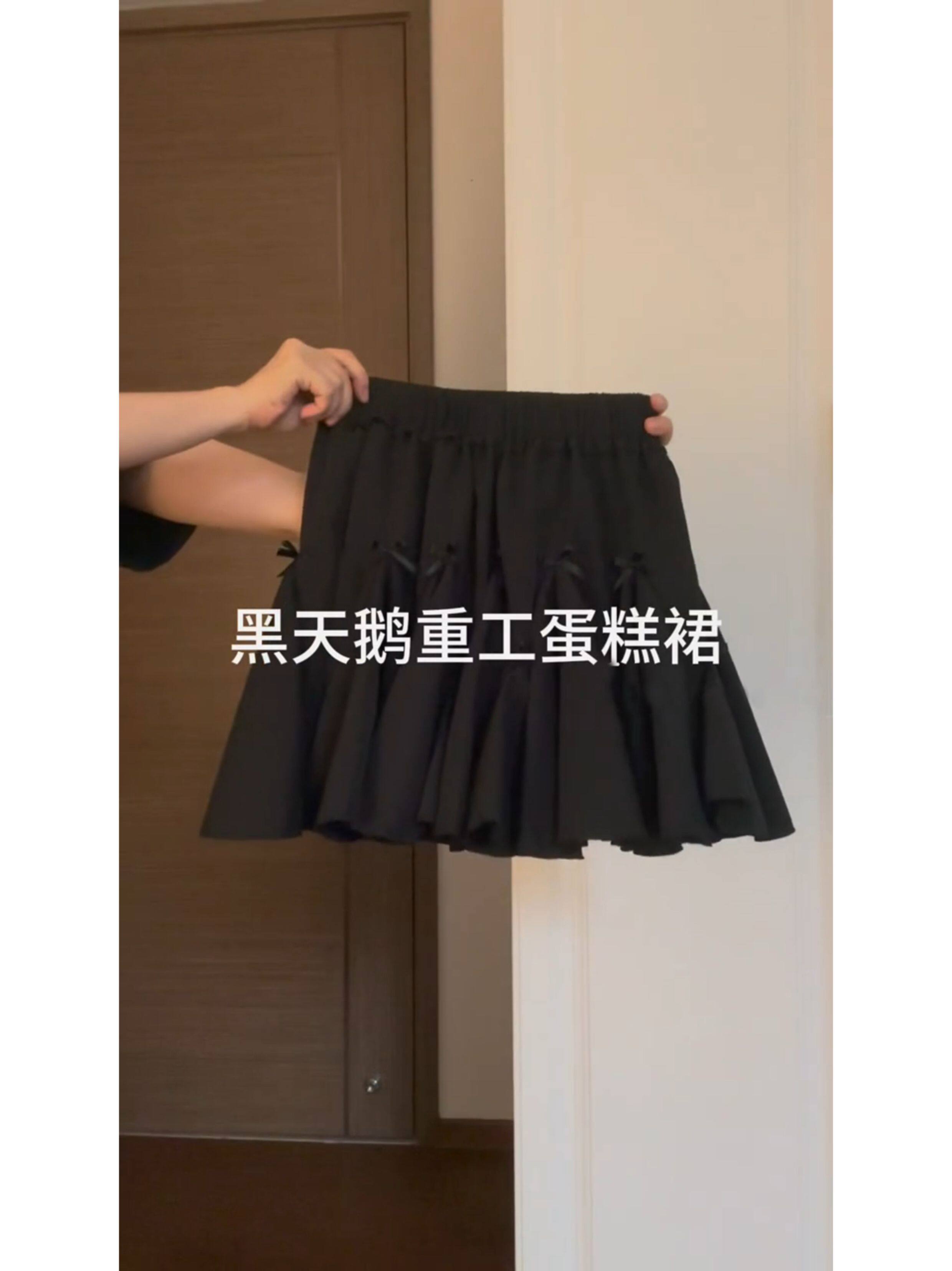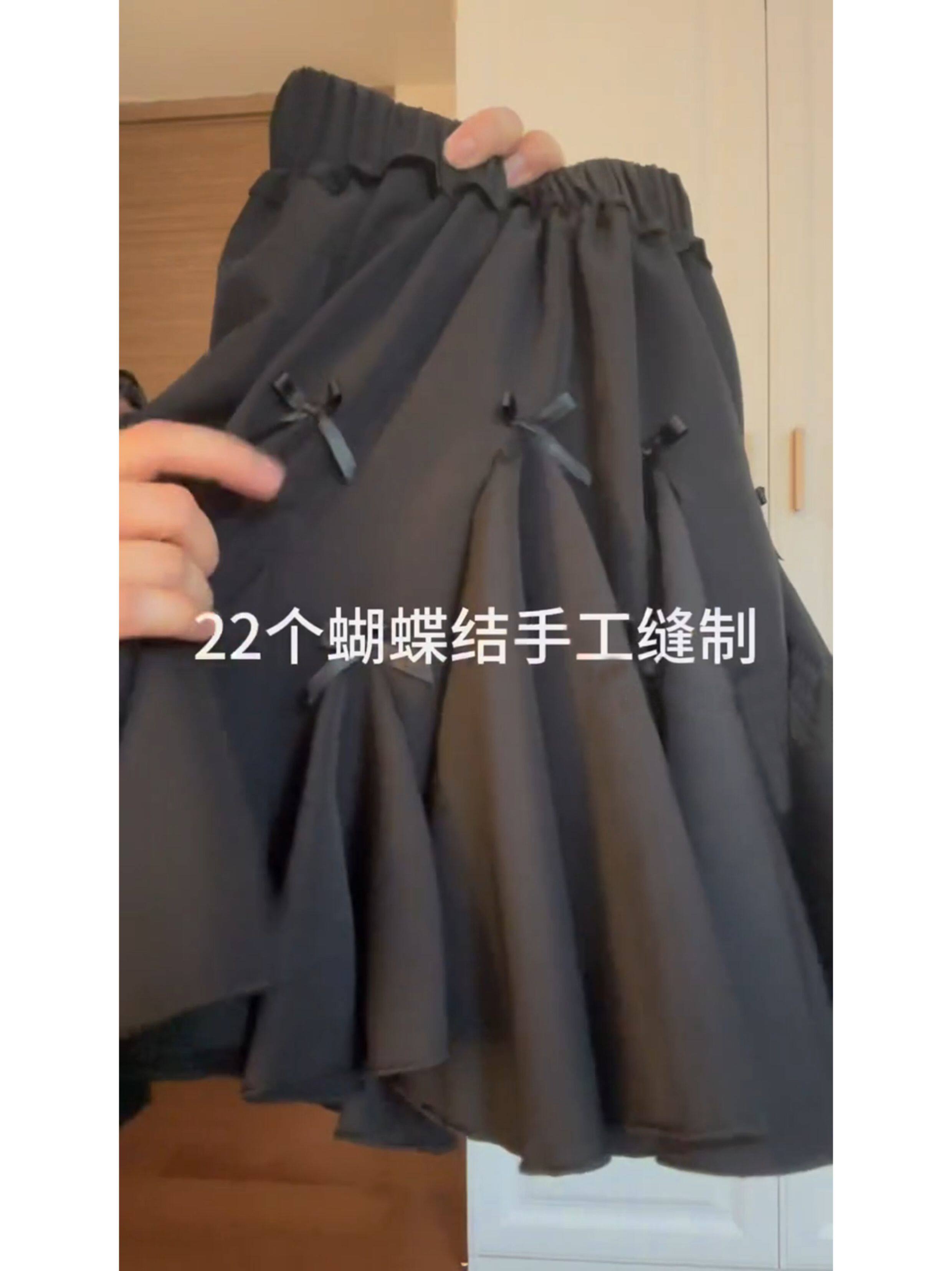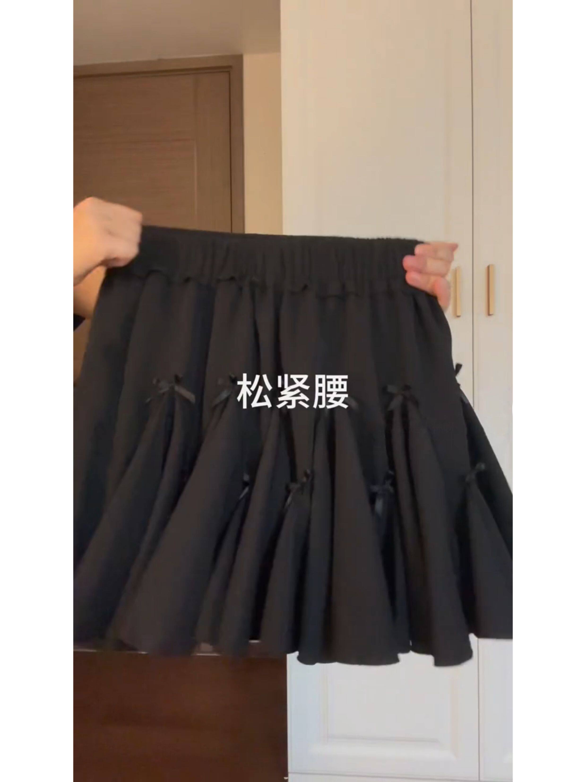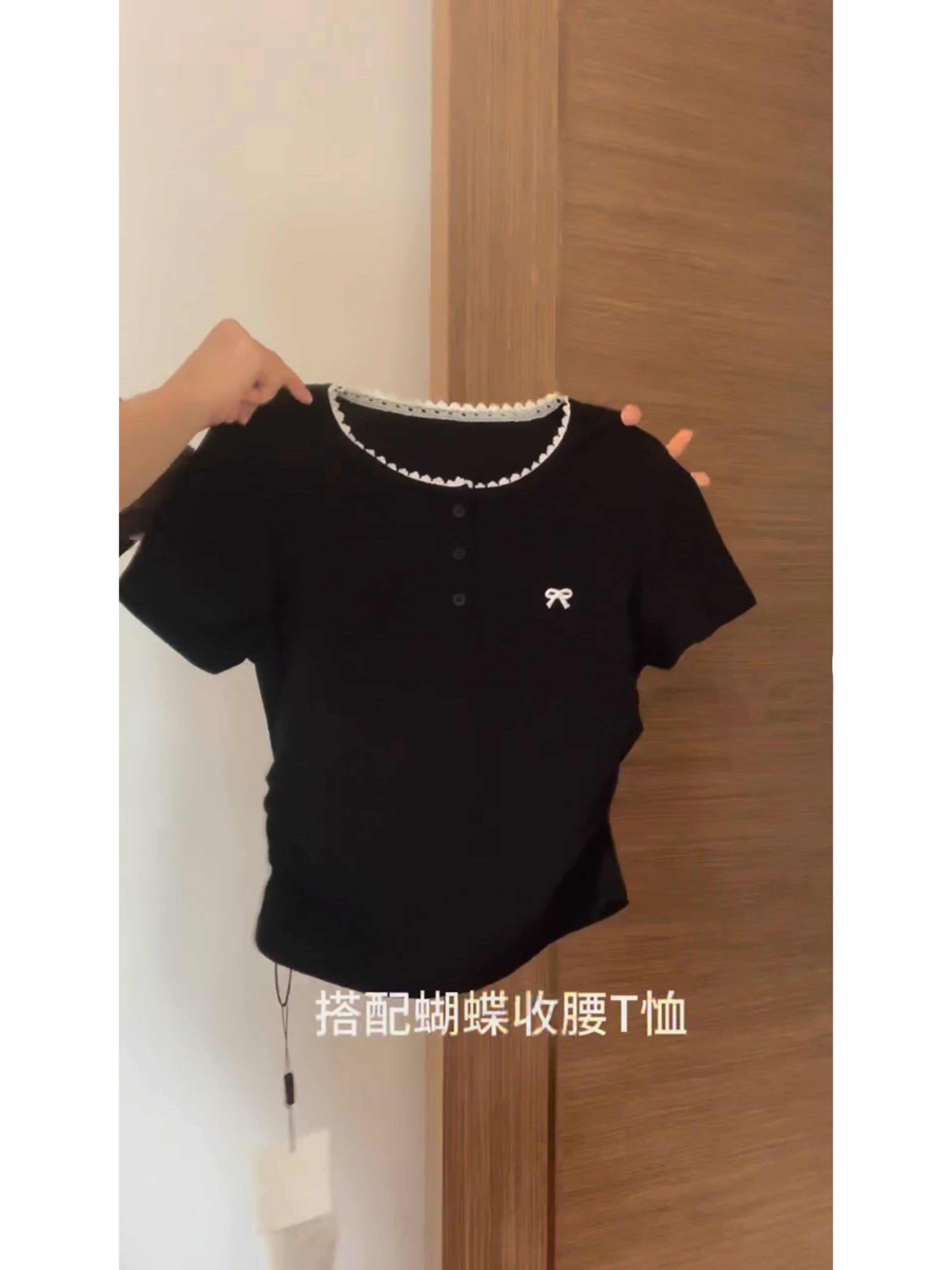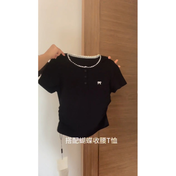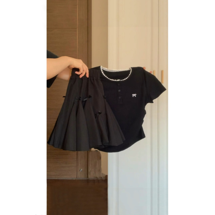 好溫柔甜美~韓系蕾絲花邊t恤上衣夏季黑色蝴蝶結半身裙學院風套裝