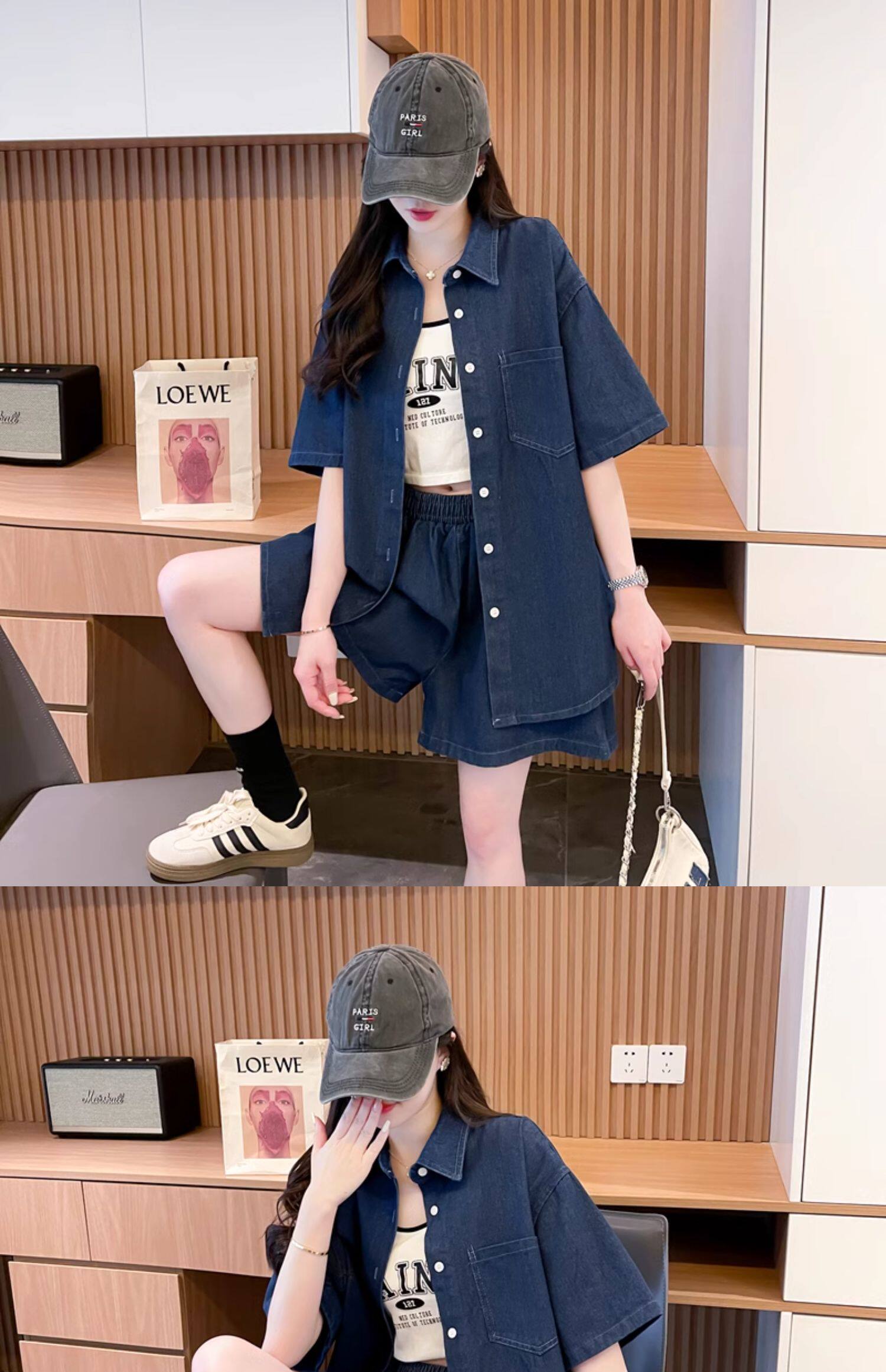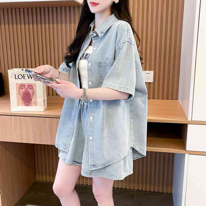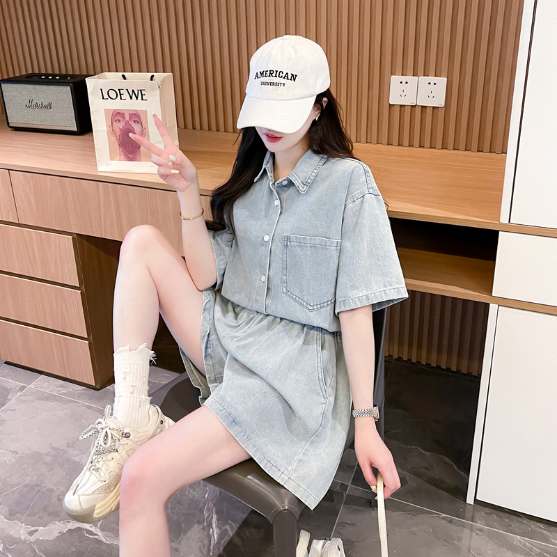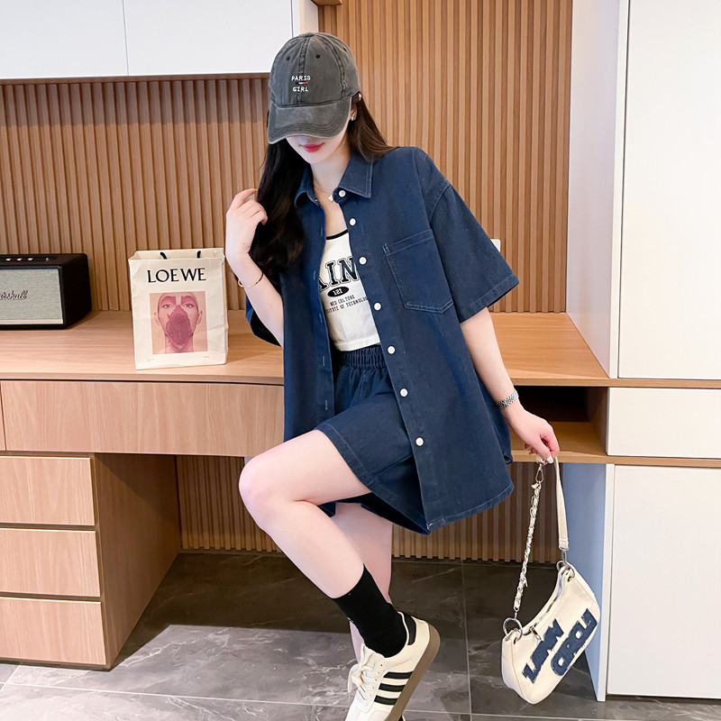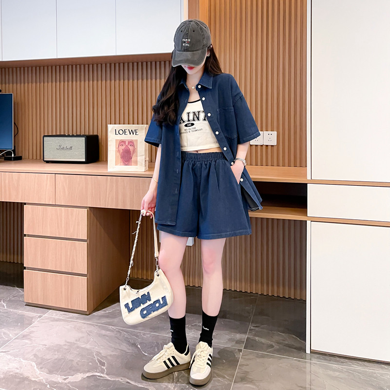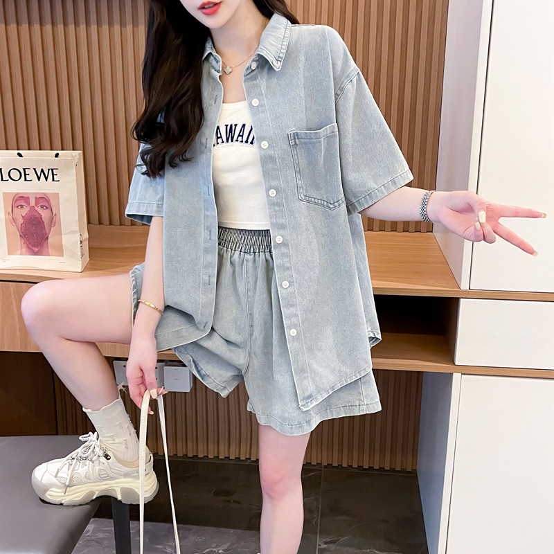 慵懶風復古甜辣風牛仔襯衫短褲兩件套女2024春夏新款寬鬆休閒套裝