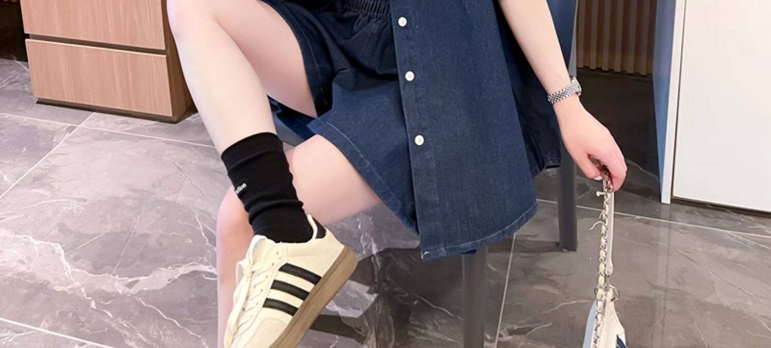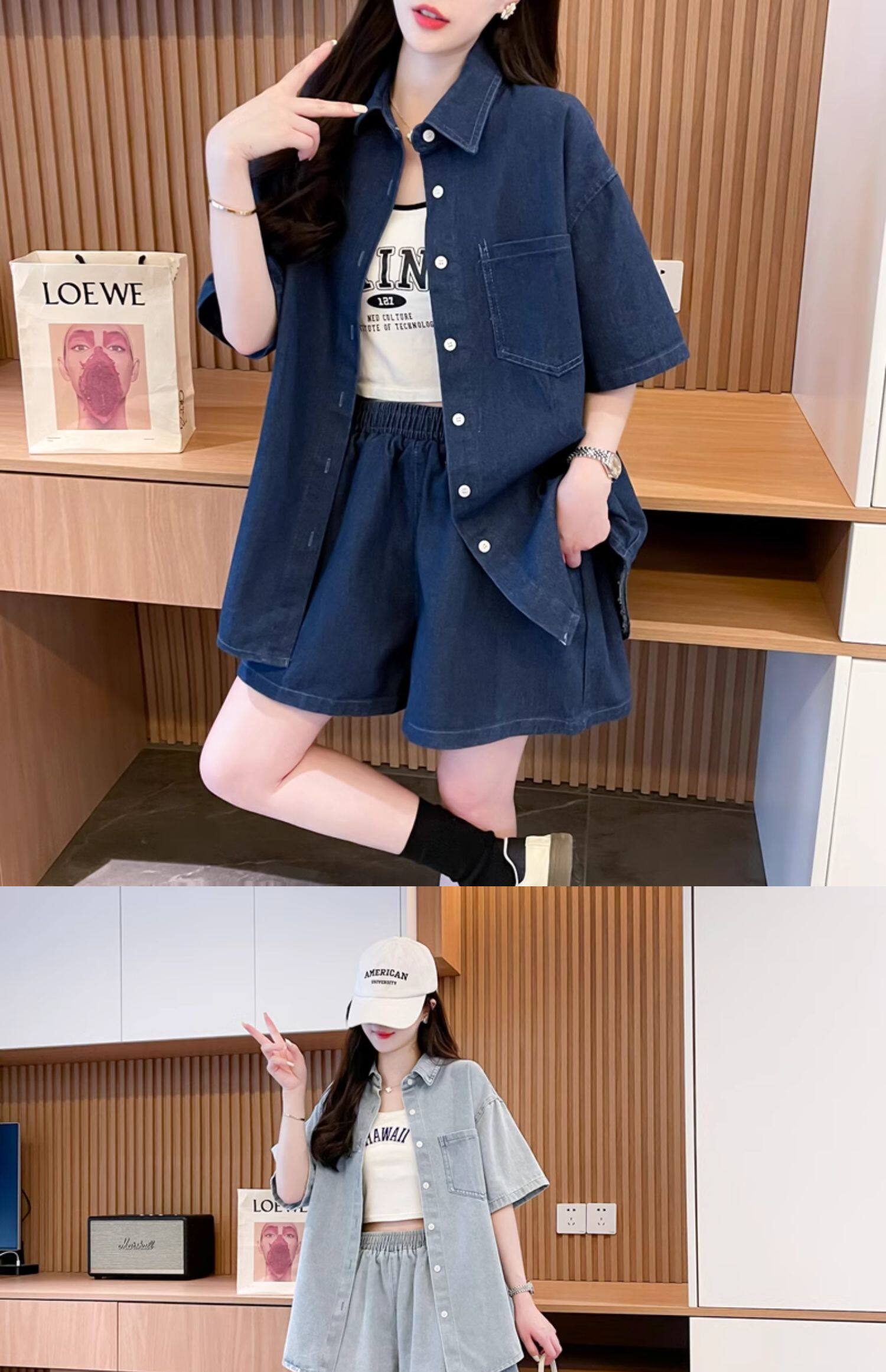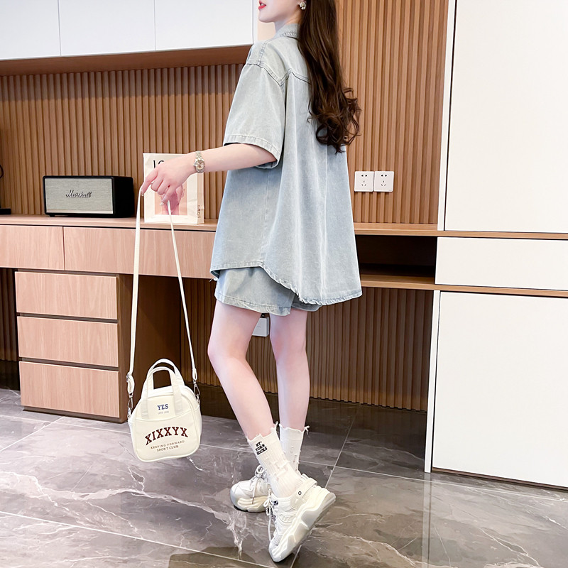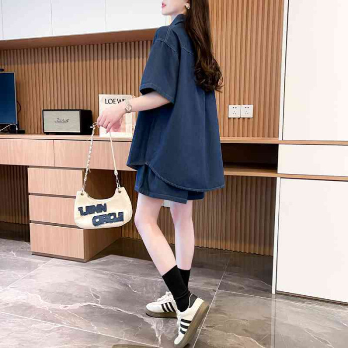 慵懶風復古甜辣風牛仔襯衫短褲兩件套女2024春夏新款寬鬆休閒套裝
