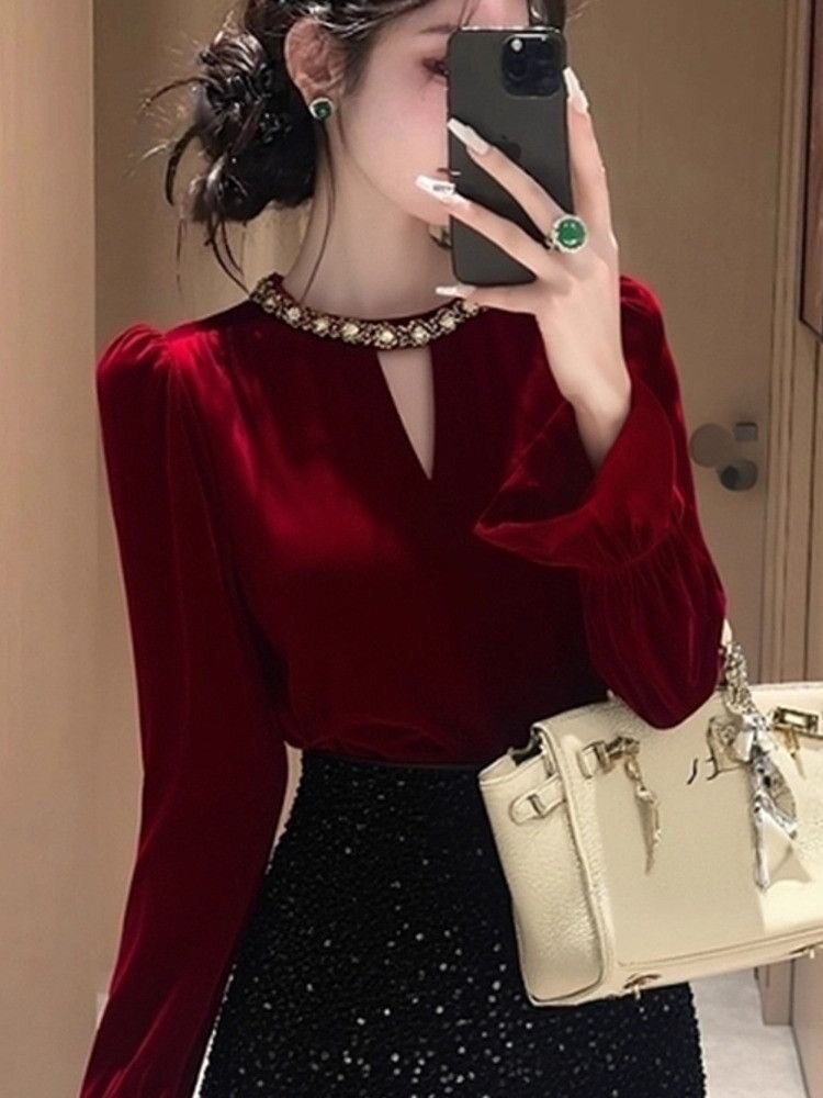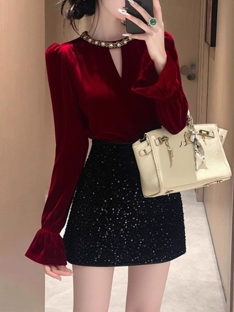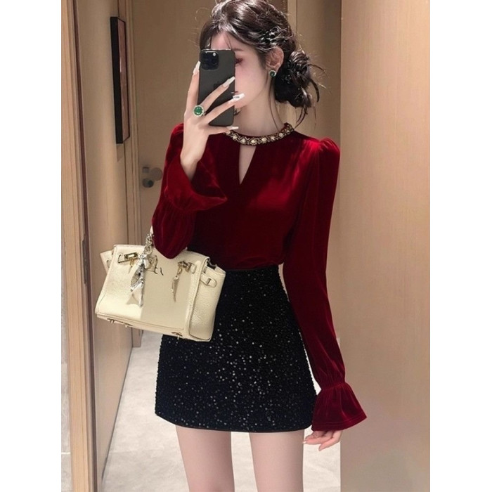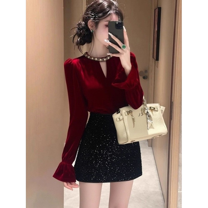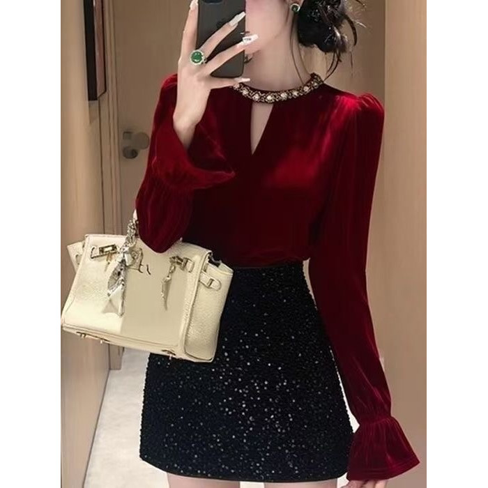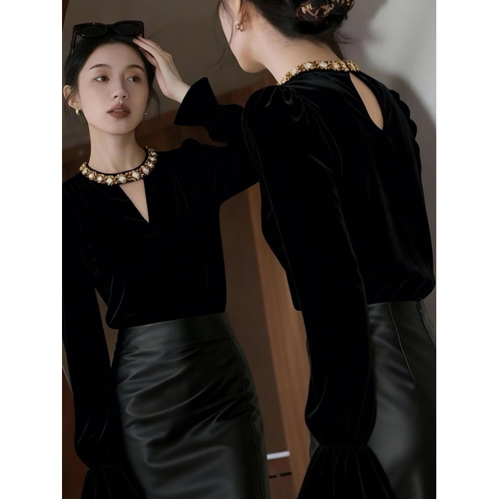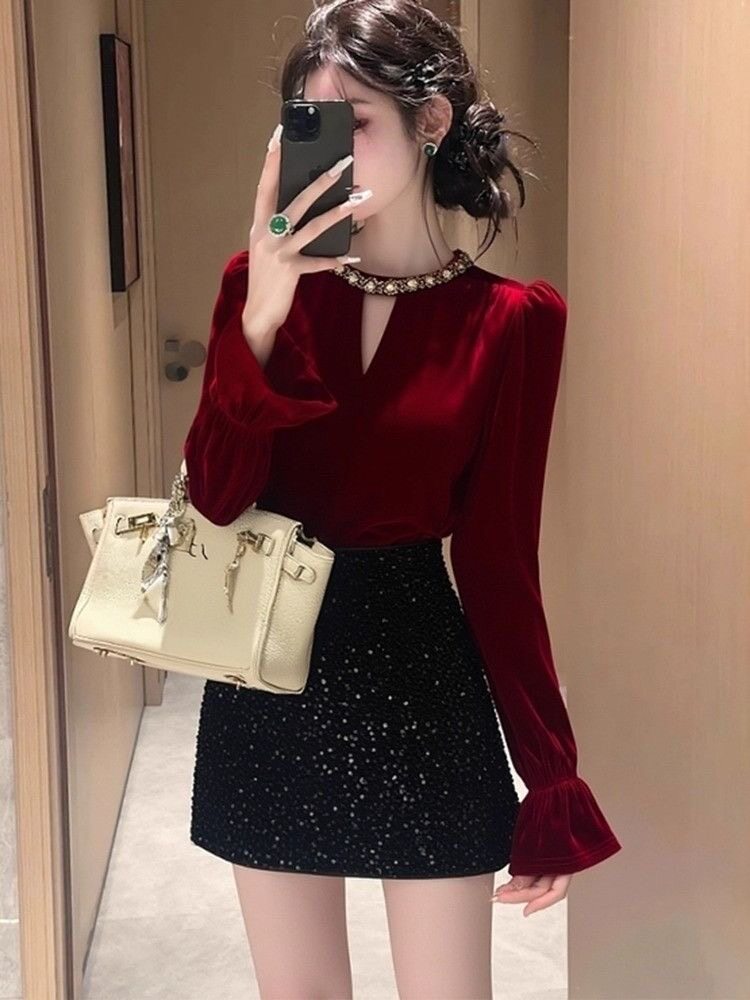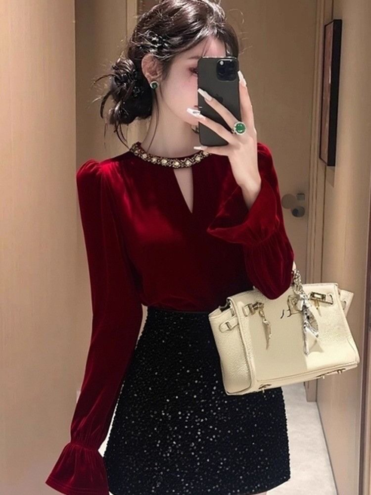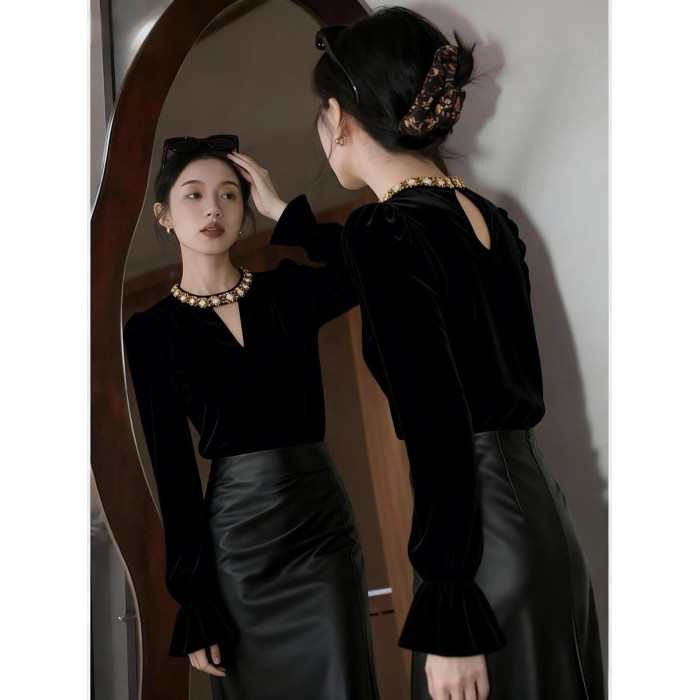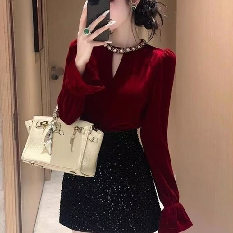 高檔復古赫本風新款修身顯瘦絲絨打底衫女百搭秋冬喇叭袖絕美上衣