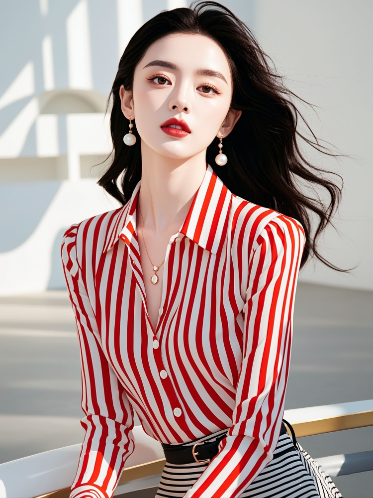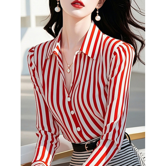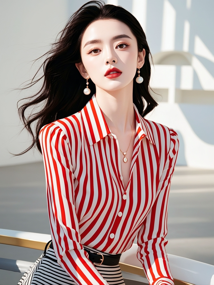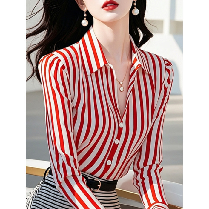 時尚高級感2025年新款秋季女裝法式設計港風別致紅色條紋長袖襯衫