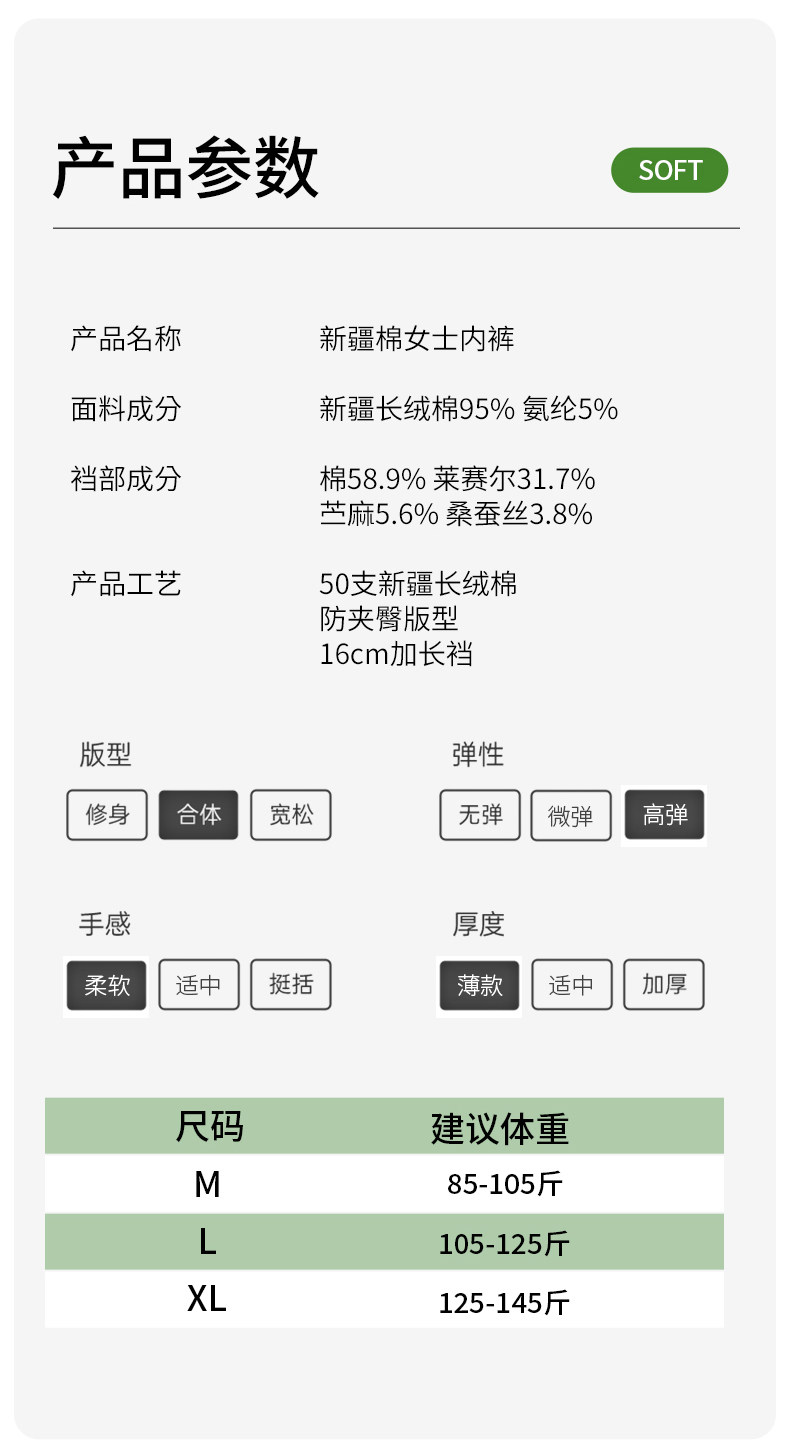| 襠部材質成分 | 棉58.9% 萊賽爾纖維(萊賽爾)31.7% 苧麻5.6% 桑蠶絲3.8% |