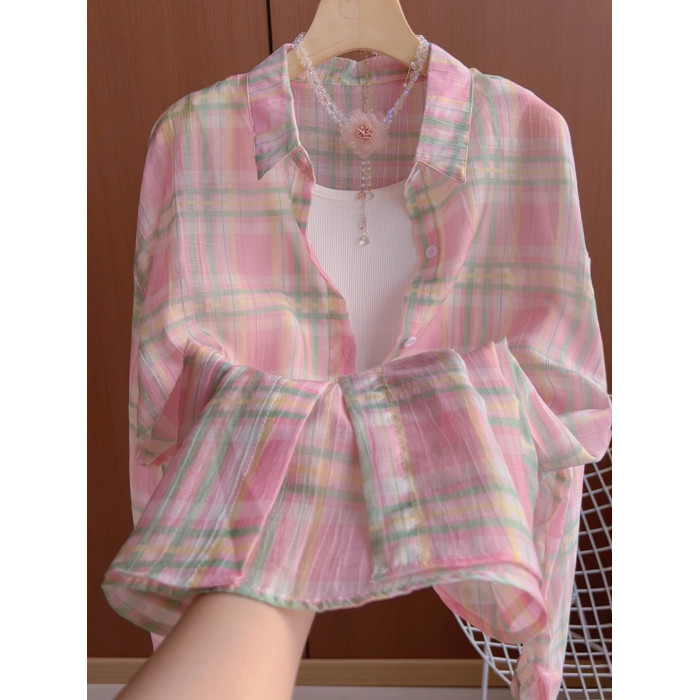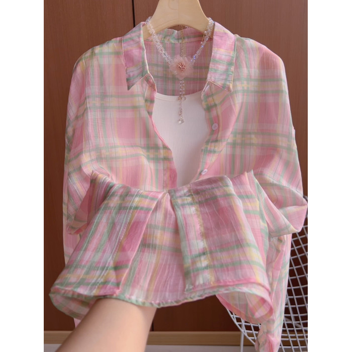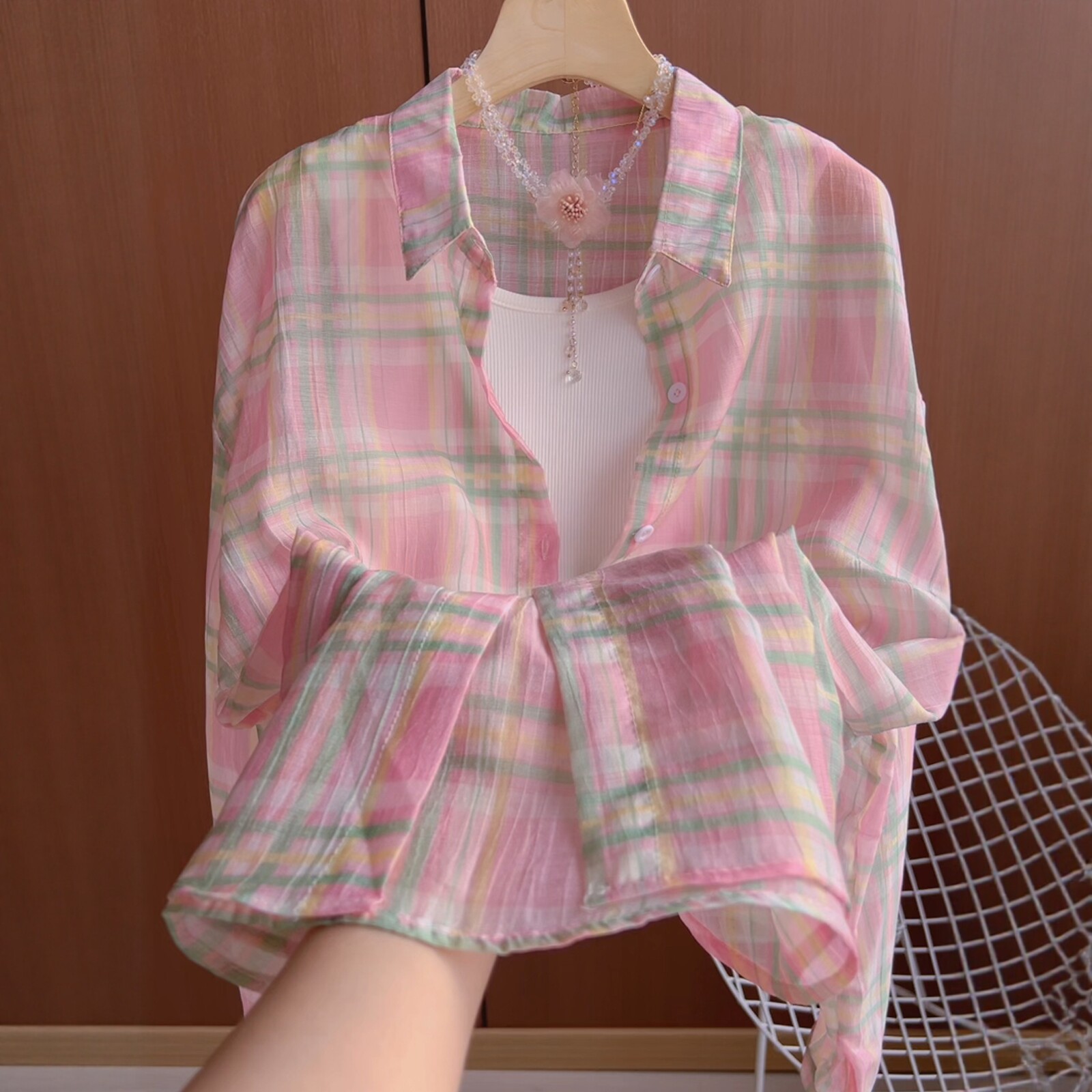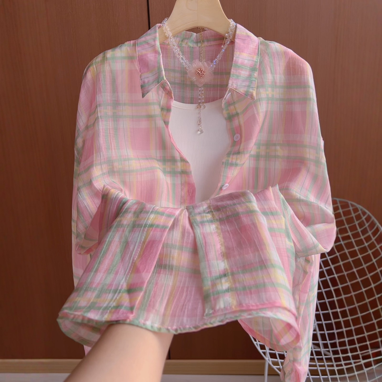十三行韓系慵懶風粉色格子防曬襯衫配背心女夏季薄款休閒兩件套裝