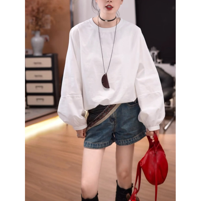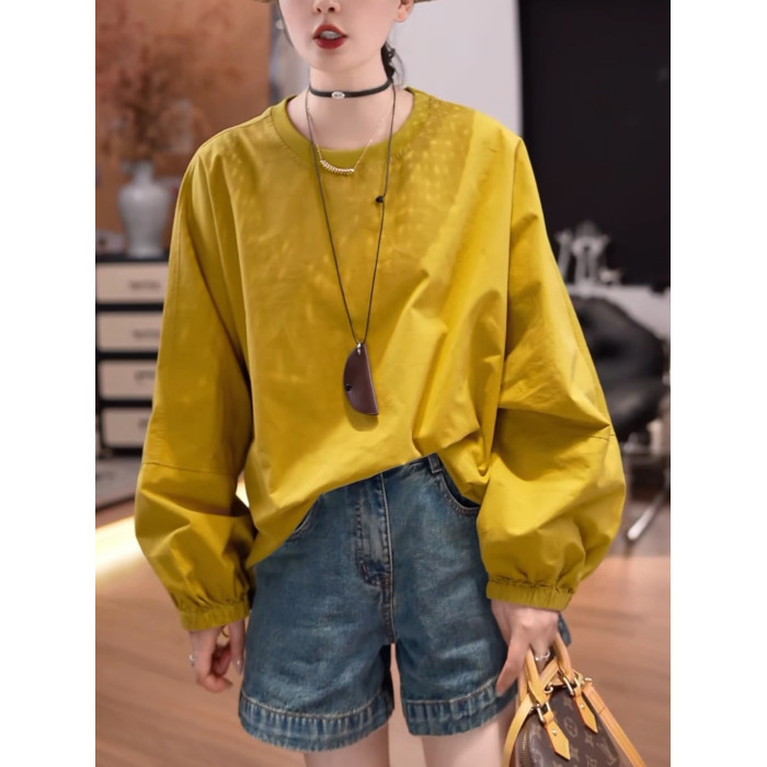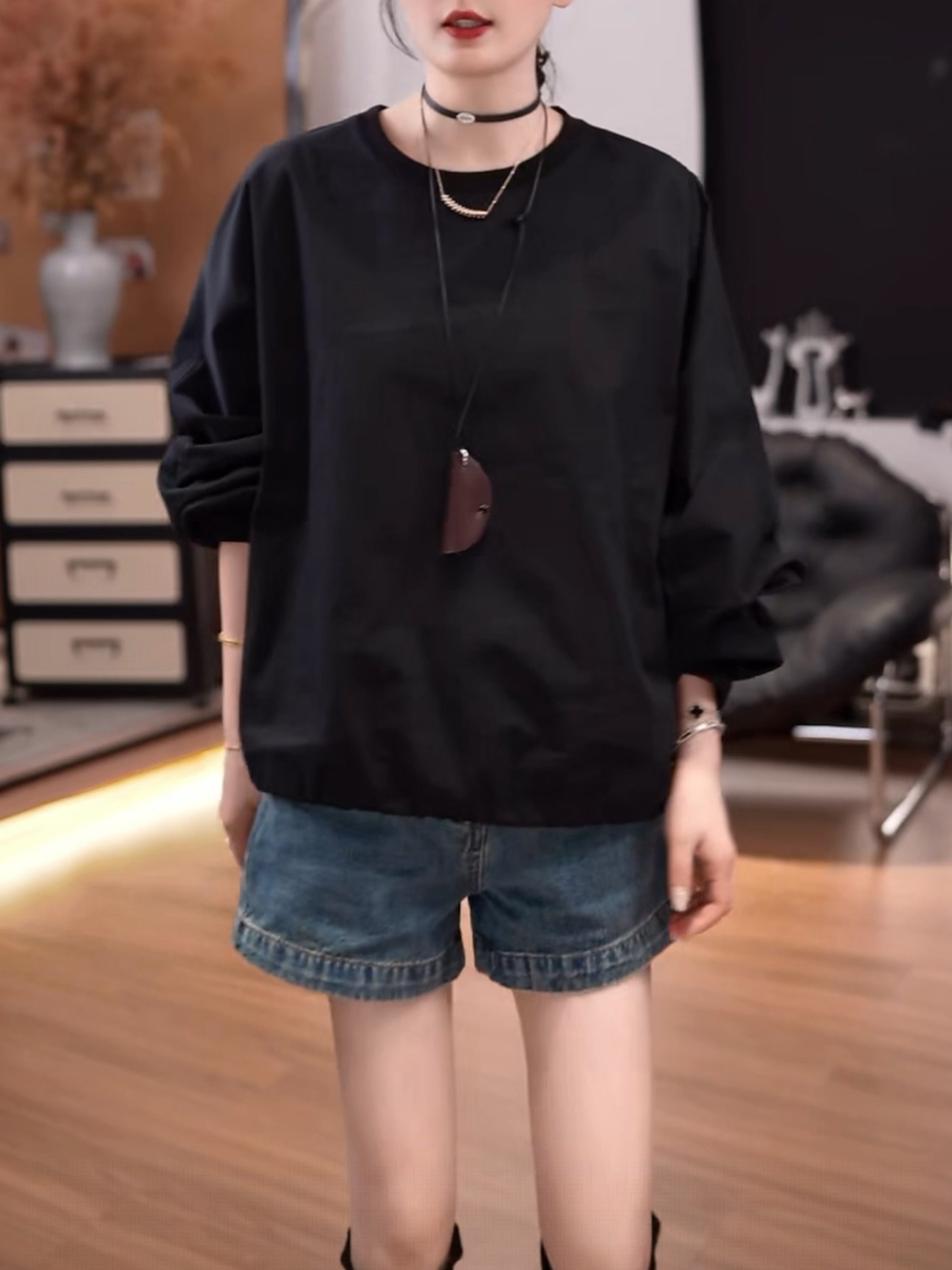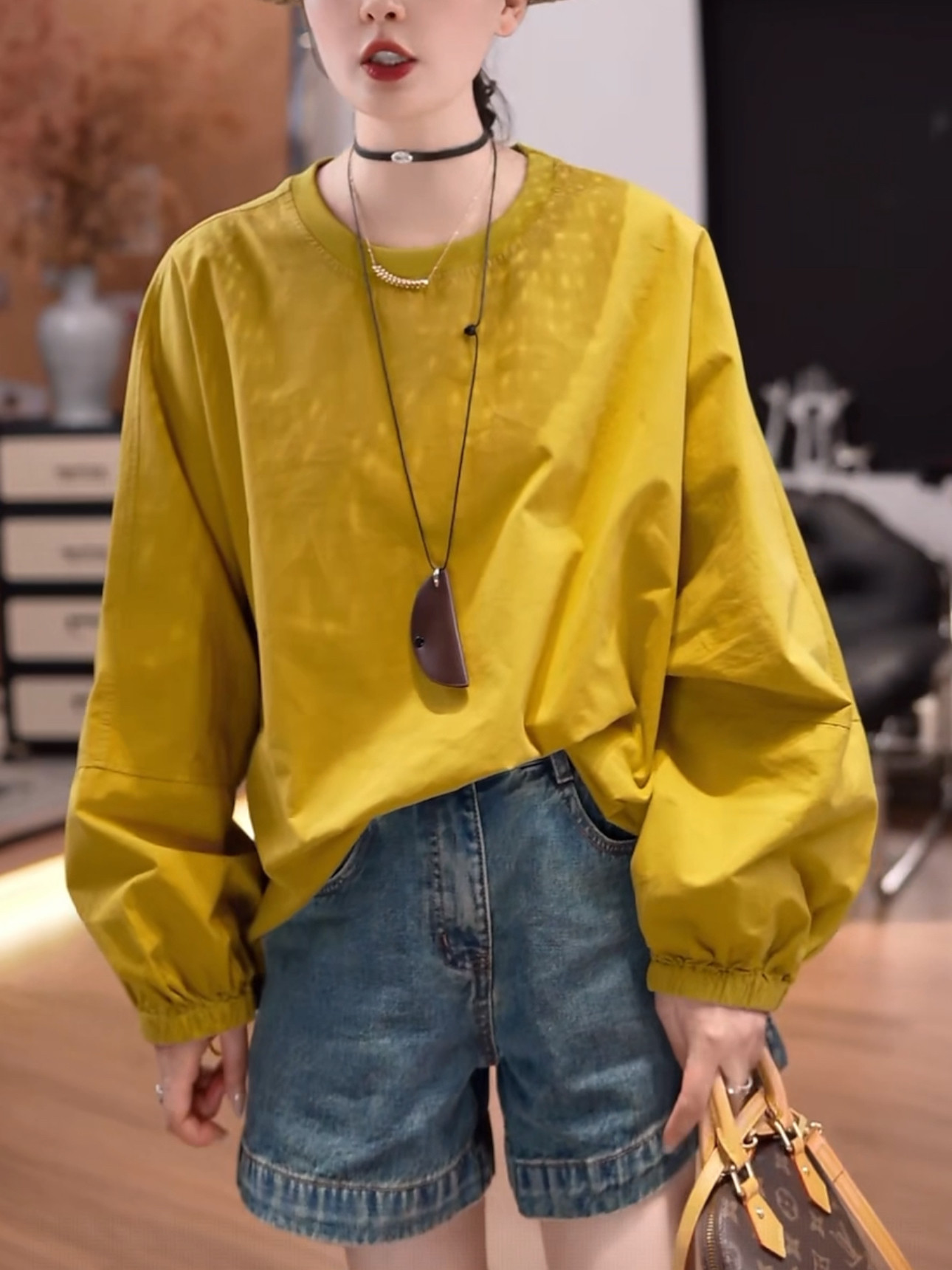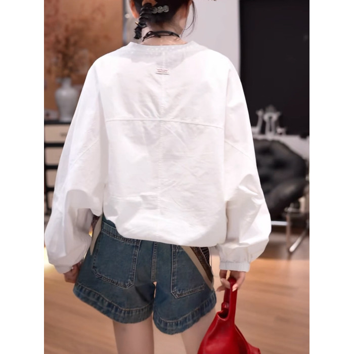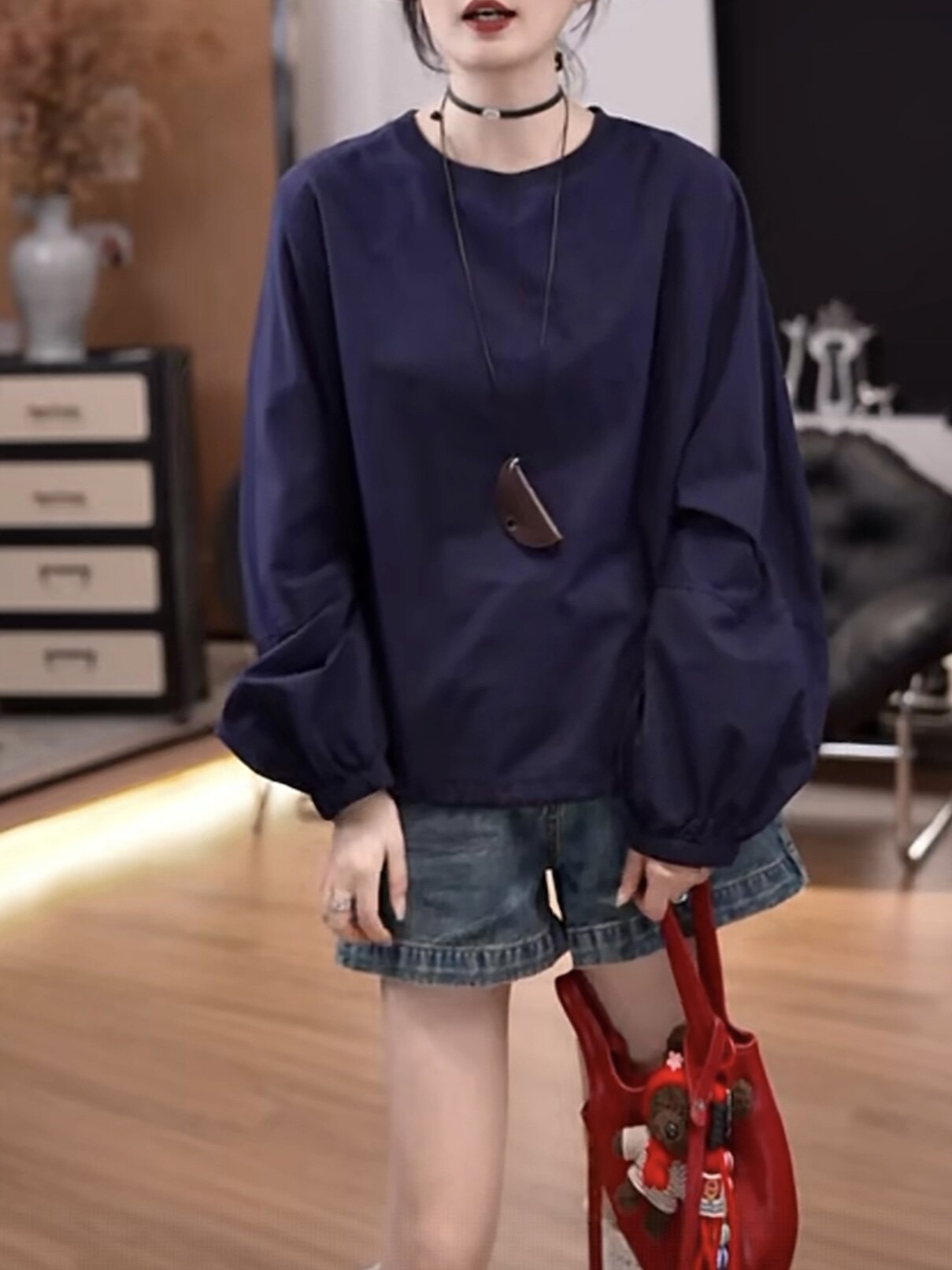 抽繩長袖襯衣女2026早春新款潮流時尚寬鬆百搭純色圓領襯衫潮