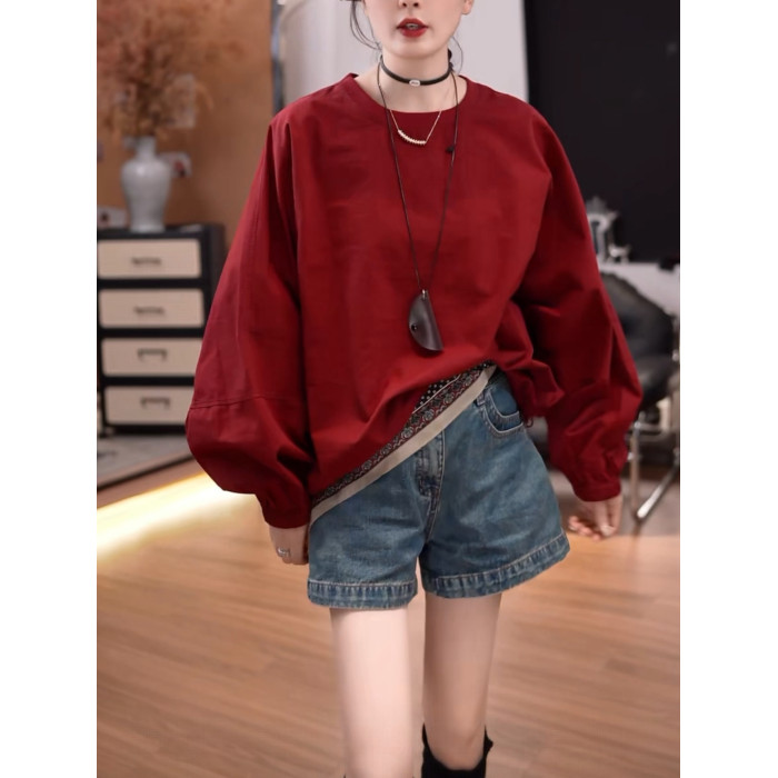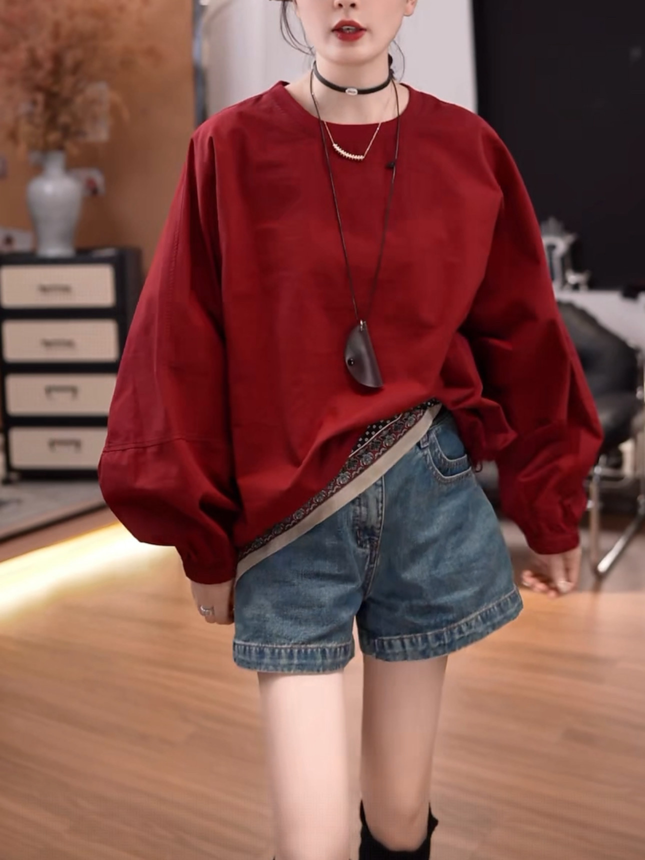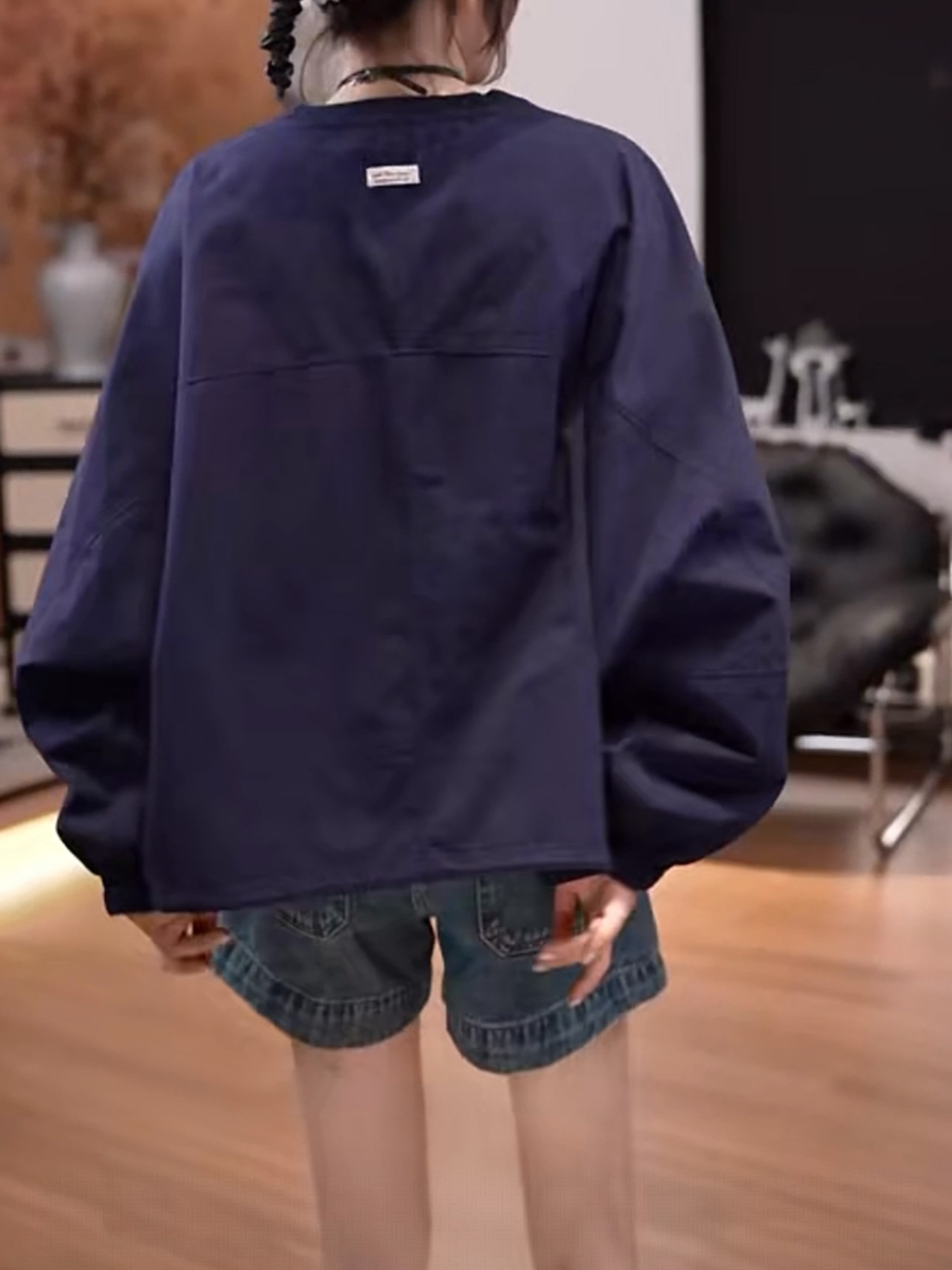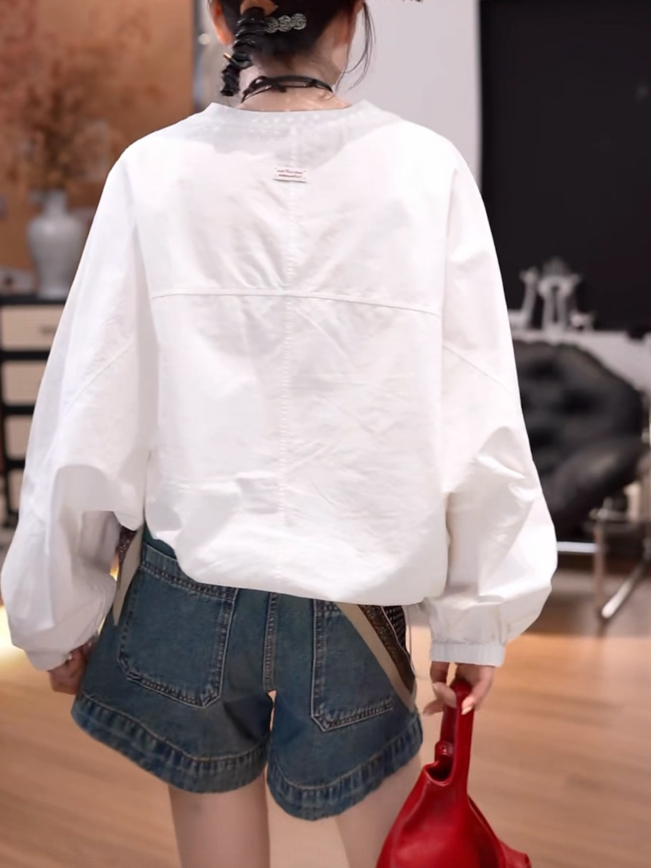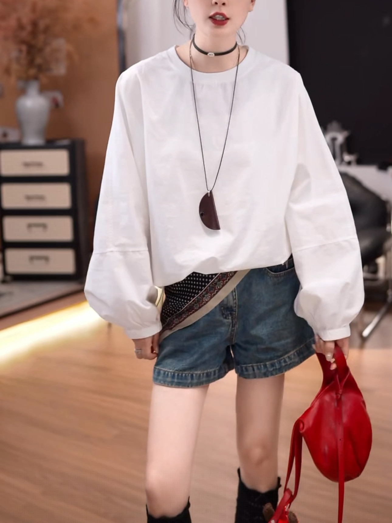 抽繩長袖襯衣女2026早春新款潮流時尚寬鬆百搭純色圓領襯衫潮