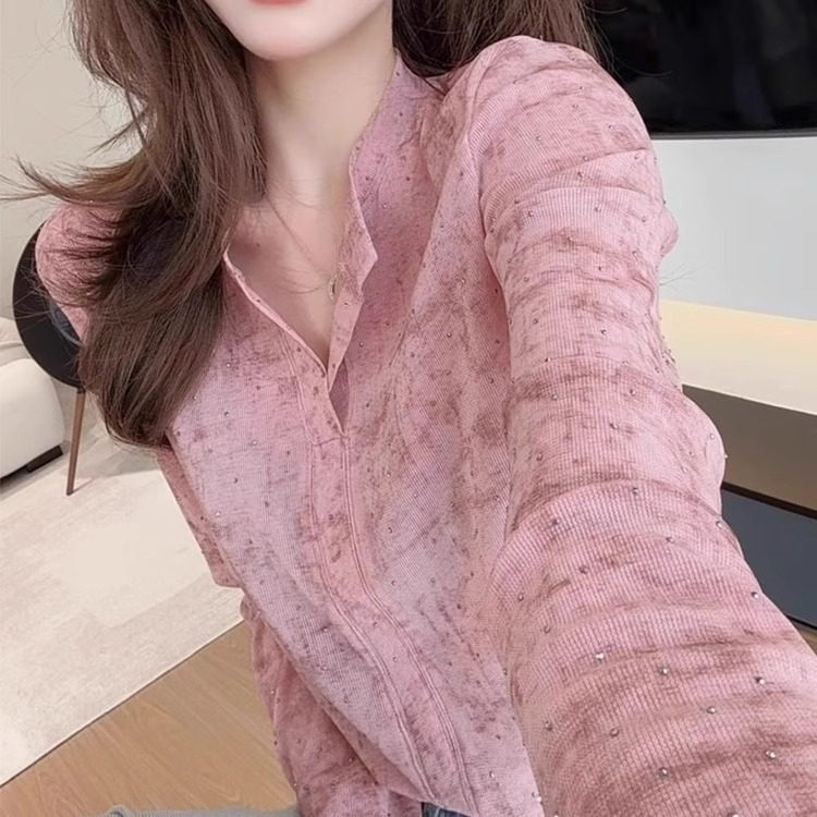 粉色暈染燙鑽半開領t恤襯衣女款2026新款爆款設計感獨特漂亮上衣