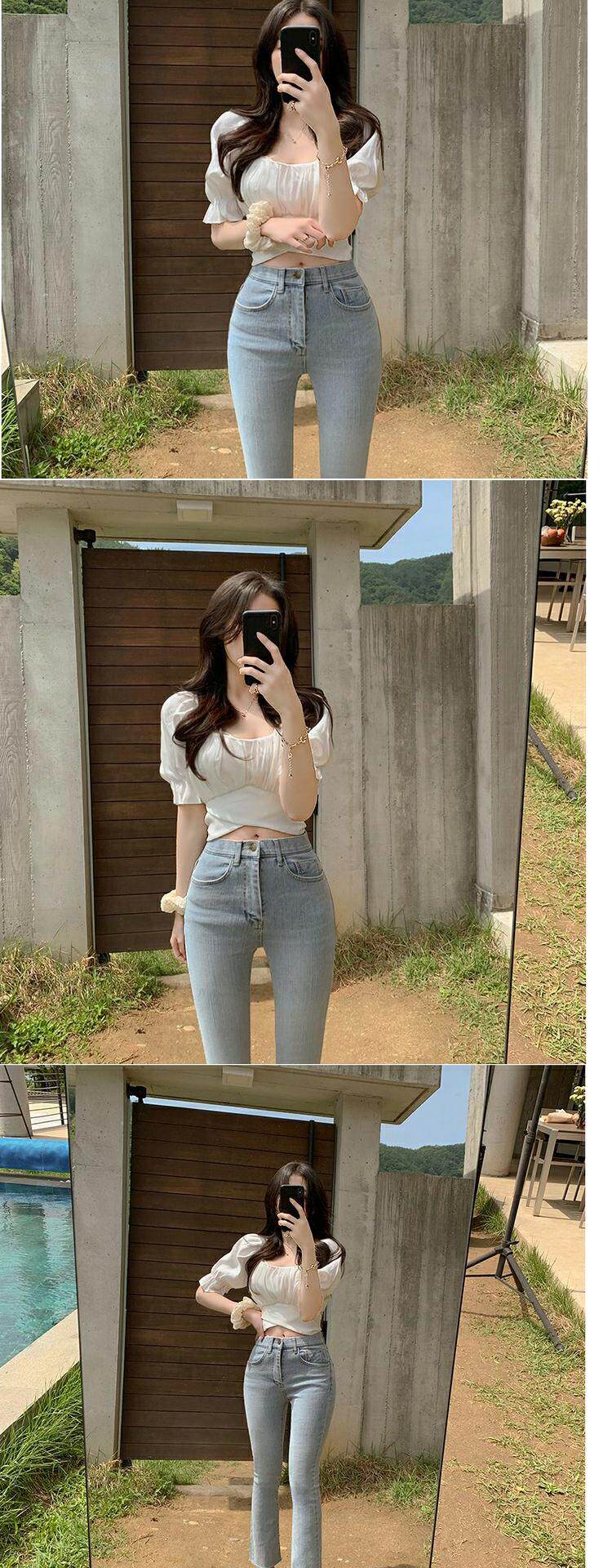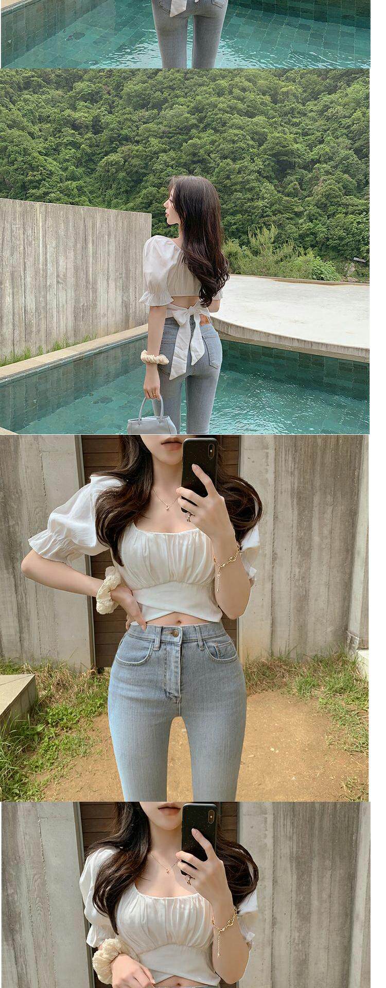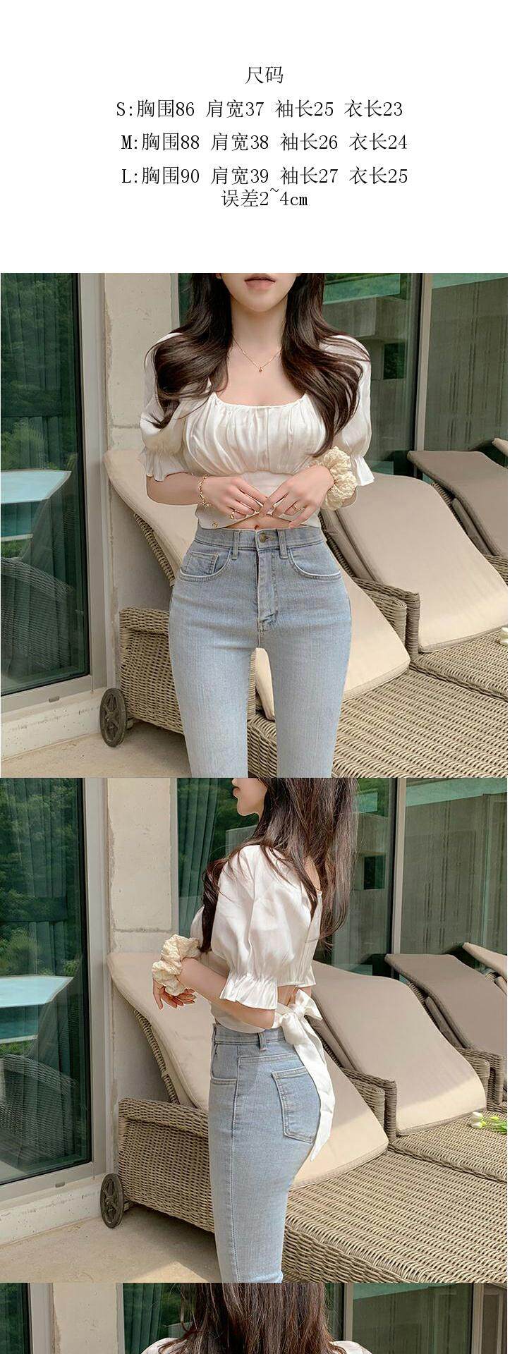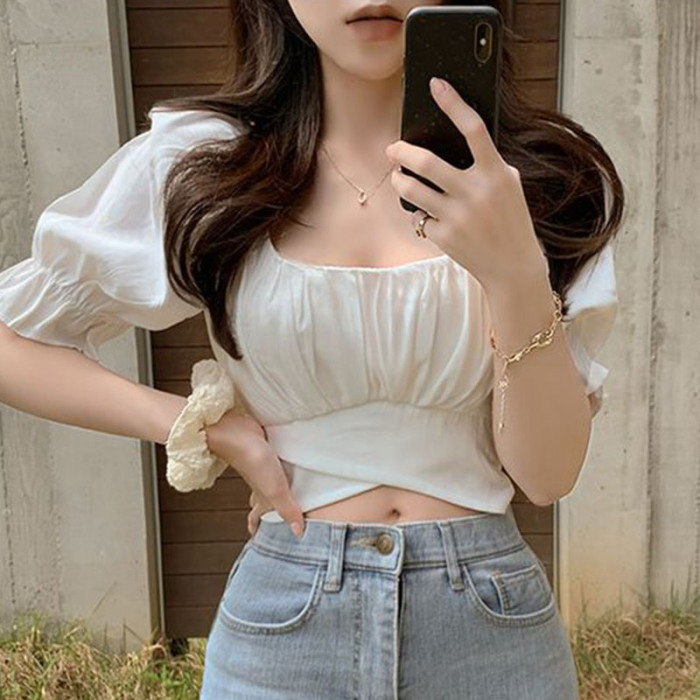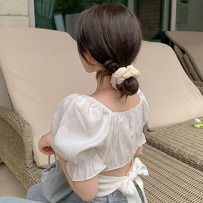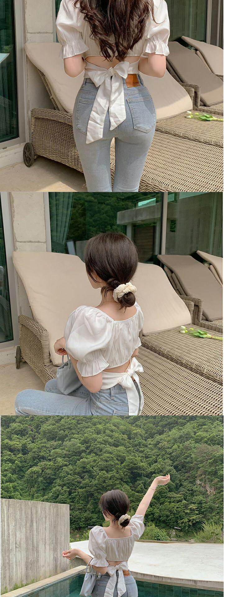 韓國chic夏季法式氣質方領露鎖骨收腰系帶蝴蝶結泡泡袖短款襯衫女