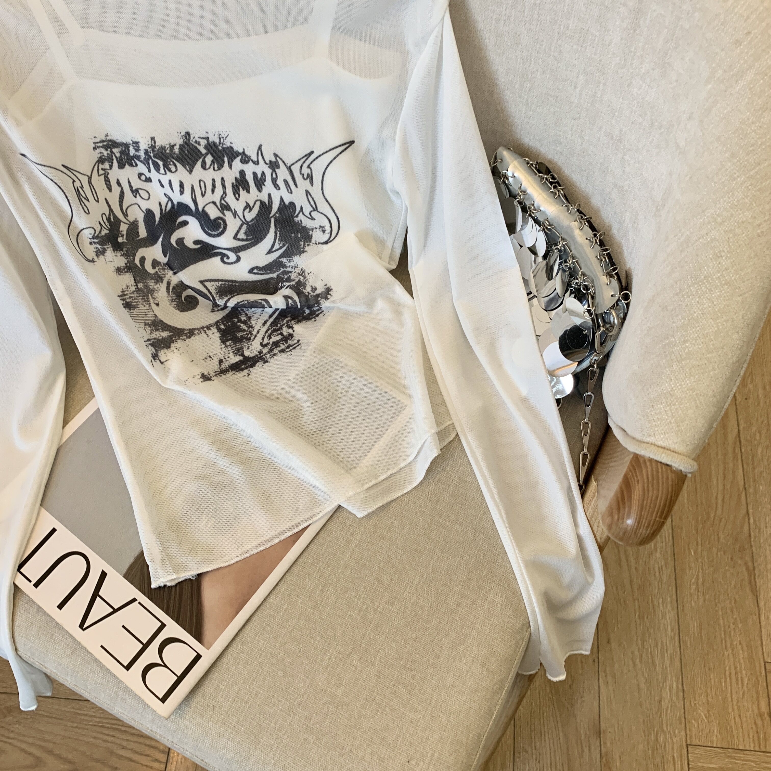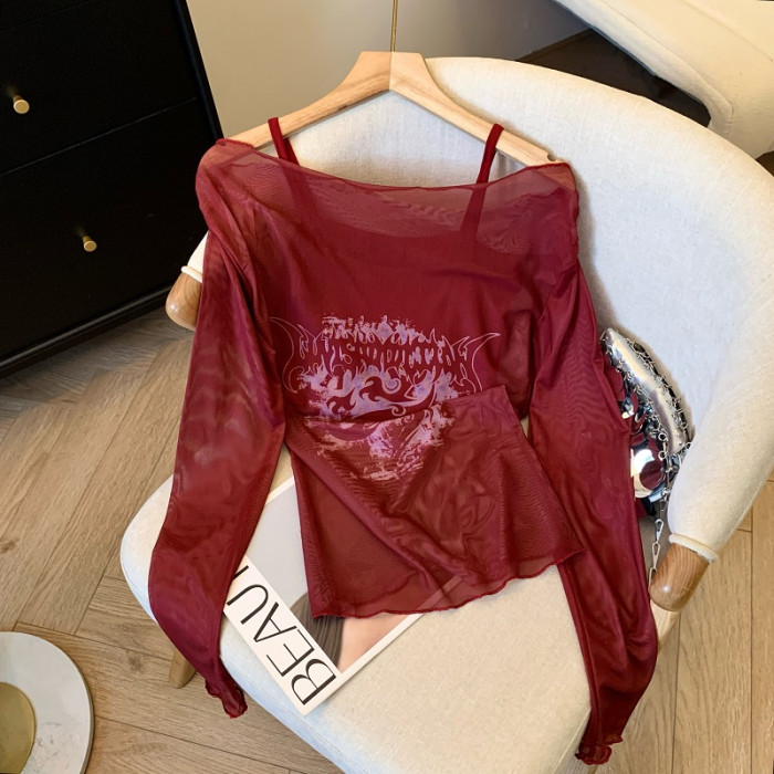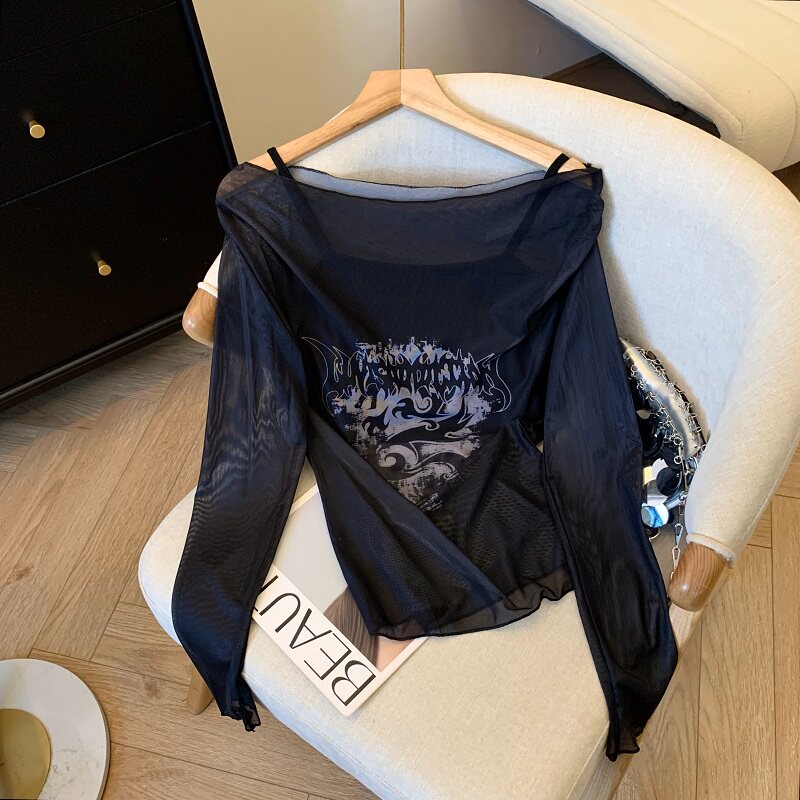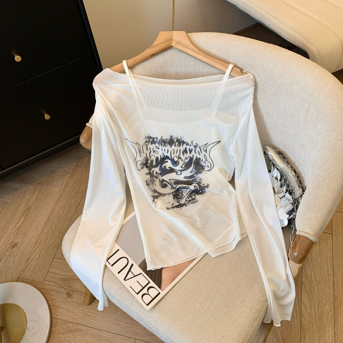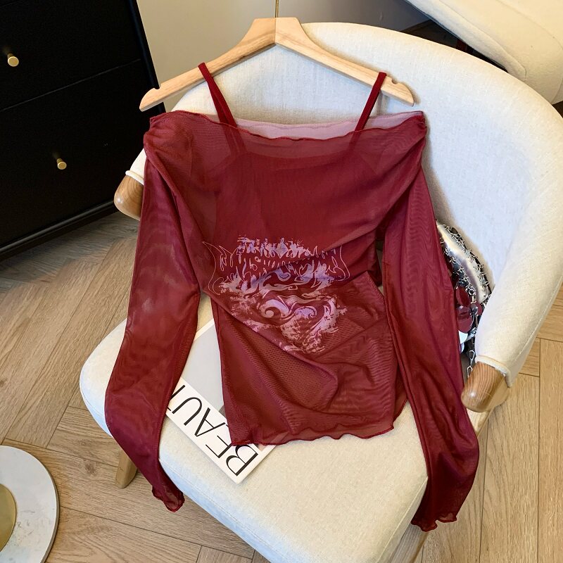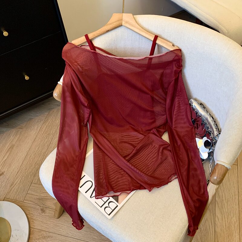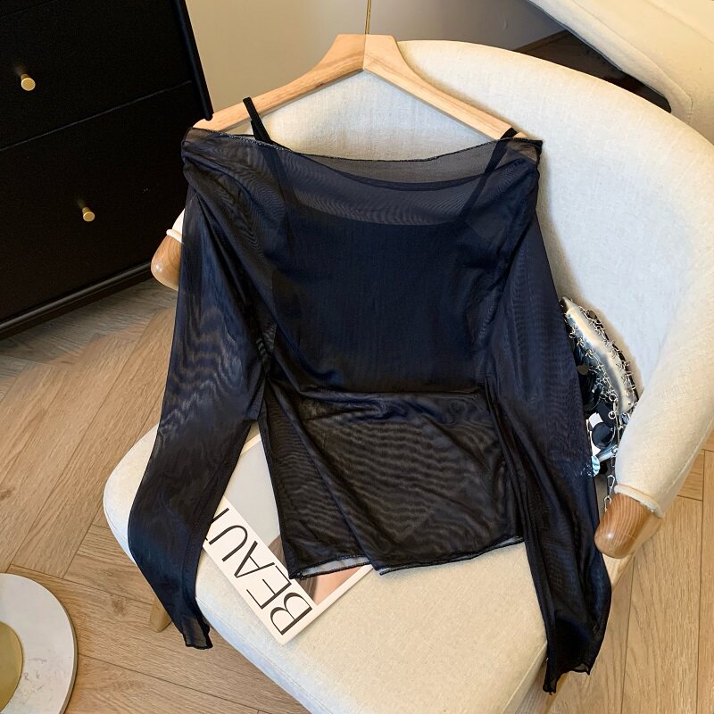 專櫃撤廻剪標辣妹網紗一字肩兩件套長袖防曬女夏季新款顯瘦上衣