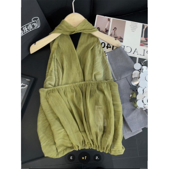 專櫃撤廻剪標綠色掛脖吊帶背心女夏季新款氣質辣妹露背無袖小上衣