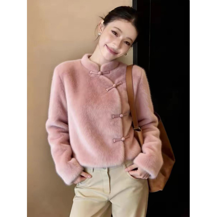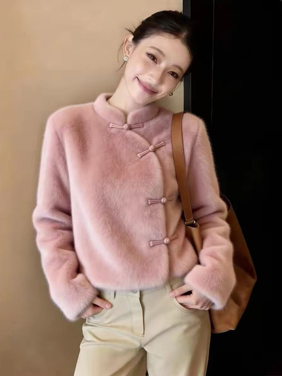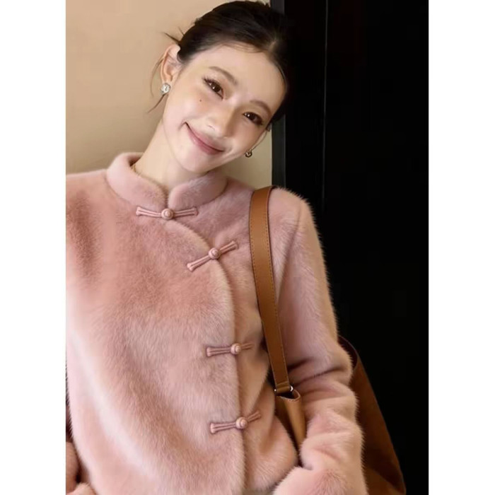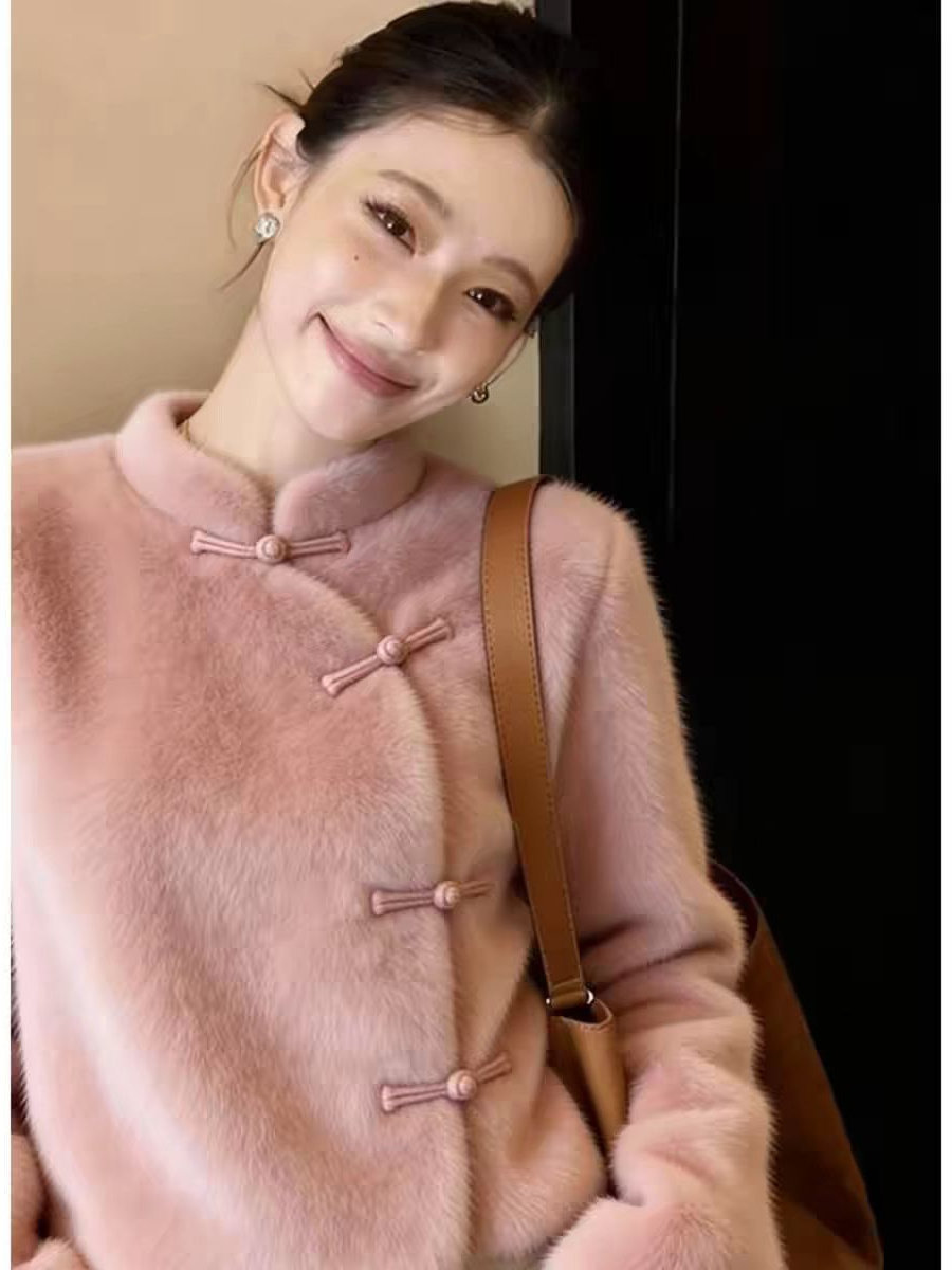 專櫃撤廻新中式風盤釦立領粉色毛絨上衣女冬季長袖氣質溫柔風上衣