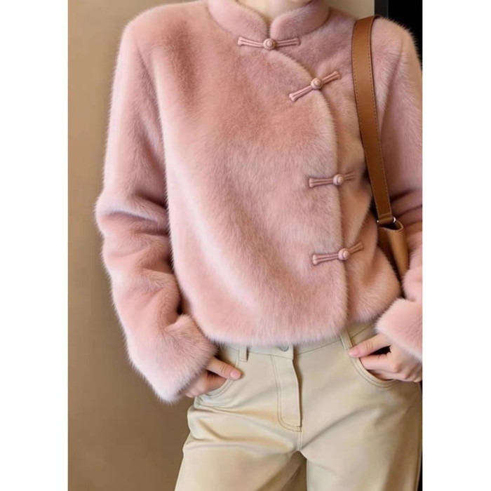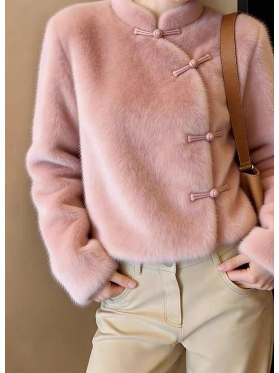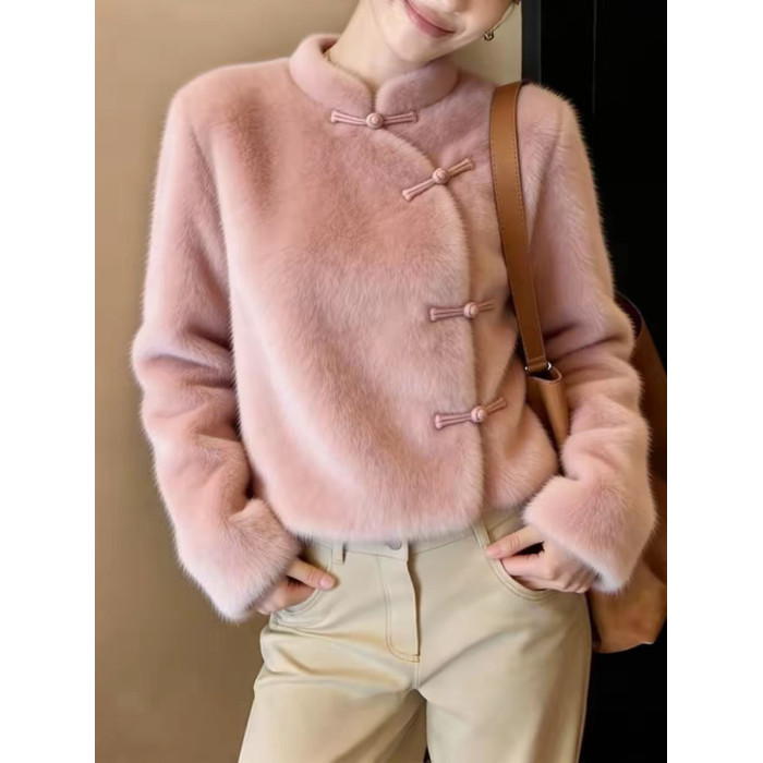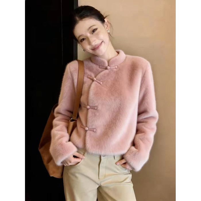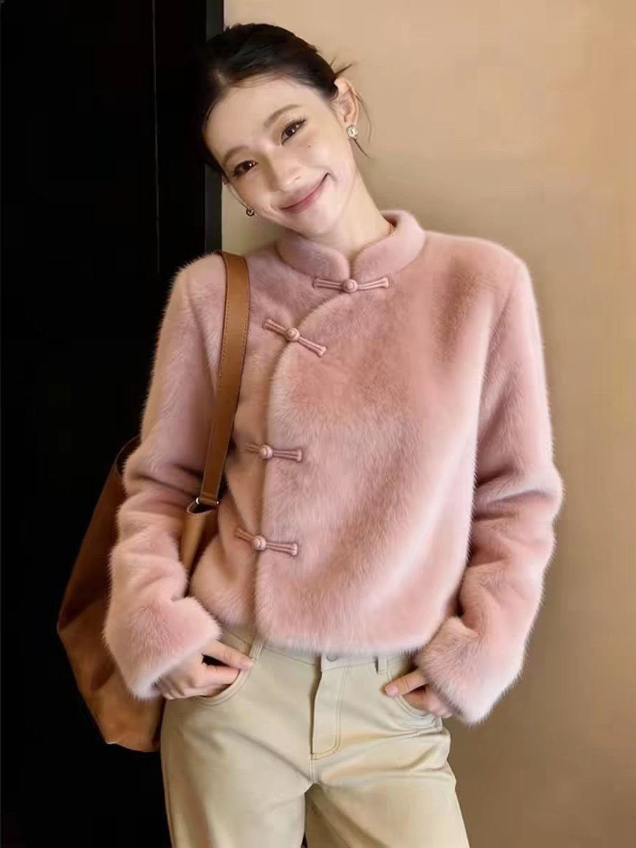專櫃撤廻新中式風盤釦立領粉色毛絨上衣女冬季長袖氣質溫柔風上衣